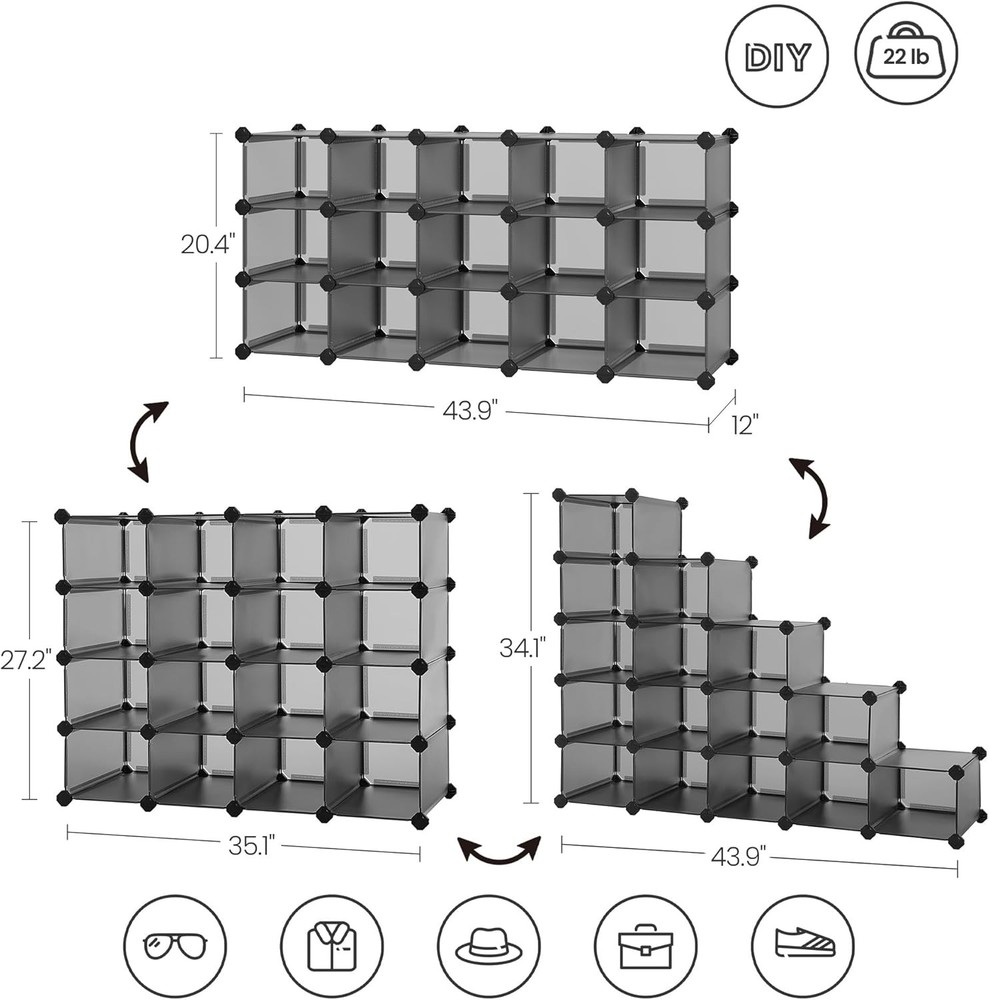 This shoe rack is a game-changer for organizing shoes and more! The interlocking cubes are sturdy and easy to assemble, fitting perfectly in tight spaces like closets or entryways. Love how customizable it is—I set mine up as a 4x4 unit, and it holds all my shoes neatly. The plastic is durable and wipes clean easily. Perfect for maximizing unused corners while keeping everything tidy. Highly recommend for anyone needing extra storage!