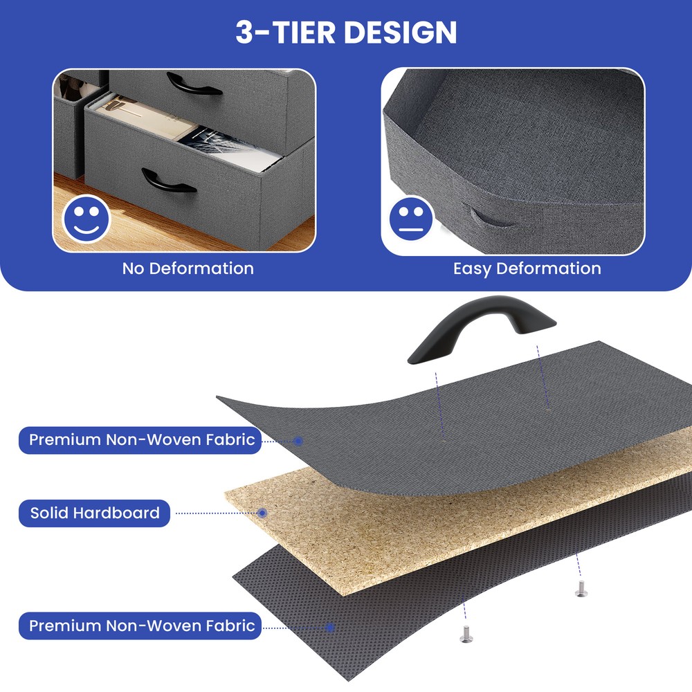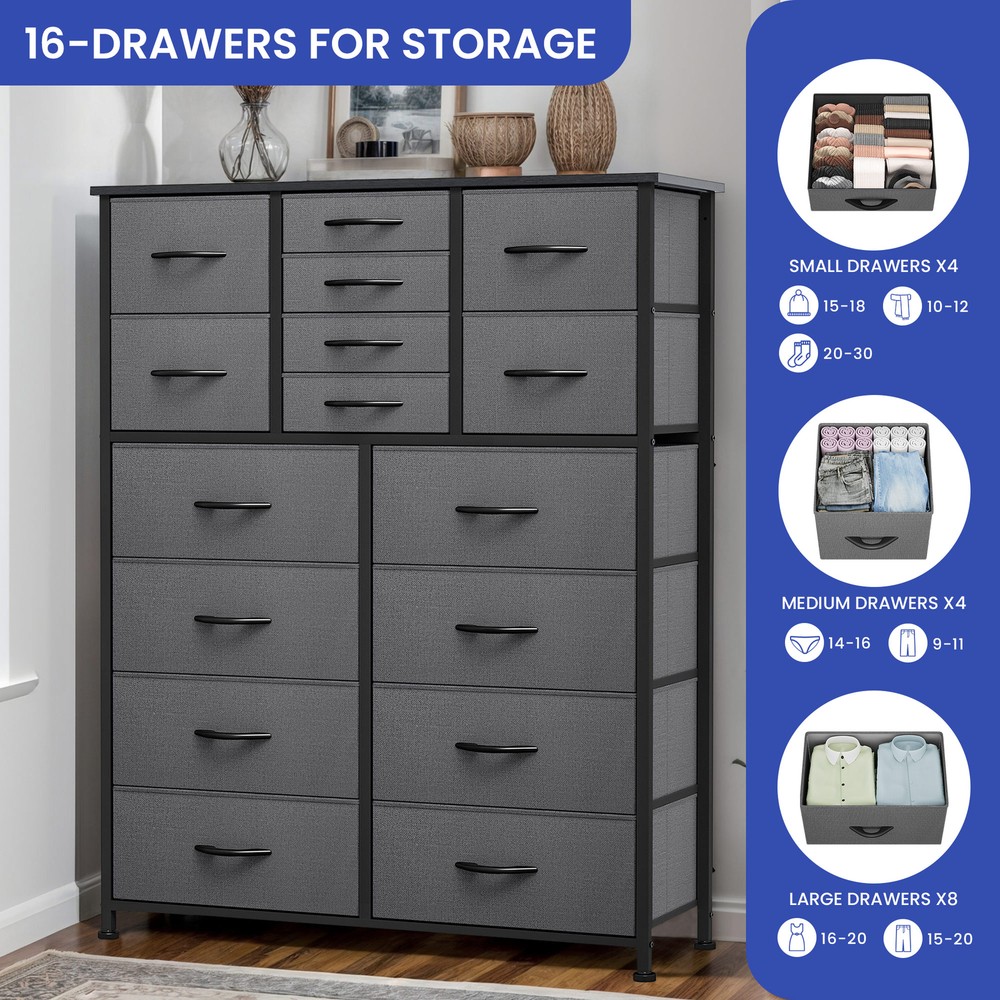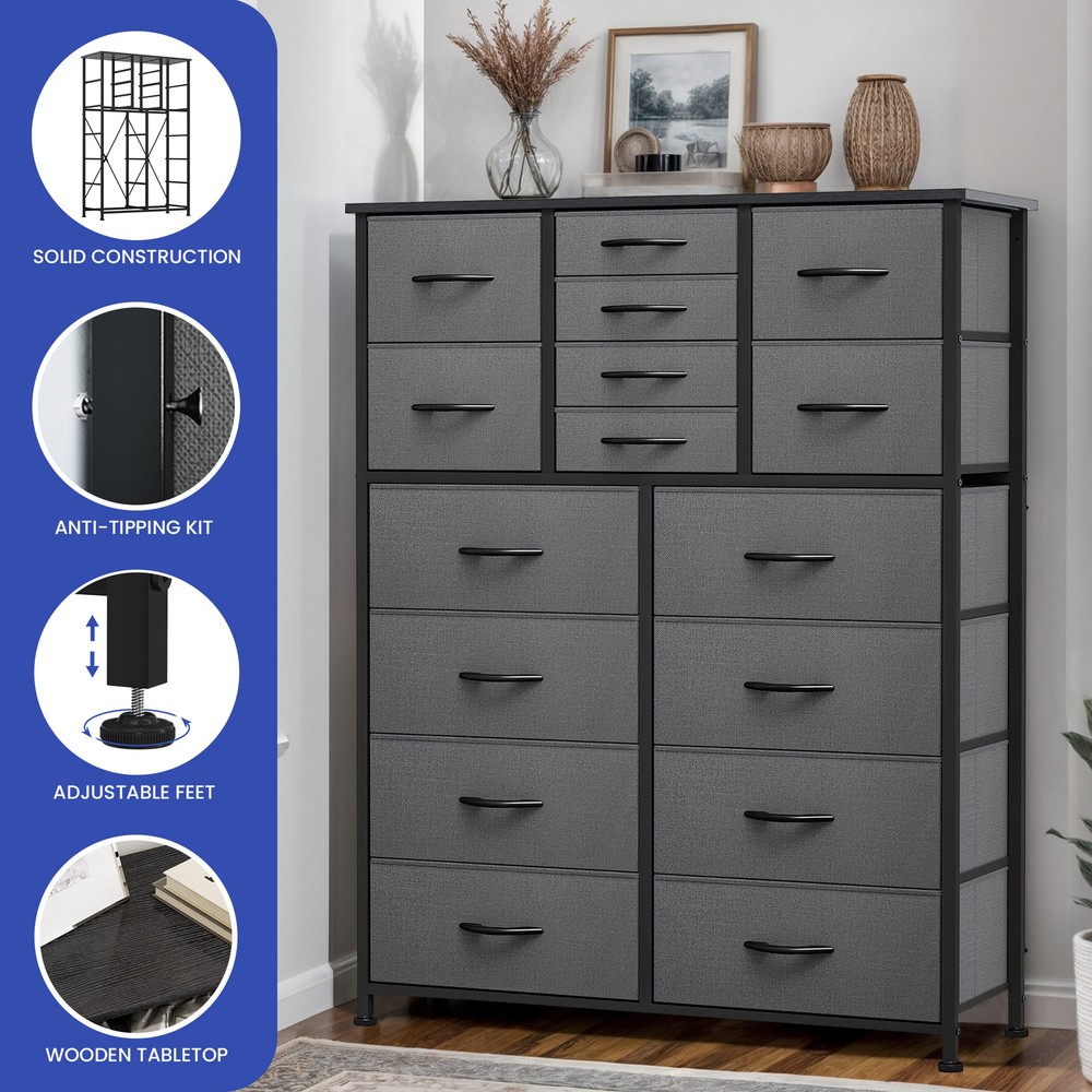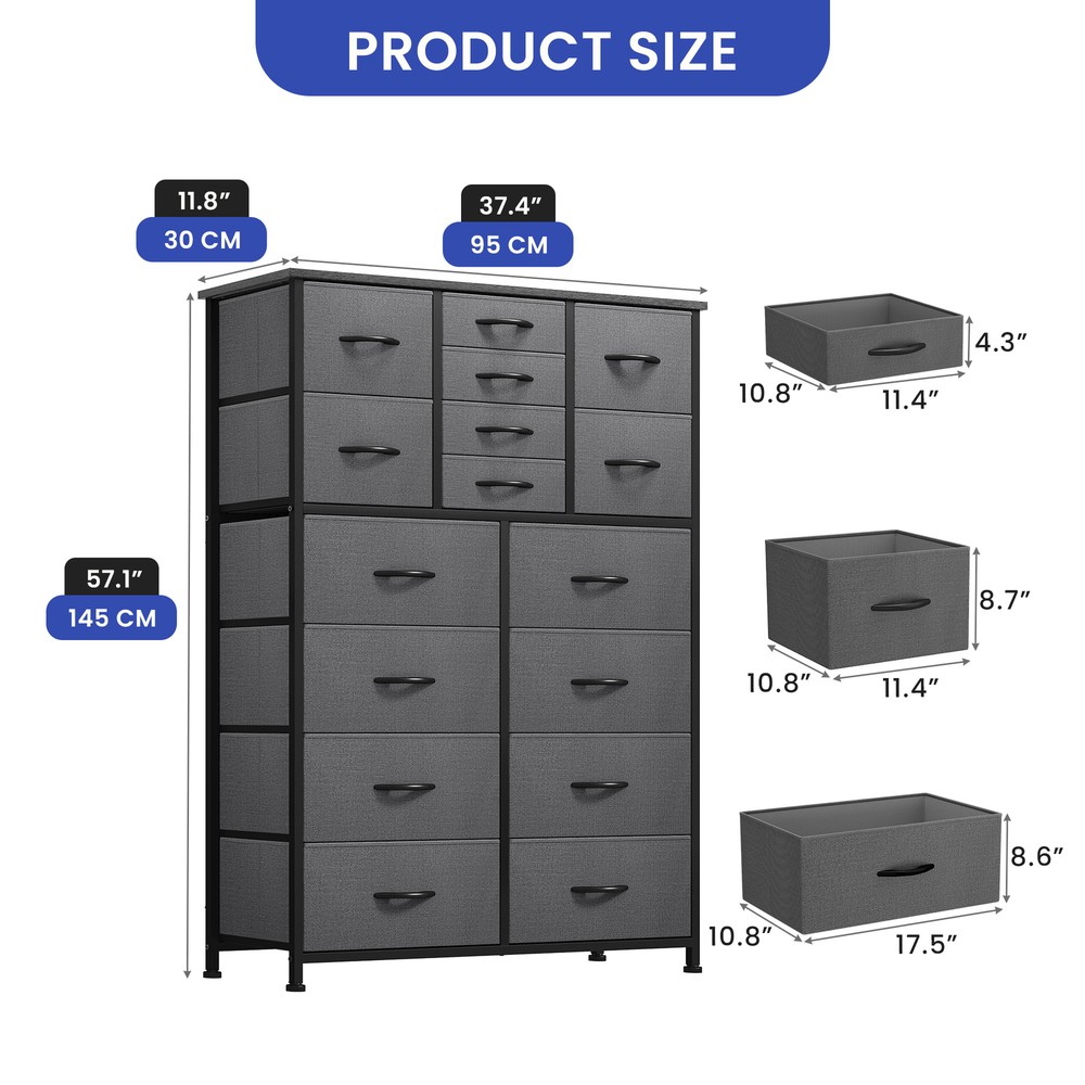 16 Drawers Dresser Tower Fabric Bedside Cabinet Gray Anti Deformation Organizer Product Description NOTE: Professional Installation would be Highly Recommended. Description: 1. Color: Light Gray 2. Material: Medium-density fiberboard (MDF), Fabric, Steel and Plastic 3. Handle Material: Plastic 4. Frame Material: Steel 5. Frame Color: Black 6. Room Type: Bedroom and Living Room 7. Main Features: Waterproof, Abrasion Resistance, Adjustable Legs, Durable Fabric Features: Sturdy Craftsmanship: - Crafted with a durable metal framework and a deluxe MDF wooden surface. - Showcases a dual X-shaped reinforcement bar at the rear for heightened steadfastness. - Adjustable plastic legs guarantee equilibrium even on irregular surfaces. Efficient Design: - Ample tabletop surface, ideal for showcasing elegant lamps or verdant foliage. - Elegant pull handles for a pleasurable grasp and effortless maneuverability. - Fashioned with a low-maintenance non-woven textile for enduring utility. Adaptable Storage Solution: - A petite 16-compartment cabinet, perfect for arranging and optimizing storage space effectively. - Functions admirably as a foyer console, nightstand, divan table, or commode. - Suited for a variety of settings ranging from boudoirs, parlors, entryways, wardrobes, workspaces, and corridors. Assorted Drawer Dimensions: - Comprises 3 distinct drawer sizes: 4 petite, 4 medium, and 8 sizable drawers. - Masterfully crafted to house an array of items such as delicates, hosiery, embellishments, apparel, linens, and beyond. Secure and Simple Assembly: - Dimensions: 37.4"L x 11.8"W x 57.1"H - Comes with clear, step-by-step instructions for hassle-free assembly. - Provides guidance on securing the cabinet to the wall, preventing tipping and ensuring added safety. Dimensions: 1. Overall Dimensions: 37.4"L x 11.8"W x 57.1"H 2. Big Drawers Dimensions: 17.5"L x 10.8"W x 8.6"H 3. Medium Drawers Dimensions: 11.4"L x 10.8"W x 4.3"H 4. Small Drawers Dimensions: 11.4"L x 10.8"W x 8.7"H 3. Capacity: 16 Drawers Package Included: 1. Dresser Storage Chest 2. Assembling Hardware Kits 3. Instruction Manual Book Shipping 1. Normally the item will be dipatched within 1 business day if payment is cleared before 12pm PST. 2. Please verify the correct shipping address in your PayPal account before making the payment. We only dispatch the item to the address that is sent to us at the time of checkout. 3. We don't ship to Hawaii, Alaska, Puerto Rico, APO/FPO/PO Boxes. 4. We don't provide local pick-up service. 5. Normally we will use USPS, UPS, FedEx & LTL to dispatch items. Payment 1. We accept PayPal and credit card. 2. We will ship to the confirmed Paypal shipping address that is provided with the payment only. Return 1. 30 days Money Back Guarantee. 2. Please contact our customer service to receive a RMA form first if want to return the item. 3. All returned items MUST in new condition with the original package. Contact If has any problem, please contact us by sending an ebay message. Our customer service will resolve the problem as soon as possible. On Dec 12, 2024 at 23:03:52 PST, seller added the following information: On Jun 10, 2025 at 05:56:29 PDT, seller added the following information: