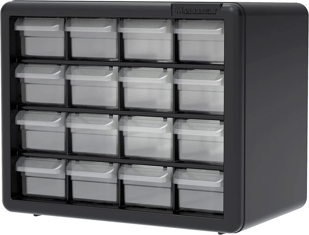 Akro-Mils 16-Drawer Plastic Drawer Storage Cabinet for Garage Organization, Beads, Makeup Organizer, Building Bricks Storage, Teacher Toolbox, 10-1/2-Inch W x 6-1/2-Inch D x 8-1/2-Inch H, 10116 Black Color: Black Size: 16 Drawer Color Black Material Plastic, Polystyrene Frame Material Plastic Brand Akro-Mils Product Dimensions 6"D x 11"W x 9"H About this item plastic HEAVY DUTY CABINET WITH 16 DRAWERS: The 16-drawer small storage cabinet is made in the U.S.A. from rugged, high-impact plastic and measures 10-1/2" W x 6-1/2" D x 8-1/2" H; Organizer drawers - 6" x 2-7/32" x 1-9/16" GARAGE ORGANIZATION: The small parts organizer is great for garages and workshops for both homeowners and businesses; The plastic storage drawers can be used as tool box, screw organizer or for battery storage; Keep nails and other small parts accessible CLASSROOM ESSENTIALS: Teachers can use the stackable storage drawers for classroom organization; Use it as a teacher toolbox, art supply storage organizer, craft storage cabinet for scrapbook supplies, and more HOME STORAGE AND ORGANIZATION: This plastic storage cabinet offers many uses around the home; It can be a lego storage organizer, craft organizer, or sticker organizer; Use it for makeup storage and organization or for medicine and first aid supplies FEATURES: Stack cabinets securely or use keyhole slots to mount for wall storage; Finger-grip drawer pulls provide easy access; Rear stop tabs prevent contents from spilling; Drawer dividers are included and molded into the back of the cabinet (Item does not ship to Miami&Doral, FL), have any problem please contact us !