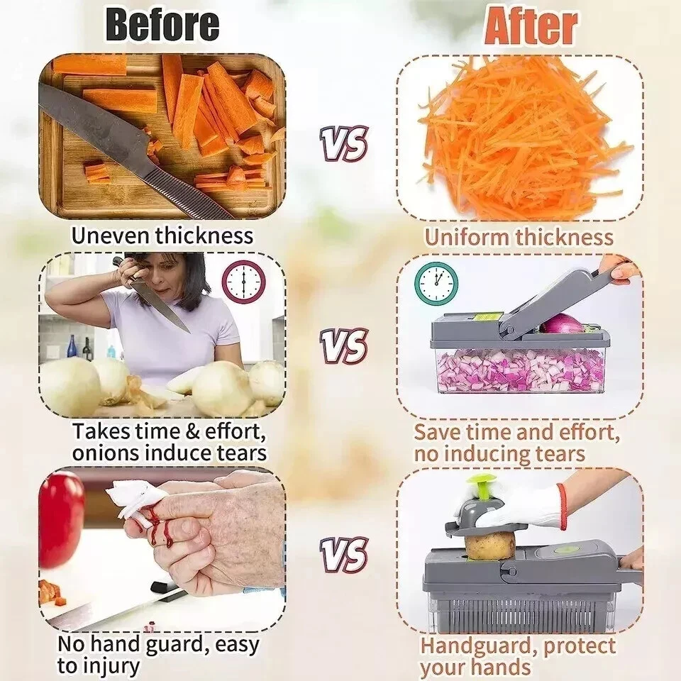 The 16-In-1 Vegetable Fruit Chopper Cutter is a versatile kitchen tool set that includes a variety of items such as a cleaning brush, slicer, vegetable peeler, salad cutter, and more. Made of stainless steel and plastic, this fruit cutter is designed to be multi-functional, manual, and easy to clean. It offers adjustable thickness options for slicing vegetables and fruits with ease. This set is ideal for cutting and preparing a variety of vegetables and fruits for cooking or snacking purposes. Perfect for any kitchen, this chopper cutter offers efficiency and convenience for food preparation tasks.
