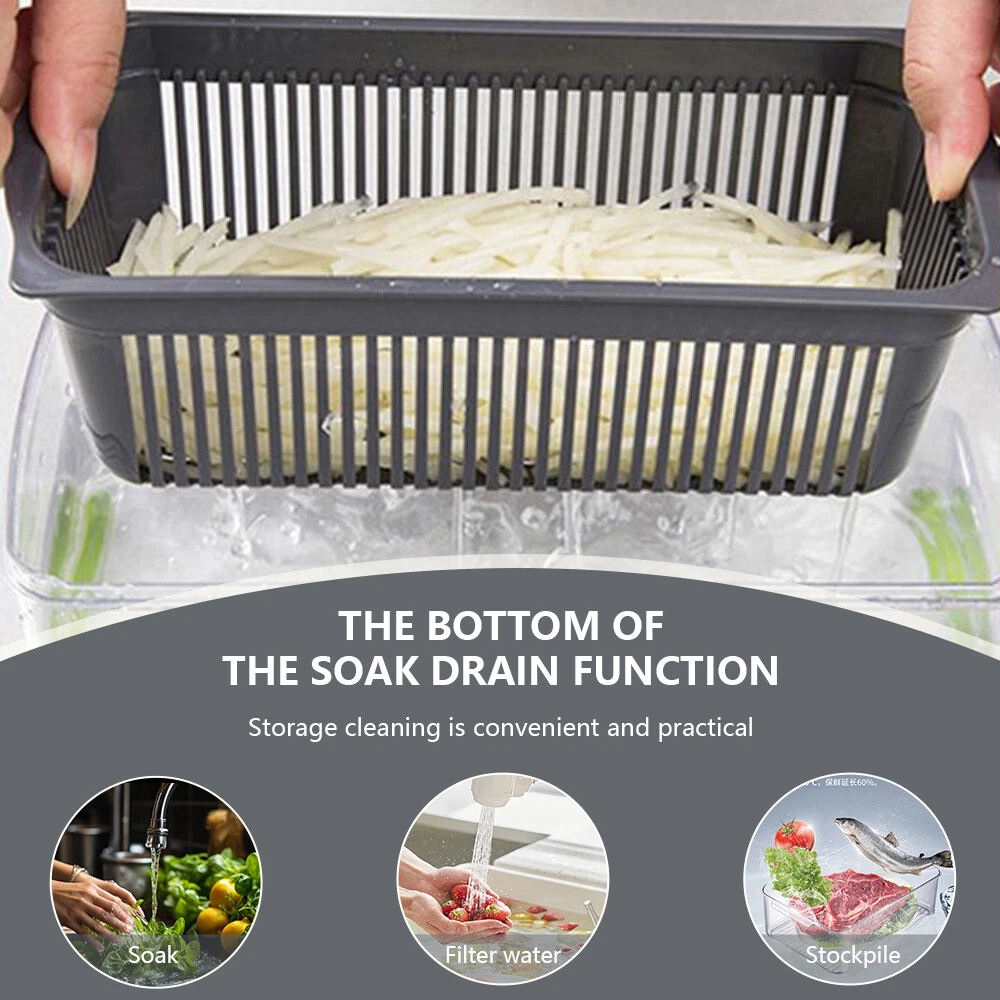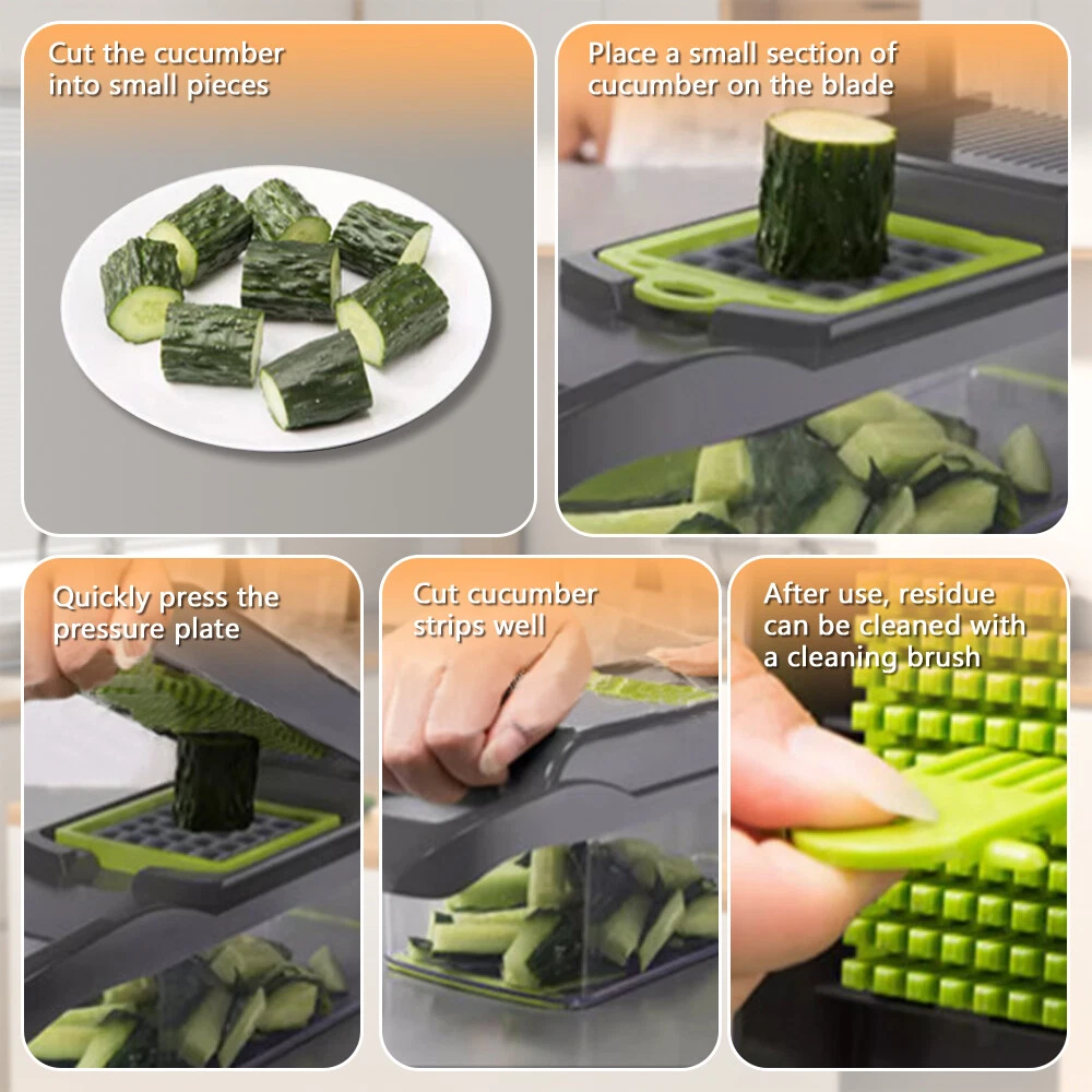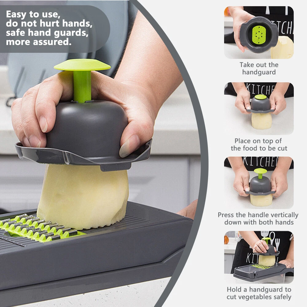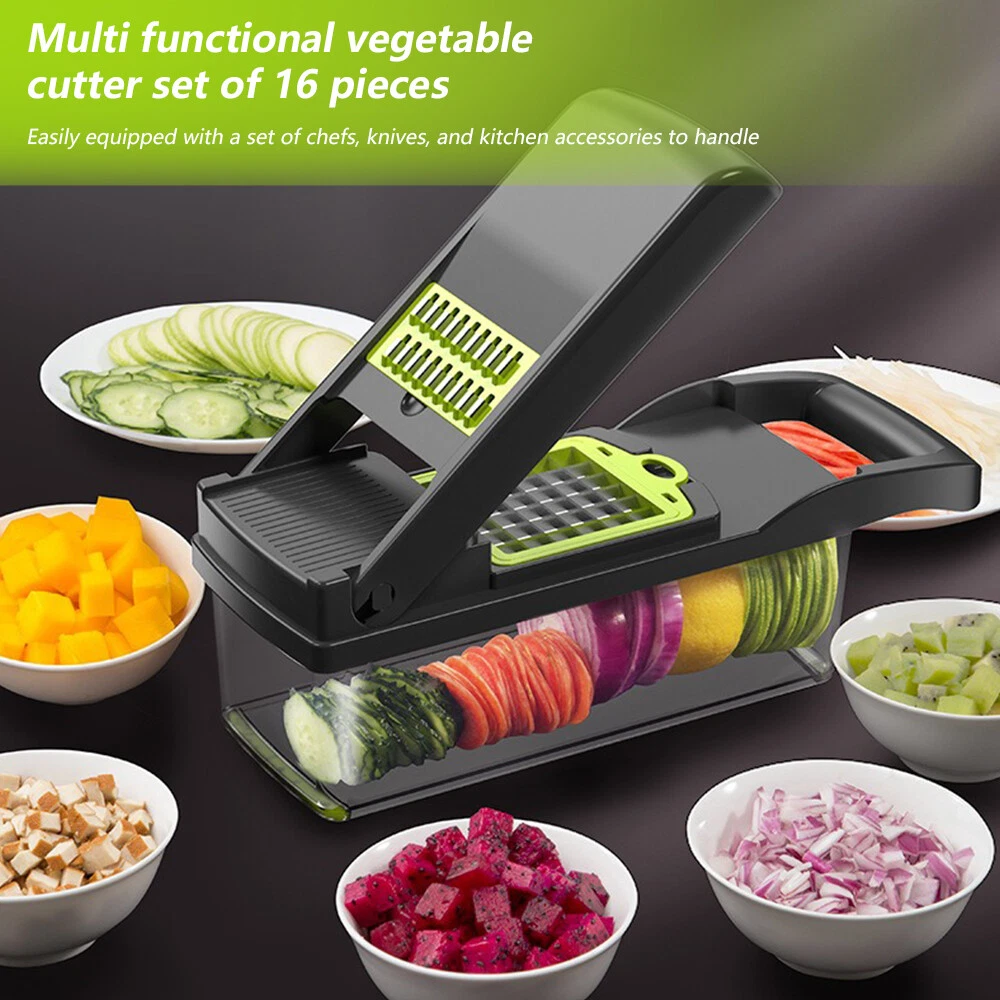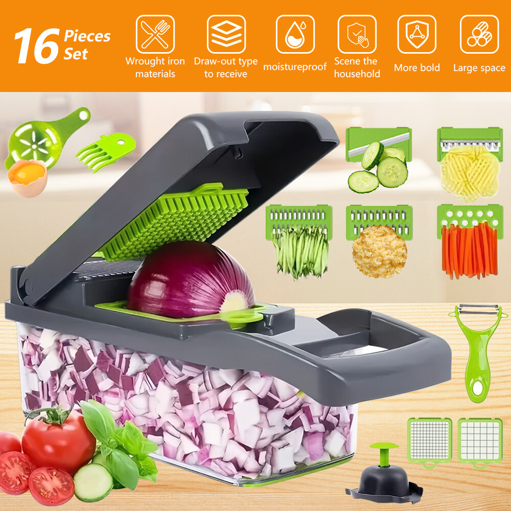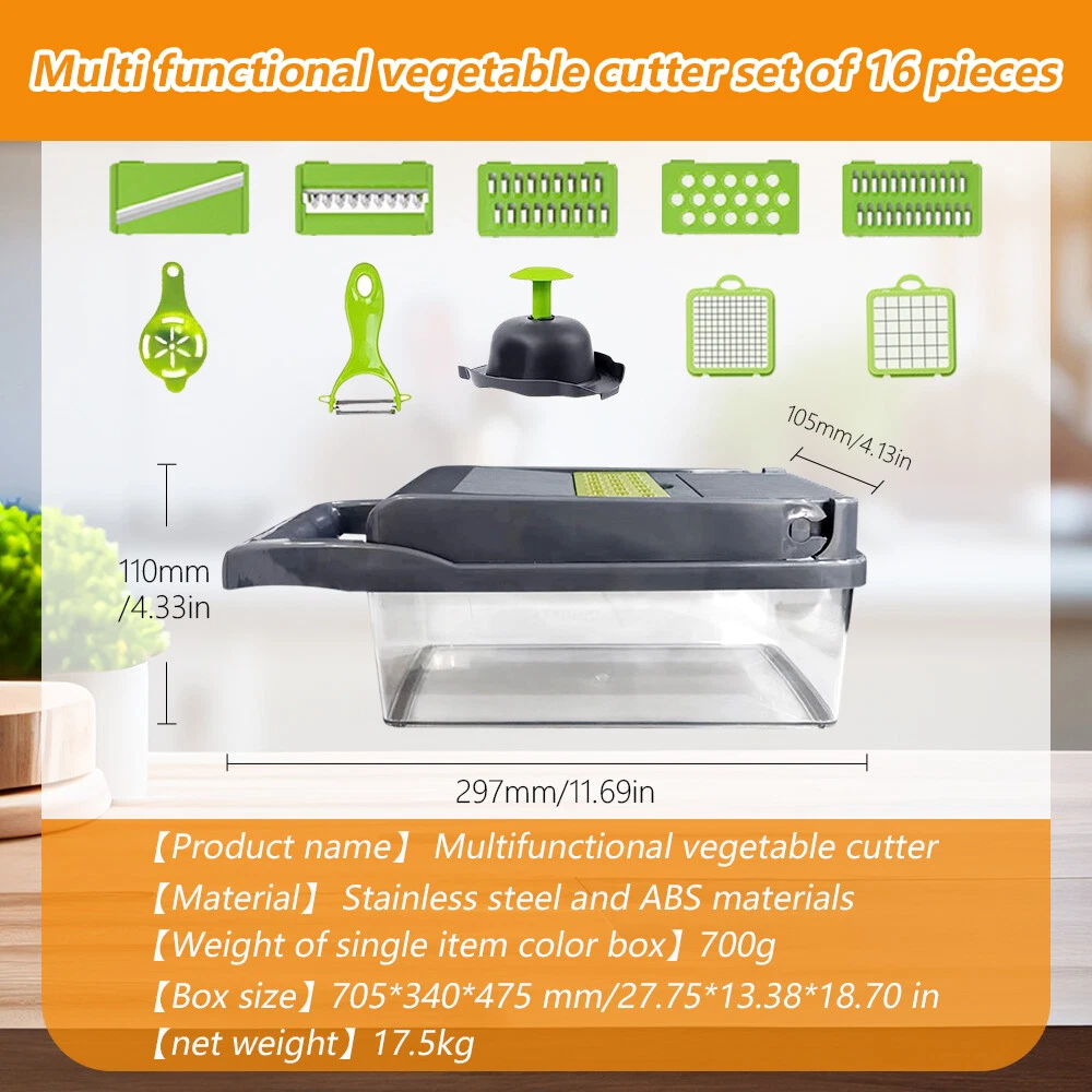 Feature: 1 6 in 1 Multifunctional vegetable chopper allows you can get big or small dices, thick or thin slice, shreds or julienne. Easy to chop onion, mushroom, cucumber, carrot, potato, ginger, garlic, cheese. Easy disassemble and installation. Our vegetable chopper is made of high quality stainless steel, BPA-free professional grade, heavy duty reinforced food grade ABS for superior break resistance. With grip handle enhances leverage while the non-skid rubber strip ensures stability during use. Safe and easy to slice, dice, chop and cut fruits and vegetables. Builtin chop lid lets you cut foods directly into the 1.2L collection tray without messing up knife and cutting board. Our food chopper and dicer can be completely disassembled for easy cleaning (Note: Hand wash ONLY, can not be used in dishwasher) Multi-Functional interchangeable blades, through which you can get big or small , thick or thin slice, shreds or julienne. Easily handle vegetables such as onions, garlic, carrots, potatoes, cucumbers and various fruits. Premium Quality, Made of stainless steel and ABS material discs. No bending and Rusting. Premium break resistance, rubberized non-skid base ensure stability and safety. Safe To Use, The unique non-slip handle design makes cutting more effortless and prevent hand injuries. The bottom of the vegetable cutter is designed with non-slip silicone feet, which can greatly increase the stability when cutting vegetables. Saving Time, Vegetable Chopper can help you shorten Prep time comparing with traditional blades chopping. One-key Cleaning, After cutting, press the PUSH button to remove residues on the cutting board quickly. The drain basket can not only store things but also quickly clean the fruits and vegetables in it. Package Included: 16in1 Vegetable Chopper Note: Due to the difference between different monitors, the pictures may not reflect the actual color of the item. Compare the detail sizes with yours, please allow 1-3 cm error, due to manual measurement. Please leaving a message before you give the bad feedback, if the products have some problems