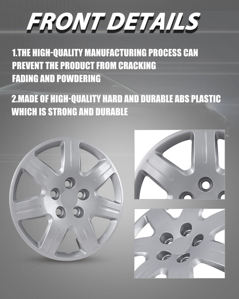 Store Categories Other Car Refrigerator Front Bumper Rear Bumper Fender Flares Inner Fenders Side Steps Running Board A-Pillar Light Mount Brackets Headlights Taillights Fog Lights LED Headlights LED Taillights LED Fog Lights Jeep Chevrolet Ford Toyota Dodge GMC 16-Inch 4 Silver Hubcaps for 2006-2011 Honda Civic R16 Wheel Rims Covers Bolt On Wheel Covers Features ✴ PERFECT FIT: This wheel hub cap is specifically designed to perfectly fit for 16-inch wheels, ensuring a seamless match and enhanced aesthetics. It complements the overall design of the vehicle, elevating its visual appeal. ✴ HIGH-QUALITY MATERIAL: Constructed from high-quality materials, this wheel hub cap guarantees durability and longevity. It withstands various road conditions and environmental factors encountered during daily driving, maintaining its pristine condition. ✴ EASY INSTALLATION: Installing this wheel hub cap is a breeze and requires no specialized tools or modifications. It comes with a user-friendly system, allowing for a hassle-free installation process by following the provided instructions. ✴ PROTECTIVE FUNCTION: Besides its aesthetic appeal, this wheel hub cap serves as a protective barrier for the wheels. It prevents scratches and potential damage caused by stones, debris, or other objects, safeguarding the wheel's surface. ✴ AFTER-SALES SERVICE: If There Is a Loss of Product Parts, or Any Parts of The Problem, We Can Provide After-Sales Service, Please Contact Us on The Order Page. Fitment: ✴ 2006-2011 Honda Civic Wheel Covers Specification ✴ Type: Hub caps ✴ Number in Pack: 4 ✴ Color: Silver Lacquer ✴ Material: ABS ✴ Compatible Wheel Diameter: 16 in ✴ Finish: Glossy ✴ Installation Type: Bolt On Wheel Covers Package ✴ 1 Set of 4 Hub caps and 4 retention rings Payment Delivery details Terms of sales About us Contact us Payment We accept PayPal, credit card , Apple Pay & Google Pay etc. Delivery details All items will be shipped within 1-3 business days after payment received, we will try our best to ship out as soon as we can, hope for your understanding. Please double confirm your address and contact information, which will help the delivery faster and more accurately. Note :buyers who purchase international products need to pay import tariffs!!! Terms of sales Professional installation is highly recommended. Any problem of the item please feel free to contact us first , please D o Not leave negative feedback before that, or simply return it within 60 Days in original condition. We will resolve it for you ASAP. About us Any questions please do not hesitate to contact us directly by eBay message . We will reply you within 24 hours asap, thanks for your understanding. Contact us Should you have any problem or require any further information please feel free to contact us . If you are satisfied with our product and service, please kindly leave us a positive feedback. Popular Categories