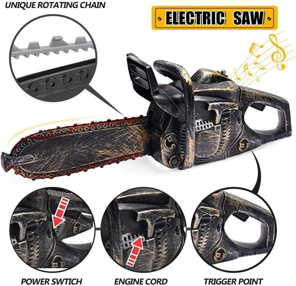 Realistic Chainsaw Design: This electric chainsaw features an eerily authentic rusty and bloody blade with chain, perfect for creating spine-chilling Halloween moments and terrifying unsuspecting guestsV Motion & Sound Effects: Enhance the horror with frightening chainsaw sounds and a rotating chain that adds a touch of realism to your haunted house or costume accessory, ensuring a truly memorable experience Versatile Halloween Prop: Instantly transform any costume or haunted house setting with this chilling chainsaw accessory, adding a gruesome touch to the festivities and making it an essential addition to any Halloween event Batteries Included: No need to hunt for batteries—this menacing prop comes with three AA batteries included, allowing the terror to begin right out of the box for immediate scaring fun Sized for Children: Measuring 16" x 6" x 4", this chainsaw prop is designed specifically for kids ages three to six, ensuring a spooky yet safe Halloween experience that will make them the center of attention Product Description Step up your Halloween game and give your little ones the ultimate spooky experience with our Electric Motorized Chainsaw! Designed to look like a rusty, bloody blade with a rotating chain, this chainsaw prop is perfect for adding a gruesome touch to any costume or haunted house. Sized specifically for children ages 3-6, this realistic chainsaw prop is made of durable plastic and measures 16 inches long, 6 inches tall, and 4 inches wide. Made of lightweight and safe materials, it's easy for kids to handle and play with, ensuring a fun yet secure experience. Incorporate this creepy chainsaw into your Halloween decorations, and you'll have your guests on edge with its authentic appearance and chilling sound effects. Amp up the scare factor at your next party or haunted house event, and watch as your guests marvel at the realistic design and horrifying atmosphere. Don't settle for ordinary Halloween props and decorations - make this year unforgettable with our Electric Motorized Chai Chainsaw Accessory for Halloween Make Halloween a lot more fun with this eerie Chainsaw with Rusty Finish Prop. Simply pull the handle up to initiate the chainsaw and press the trigger to rotate the blade, creating an authentic and terrifying atmosphere. This chainsaw prop not only looks realistic, but it also comes with motion and sound effects, giving your haunted house or costume accessory a spine-chilling touch. No need to worry about finding batteries, as this electric chainsaw prop comes with 3 AA batteries included, so the terror begins right out of the box. Get ready to make Halloween a memorable experience with this versatile chainsaw prop. Whether you're dressing up for a party or creating a haunted house, this chainsaw is the perfect addition to any Halloween event. Transform your child's costume into something truly terrifying with this unique accessory. Ideal for a variety of costumes, from classic horror movie characters to creative and spooky outfits, this chainsaw prop will be the center of attention.
