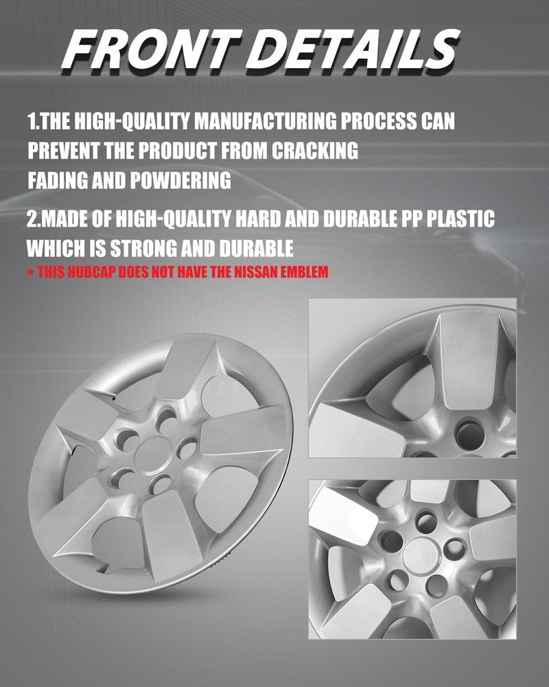Store Categories Other Car Refrigerator Front Bumper Rear Bumper Fender Flares Inner Fenders Side Steps Running Board A-Pillar Light Mount Brackets Headlights Taillights Fog Lights LED Headlights LED Taillights LED Fog Lights Jeep Chevrolet Ford Toyota Dodge GMC Set of 4 Hubcaps: https://www.ebay.com/itm/405641118800 Wheel Covers Features ✴ PERFECT FIT: This wheel hub cap is specifically designed to perfectly fit for 16-inch wheels, ensuring a seamless match and enhanced aesthetics. It complements the overall design of the vehicle, elevating its visual appeal. ✴ HIGH-QUALITY MATERIAL: Constructed from high-quality materials, this wheel hub cap guarantees durability and longevity. It withstands various road conditions and environmental factors encountered during daily driving, maintaining its pristine condition. ✴ EASY INSTALLATION: Installing this wheel hub cap is a breeze and requires no specialized tools or modifications. It comes with a user-friendly system, allowing for a hassle-free installation process by following the provided instructions. ✴ PROTECTIVE FUNCTION: Besides its aesthetic appeal, this wheel hub cap serves as a protective barrier for the wheels. It prevents scratches and potential damage caused by stones, debris, or other objects, safeguarding the wheel's surface. ✴ AFTER-SALES SERVICE: If There Is a Loss of Product Parts, or Any Parts of The Problem, We Can Provide After-Sales Service, Please Contact Us on The Order Page. Wheel Covers Specification ✴ Type: Hub caps ✴ Number in Pack: 1 ✴ Color: Silver Lacquer ✴ Material: ABS ✴ Compatible Wheel Diameter: 16 in ✴ Finish: Glossy ✴ Installation Type: Snap-On ✴ Model: ‎For 2008-2015 Nissan Rogue/For 2008-2015 Nissan Rogue Select Wheel Covers Package ✴ 1 Hub cap and 1 retention ring Payment Delivery details Terms of sales About us Contact us Payment We accept PayPal, credit card , Apple Pay & Google Pay etc. Delivery details All items will be shipped within 1-3 business days after payment received, we will try our best to ship out as soon as we can, hope for your understanding. Please double confirm your address and contact information, which will help the delivery faster and more accurately. Note :buyers who purchase international products need to pay import tariffs!!! Terms of sales Professional installation is highly recommended. Any problem of the item please feel free to contact us first , please D o Not leave negative feedback before that, or simply return it within 60 Days in original condition. We will resolve it for you ASAP. About us Any questions please do not hesitate to contact us directly by eBay message . We will reply you within 24 hours asap, thanks for your understanding. Contact us Should you have any problem or require any further information please feel free to contact us . If you are satisfied with our product and service, please kindly leave us a positive feedback. Popular Categories On Apr 17, 2025 at 20:31:13 PDT, seller added the following information: