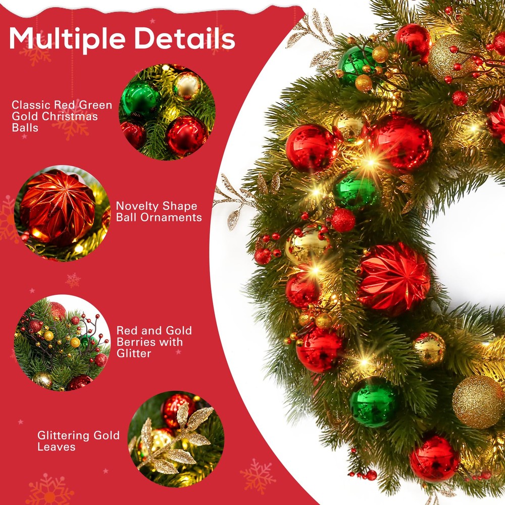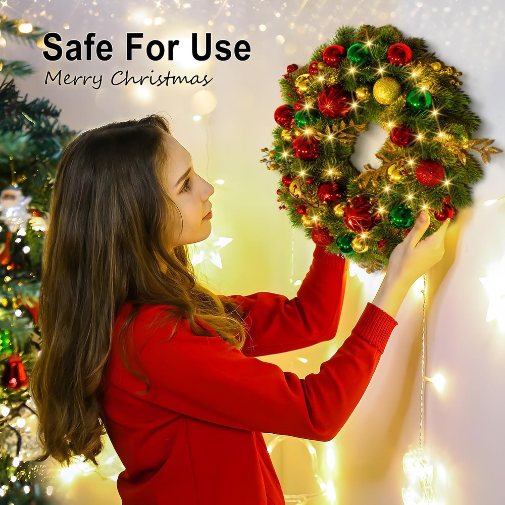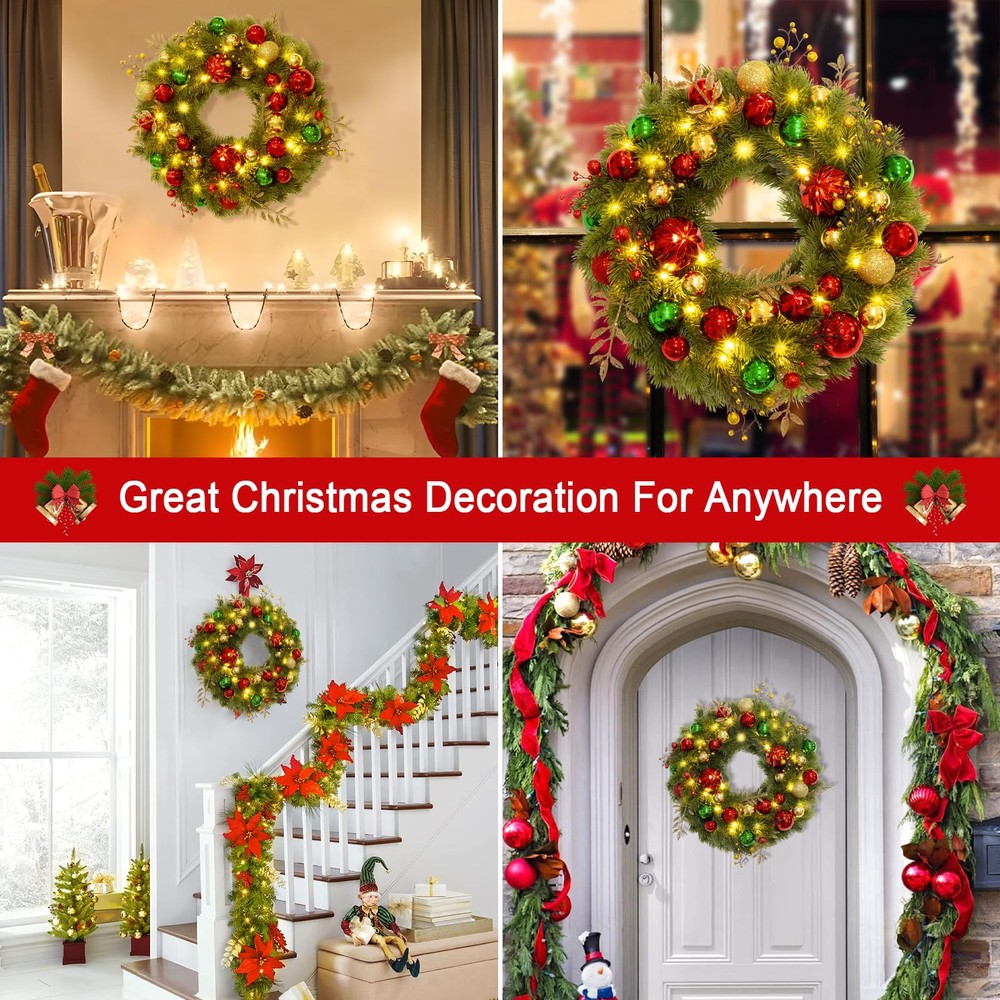 Luxury Christmas Theme Decoration Wreath: Infuse your home with festive charm using our stunning wreath, featuring a rich blend of classic red, green, and gold. Adorned with dazzling ball ornaments, unique berry clusters, and shimmering golden leaves, this Xmas wreath is the perfect statement piece for your front door or mantel, making the Christmas special. artificial wreath brings a luxurious and glamorous holiday spirit to your home throughout the fall and winter seasons Lifelike Pine Needle Appearance: front door Christmas wreath features a high-quality PE material greenery spruce chassis that perfectly mimics the tone, shape, and texture of real spruce, ensuring the wreath remains stable and is not easily deformed. Uniquely designed and handcrafted, our outdoor Christmas wreath features colorfast leaves and vibrant Christmas balls that are durable and require no additional maintenance, ensuring you can enjoy its charm year after year Battery Powered Holiday Wreath Lights: Illuminate your home with our pre-lit wreath featuring 40 warm white LED lights, creating a welcoming and festive ambiance. It requires 3 AA batteries (not included). The combination of unique glittery Xmas balls and warm lights makes this Christmas decorations wreath shine brightly at night, creating a mesmerizing atmosphere that is bound to impress your family and friends 8 Flashing Modes with Timer: Our lighted wreath Christmas dazzles with 8 enchanting light modes to match your mood and ambiance. Choose from Combination, In Wave, Sequential, Slow Glow, Chasing/Flash, Slow Fade, Twinkle/Flash, and Steady On for a mesmerizing display. Once you activate the lights, the built-in timer begins, illuminating your wreath for 6 hours before turning off for 18 hours. Experience a seamless cycle of holiday magic that will make this Christmas truly unforgettable Wonderful Outside Indoor Holiday Decoration: The eagerly awaited Christmas and winter season is just around the corner! Hang this beautiful and striking Christmas wreath on your doors, windows, walls, or fireplace to delight your neighbors and visitors alike. Perfect as a Christmas, Thanksgiving, or housewarming gift for family, friends, kids, and neighbors. Our vibrant Christmas wreath is sure to brighten up the cold winter nights, bringing warmth and festive joy to every home Please Note: To showcase the wreath at its best, kindly remove it from the box and carefully arrange and fluff it to achieve a fuller and more lifelike appearance.