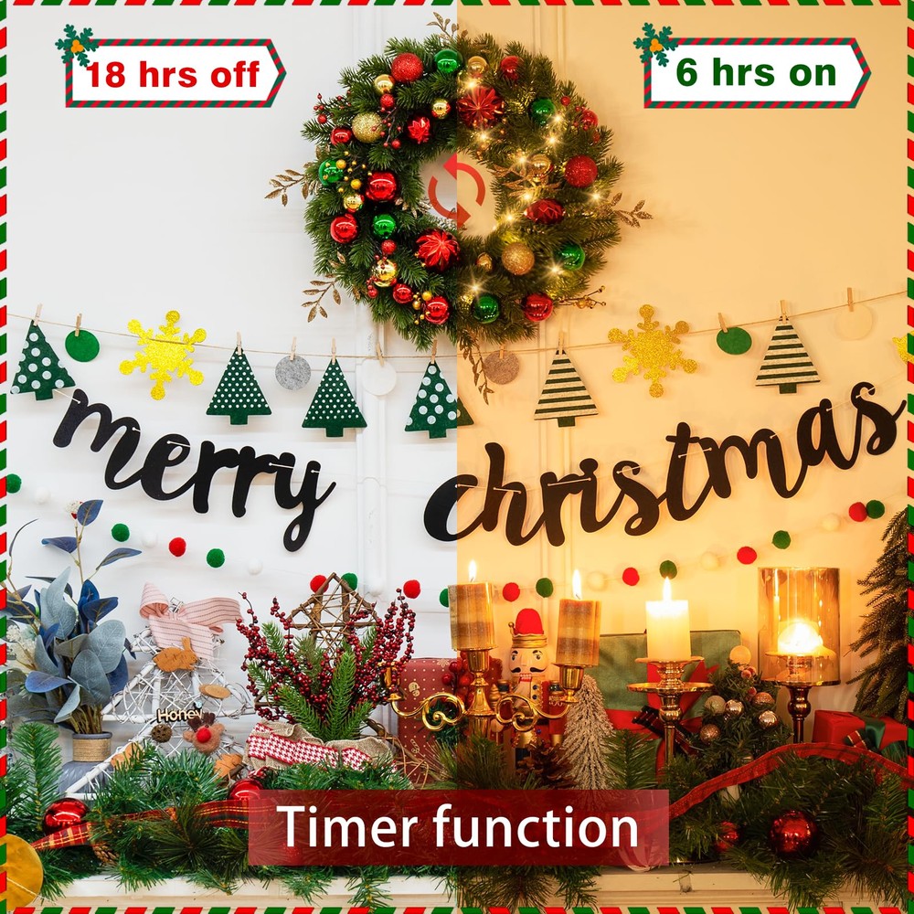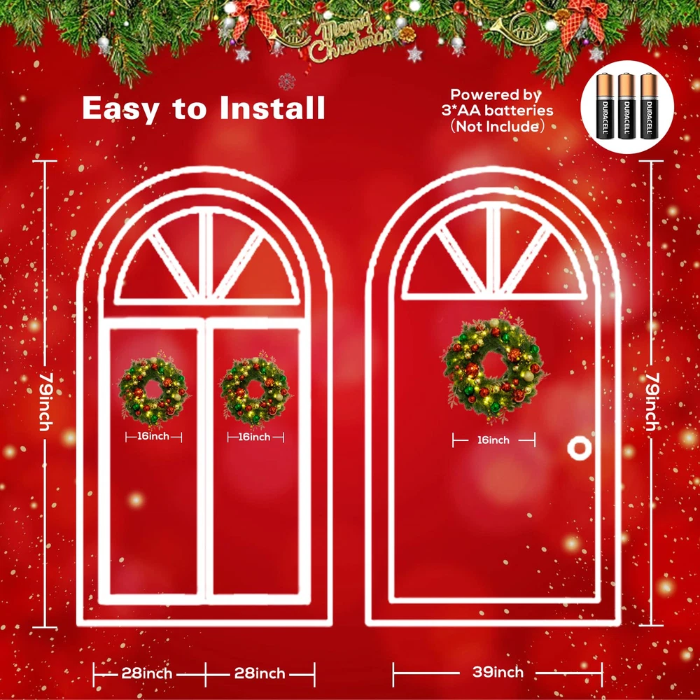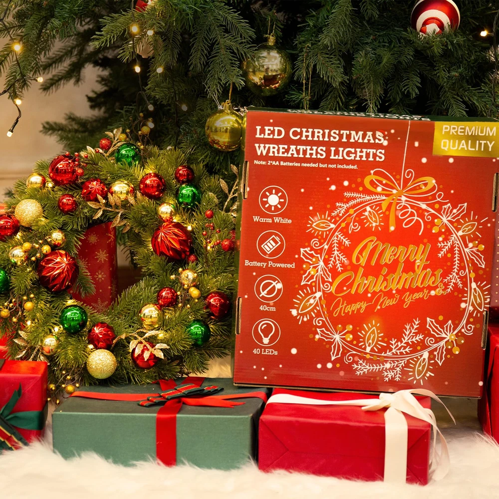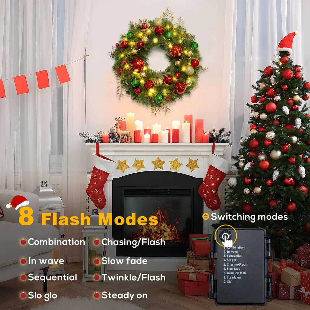 Luxury Christmas Theme Decoration Wreath: Infuse your home with festive charm using our stunning wreath, featuring a rich blend of classic red, green, and gold. Adorned with dazzling ball ornaments, unique berry clusters, and shimmering golden leaves, this Xmas wreath is the perfect statement piece for your front door or mantel, making the Christmas special. artificial wreath brings a luxurious and glamorous holiday spirit to your home throughout the fall and winter seasons Lifelike Pine Needle Appearance: front door Christmas wreath features a high-quality PE material greenery spruce chassis that perfectly mimics the tone, shape, and texture of real spruce, ensuring the wreath remains stable and is not easily deformed. Uniquely designed and handcrafted, our outdoor Christmas wreath features colorfast leaves and vibrant Christmas balls that are durable and require no additional maintenance, ensuring you can enjoy its charm year after year Battery Powered Holiday Wreath Lights: Illuminate your home with our pre-lit wreath featuring 40 warm white LED lights, creating a welcoming and festive ambiance. It requires 3 AA batteries (not included). The combination of unique glittery Xmas balls and warm lights makes this Christmas decorations wreath shine brightly at night, creating a mesmerizing atmosphere that is bound to impress your family and friends 8 Flashing Modes with Timer: Our lighted wreath Christmas dazzles with 8 enchanting light modes to match your mood and ambiance. Choose from Combination, In Wave, Sequential, Slow Glow, Chasing/Flash, Slow Fade, Twinkle/Flash, and Steady On for a mesmerizing display. Once you activate the lights, the built-in timer begins, illuminating your wreath for 6 hours before turning off for 18 hours. Experience a seamless cycle of holiday magic that will make this Christmas truly unforgettable Wonderful Outside Indoor Holiday Decoration: The eagerly awaited Christmas and winter season is just around the corner! Hang this beautiful and striking Christmas wreath on your doors, windows, walls, or fireplace to delight your neighbors and visitors alike. Perfect as a Christmas, Thanksgiving, or housewarming gift for family, friends, kids, and neighbors. Our vibrant Christmas wreath is sure to brighten up the cold winter nights, bringing warmth and festive joy to every home Please Note: To showcase the wreath at its best, kindly remove it from the box and carefully arrange and fluff it to achieve a fuller and more lifelike appearance.