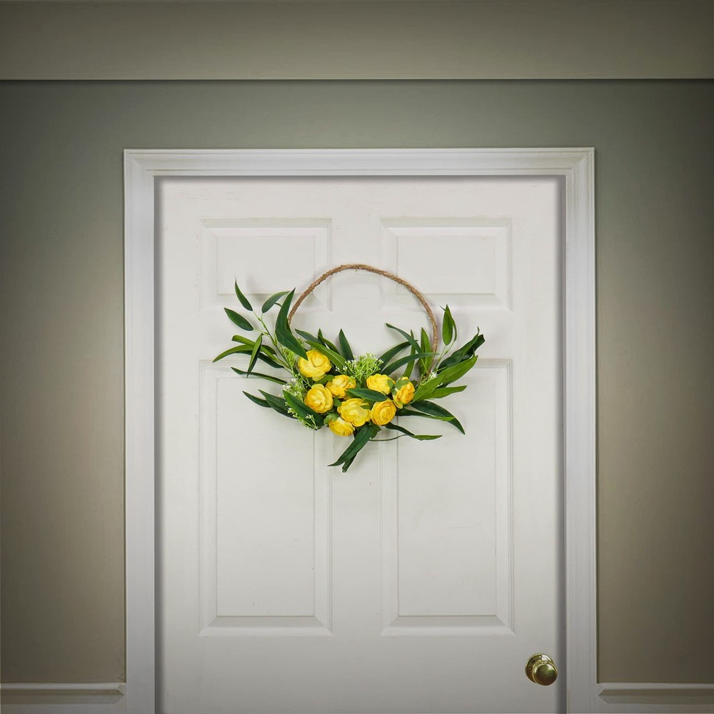 LIFELIKE ARTIFICIAL FLORAL WREATH: This summer wreath features vibrant buttercup blooms, delicate baby’s breath, and flowing green stems. This floral home décor beautifully represents the colors and textures of spring, creating a cheerful and welcoming atmosphere for any room or front door. VERSATILE HOME DÉCOR: This floral wreath is ideal for hanging on doors or windows as part of your spring or summer décor. It’s perfect for both entryways and living rooms, adding a fresh, floral touch to your home. This floral door wreath can also be hung in covered outdoor locations, bringing a festive touch to your porch, patio, or balcony. It’s also a charming addition to mantels, dining tables, or as a centerpiece for holiday-themed gatherings, enhancing any room with its vibrant, spring-inspired design. QUALITY MATERIALS: Crafted from high-quality materials, this wreath features a hoop ring base, designed to maintain its beauty and integrity for years to come. The durable construction ensures it can withstand seasonal use, providing long-lasting, vibrant décor that retains its charm even after multiple springs and summers. Whether displayed indoors or in covered outdoor areas, this wreath is built to stand the test of time with minimal maintenance. EASY TO MAINTAIN: Simply take this summer décor out of the box and shape it to your desired look. No need for watering or pruning—this wreath requires minimal upkeep. Simply dust it once a month to keep it looking vibrant, fresh, and full of seasonal charm. FAUX FLORAL WREATH DIMENSIONS: 4”L x 16”W x 16”H, 1 lb. Perfect for both indoor and covered outdoor use, this wreath is a seasonal must-have for your home’s décor.
