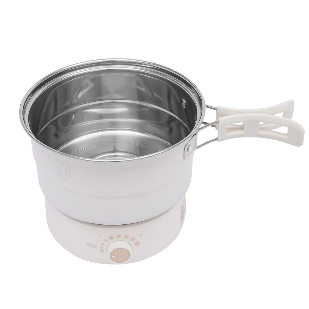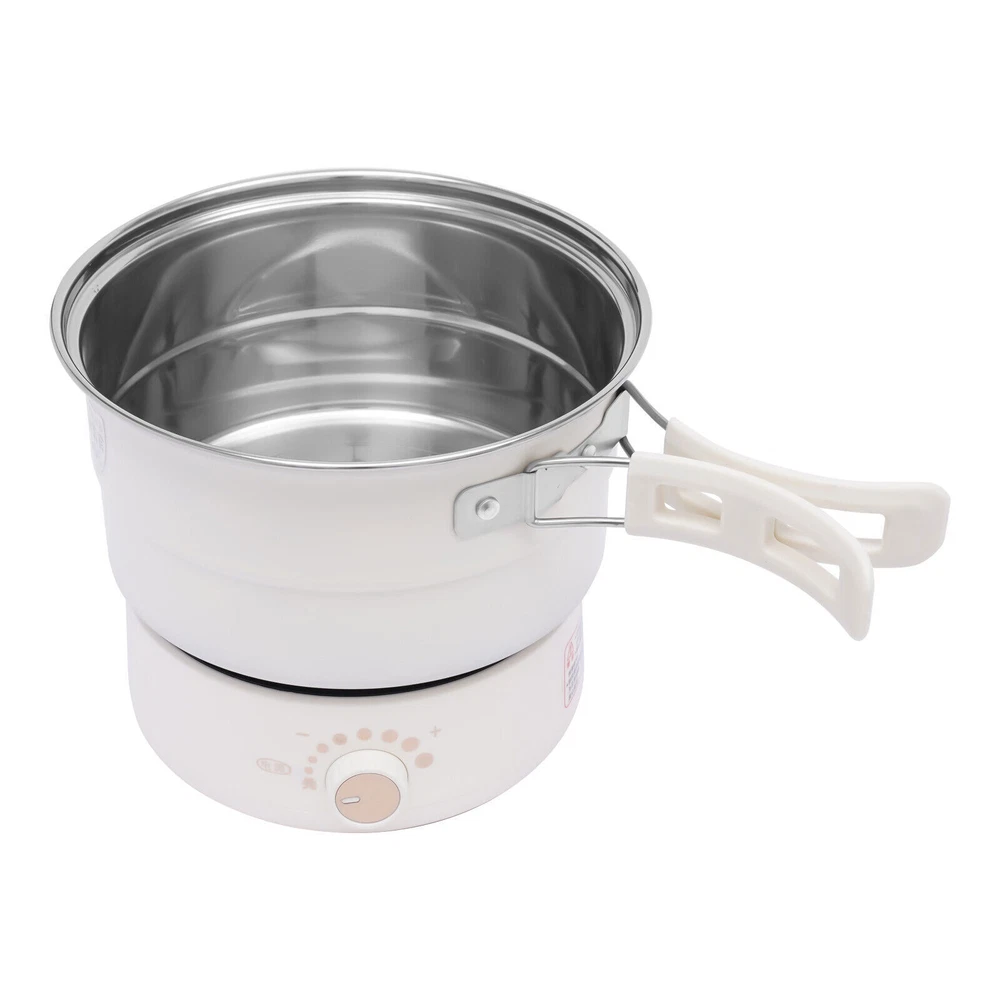 1.6L Mini Hot Pot Electric Cooker Multifunction Split 110V w/Steamer 500W Portable Electric Hot Pot with Foldable Handles, Non-stick Frying Pan, Mini Hot Pot, Multi-Functional Ramen Noodle Cooker for Pasta, Oatmeal, Soup, Steak with Power Adjustment Description Delicious food such as a sunny-side-up omelet or a tender steak is always a source of joy. Even if you are always alone, you need to take your meals seriously. This portable electric hot pot has a split design for easy storage and portability. It is also equipped with both a frying pot and a soup pot, with the multifunction of steaming, boiling, frying, and stir-frying. It can accompany you with good food to spend those times just for you alone. Key Features Multi-position Heat Adjustment: The portable electric hot pot has an 8-level temperature control function. You just need to turn the knob to set the appropriate temperature for different foods and enjoy various delicacies. High Safety: The sauce pot, frying pot, and lid are equipped with anti-scald handles, so you don't have to worry about burning your hands during cooking. In addition, it has an over-temperature dry burn automatic power-off device, which can well protect your safety when using the appliance. 360° Full Plate Heating: This product adopts a three-dimensional high-temperature heat transfer design, which makes the ingredients more evenly heated. It performs better especially in deep-fried cooking, such as frying steaks, salmon, and other meats, which can make the food look more tempting. Convenient to Clean: The frying pot features a dimpled pattern that is less likely to stick to the pot. And the inner liner of the product is coated, which makes it easier for you to complete the cleaning task. Split Design: The heating base and the pot features a split design. This is not only easier to clean but also safer to use electricity. You don't have to worry about water entering the circuit and damaging the product. And when it's not in use, you can stack the base, sauce pot, frying pot, and lid together, which is great for storage. Large Capacity: The stockpot has a large capacity of 0.42 GAL. It can hold a variety of ingredients, so you can enjoy a delicious meal for two with friends or loved ones. Stylish Appearance: The product has smooth lines and a cylindrical shape. The rounded body of the product brings a lovely feeling. It will be a unique showpiece in your kitchen. Powerful Power: The product has a high power of 500W. The powerful power can make the hot pot heat up faster, so you can enjoy food in a few minutes. Multi-functional: It is a multi-purpose cookware that can be used as a sauce pot, frying pot, or even a steamer. The two pots can be used for steaming, boiling, frying, and stir-frying. It can meet different cooking needs, so you can have multiple meals without waiting for a long time. High-quality Material: The pot body is made of food-grade 304stainless steel. It has corrosion resistance, high-temperature resistance, and healthy performance, which can effectively extend the service life of the product. Economical and Practical: The product package comes with a set of cutlery, a bamboo spatula, and two pieces of cleaning cotton. You don't need to buy extra tools to enjoy food and clean pots. Easy to Carry: The product package comes with a black storage bag, which helps you carry the product anywhere you go. Thoughtful Design: This product adopts the design of separating the pot and wire. It is not only easy to store but also can enhance the safety of using electricity. Details Multifunctional Lid: The handle of the lid can be used as a cell phone holder to free your hands, so you can catch up on TV, watch your phone, and study while you eat. The visualized lid also allows you to see the cooking status of the food more clearly, making it easier for you to master the cooking heat. Heat Dissipation Holes: The bottom of the product is configured with many heat dissipation holes, which have the performance of efficient heat dissipation and can effectively extend the service life of the product. Non-slip Silicone Feet: The product is equipped with non-slip silicone feet. It not only enhances the stability of the product but also effectively prevents the bottom of the product and the desktop from being worn. Folding Handle: It features a high-temperature resistance foldable handle, which allows you to grip more comfortably and firmly, packing away pots without stress. You can open the handle when you cook and close it after using. Application This product is suitable for single people and couples for daily meals. You can use it to cook a variety of foods such as pasta, noodles, ramen, oatmeal, and vegetables. The frying pot is excellent for frying eggs, steaks, pancakes, etc. It can meet your daily dining needs well. Specification Material: Plastic, 304 Stainless Steel, Glass Process: Coating, Plating Color: White Assembly Required: No Manipulation: Knob Type Number of People: 1-2 people Plug-in Standard: US Standard Rated Voltage: 110V Rated Power: 500W Diameter of Soup Pot: 18cm/7.09in Soup Pot Height: 12cm/4.72in Soup Pot Capacity: 1.6L/0.42 gal Frying Pot Diameter: 17.2cm/6.77in Frying Pot Height: 4cm/1.57in Base Diameter: 14.8cm/5.83in Base Height: 6.8cm/2.68in Gross Weight: 1.8kg/ 3.97 lbs Net Weight: 1.6kg/ 3.53 lbs Package Size: 22*22*16cm/ 8.66*8.66*6.3in Package Included 1 * Glass Lid 1 * Egg Steamer Rack 1 * Soup Pot 1 * Frying Pot 1 * Base 1 * Bamboo Spatula 1 * Storage Bag 1 * Power Cord 2 * Cleaning Cottons 1 Kit * Dinnerwares Notes For proper heating, check that the soup pot or frying pot is placed directly over the heating plate before heating. If not, the heating time becomes longer or it would not boil. For safety, please switch the power rods to the OFF, then cut off the power cord after cooking. Please allow the slight color difference caused by the shooting light and the 1-3 cm error due to manual measurement, and make sure you do not mi
