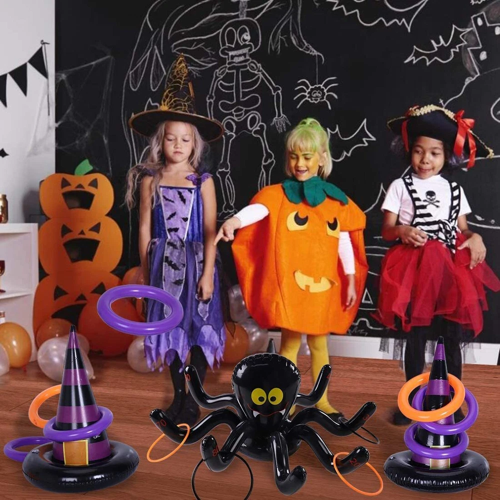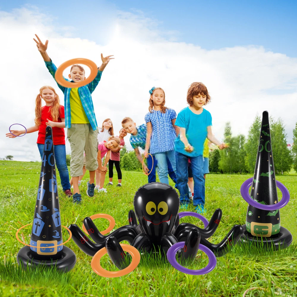 Description: Our Fun Halloween Inflatable Octopus and Witch’s Hat Ring Toss Game includes 12 Rings ( 6 Inflatable + 6 Plastic Rings ) 1 Octopus, 2 Witch’s Hat and 1 Pump. Add fun to your Halloween party with this inflatable ring toss game. Improve eye-hand coordination & concentration skills: Kids games can help positively channel a child's physical and mental energy, also help a child improve concentration skills, and even facilitate the understanding of complex math equations. Wonderful Halloween Party Game. Perfect for Holiday Halloween Party Favors, School Day, Indoor and Outdoor Toss gaming Material: pvc Product Size: Octopus: 23'' x 10.5''x 20''. Rings are 5.1 inches /Rings are 6.7’’. Witch’s Hat: 20’’ x 10.2’’. Package Include: 1 Octopus + 2 Witch’s Hat T+ 12 Rings + 1 Pump