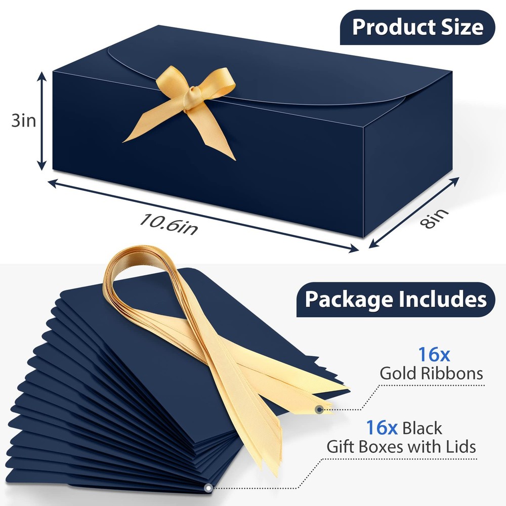 Blue Gift Boxes with Lids, Ribbon and Self-adhesive Dots, 16 Set Feture: Exquisite and Sturdy: Quality and safe blue kraft paper with romatic elegant gold ribbon, and this gift box set will comes with 70pcs double-sided adhesives dots, which make the gift box even stronger, it's no longer loose when you open it. Perfect Size: This wedding gift boxes are large enough for wedding party gift, groomsmen bridesmaid gifts, valentines gift, Christmas, birthday, graduation, baby shower and so on. And also can be applicable for packaging cupcake, homemade cakes, chocolate, soap, candles, jewelry, and other DIY craft items. Suitable for all occasions: Wedding, Birthday party, Bridal shower, Baby shower, Anniversary, Valentine's Day, Christmas and other special occasions. Specifications: Color: Blue Ribbon Color: Gold Box Material: Sturdy & quality kraft paper Ribbon Material:Polyester Candy Favor Box Size: 10.6x7.8x3.1 Inch Package Includes: 16 x Gift Box Set (16 x gift boxes with lids, 16 x gold ribbons, 70 x double-sided adhesives dots) Tips: PLEASE check the size of the product before purchasing. Blue Gift Boxes with Lids: Kraft paper gift boxes set come in 16 pack gift boxes with elegant gold ribbons and 70pcs double-sided adhesives, each storage box measures 10.6''x8''x3''. Sturdy and High Quanlity: These gift boxes are made of high-quality kraft paper. The surface is smooth, with the elegant gold ribbon, the gift boxes look very beautiful. Comes with double-sided adhesives dots, which make the gift boxes even sturdy, ensure your stuff safety. Easy Assembly Black Gift Box: This gift box is easy to fold in seconds, if you are using it to wrap a gift for someone, you can fix the articulation position with double-sided adhesive dots, and attach the included ribbon and it's sturdy. But if you are only using it to store things temporarily, you do not need to consolidate with double-sided adhesive dots, so you can fold it when you do not use it for easy to storage. Multipurpose: The kraft paper gift box is perfect for kinds of presents, wedding party gift, groomsmen bridesmaid gifts, valentines gift, graduation gift, Christmas gift, birthday gift, baby shower and so on. And also can be applicable for packaging cupcake, homemade cakes, chocolate, soap, candles, jewelry, and other DIY craft items. Suitable For All Occasions: Wedding, Birthday party, Bridal shower, Baby shower, Anniversary, Valentine's Day, Christmas and other special occasions.