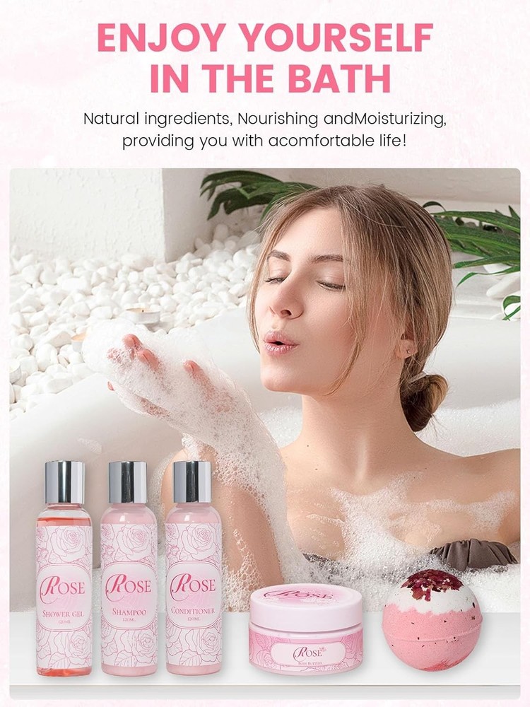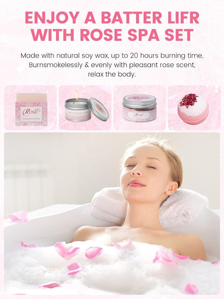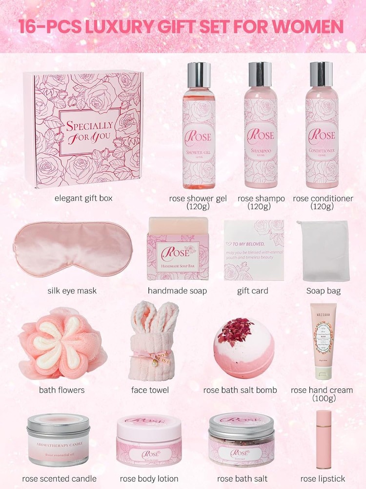 【16PCS SELF CARE GIFTS FOR WOMEN】Spa Gifts Box for Women contains all carefully-designed thoughtful goodies, including luxury face towel, rose shower gel, rose shampo, rose conditioner, rose body lotion ,rose hand cream, rose lipstick, rose bath salt ball, rose bath salt, bath flowers, 4oz rose scented candle, handmade soap, soap bag, silk eye mask, gift card and elegant gift box. Such a heart-warming Gifts for Women Birthday Unique! Send this spa gifts for herto let her enjoy a cozy & leisure time 【NATURAL NOURISHING INGREDIENTS】Our Rose Spa set is made with natural ingredients like rose extract and vitamin E to help nourish the skin and lock in moisture. This women's at-home wellness self care gifts for women includes a variety of products for a soothing and relaxing treatment in the privacy of your bathroom. This thoughtful women's spa gift basket is perfect as a birthday gift, post-surgery gift, or self-care gift to help her relax from head to toe 【BIRTHDAY GIFTS FOR WOMEN】Rose, a soothing and calming aromatherapy scent, is a beautiful spa gift set for her.This exquisite spa gift, scented with rose, makes the perfect relaxation gift for women, including a self-care package, birthday gift, bath set, or spa basket 【SILK EYE MASK & PINK FACE TOWEL】 Comes with a silk eye mask and a pink face towel, pretty soft, comfort, lightweight & fashionable, perfect as relaxing accessories to spoil your lady! Write down your sincere blessings on the high-end greeting card and send it with this deluxe gifts to your loved ones. Get one chic bath spa gifts set as birthday or Christmas stocking stuffer gifts for women sister mom best friends 【UNIQUE GIFTS FOR HER】Still looking for a luxury gift baskets for women to give her an unforgettable unboxing experience? Unique Gifts for Women is a valuable birthday gifts for women best friends mom sister, daughter, grandma, wife, girlfriend, coworkers teacher, etc to let her know she is valued. Also idea as self care gifts for women, get well gifts for women, care package for women, relaxing spa gifts basket for women, thank you gifts for women, thinking of you gifts Brand Honiitaa 8200461