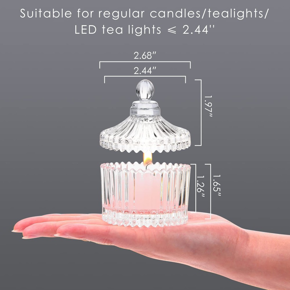 Description Features -Color: Clear -Material: Glass -Size: [VOTIVE CANDLE HOLDERS] Each set contains 16 glass candle jars with lids(Candles not included). The small candle jar measures 2.44’’ inner diameter(top & bottom) and a height of 1.65’’(with no lid). They are suitable for regular candles/tealights/LED tea lights with less than 2.44’’ width diameter and are also a good choice for making handmade candles. [UNIQUE DESIGN & VERSATILITY] The glass has high transparency so that candlelight could be refracted better. The fitted lid makes it easier to extinguish the candle by putting it directly on the top of the jar. The bottom is thickened to prevent cracking. These glass jars not only hold candles, but can also be used as jewellery organizers, small beauty tool containers, candy storage jars, etc. Our bulk candle jars are durable and reusable. [WARM YOUR HOME SPACE] Our clear glass candle holders set is perfect for centerpiece lighting. Decorate dining rooms, living rooms, bedrooms as well as bathrooms with our votive candle holders to create a warm, wonderful atmosphere for your daily life. [LIGHT UP EVERY MEMORABLE MOMENT] Make special days (such as proposals, engagements, weddings, anniversaries) more romantic with the modern candle holders. These jars are works of art and also a great choice as gift giving on Valentine’s Day, Mother’s Day, Halloween, Thanksgiving and Christmas. [BUY WITH CONFIDENCE] We put the candle jars in thick packaging and boxes with the sign “HANDLE WITH CARE” to ensure that the product will reach you in good condition. If you find any defective or damaged products, please feel free to contact us and we will give you a satisfying solution.