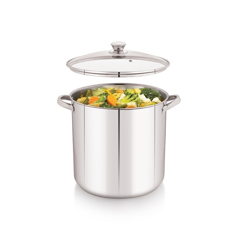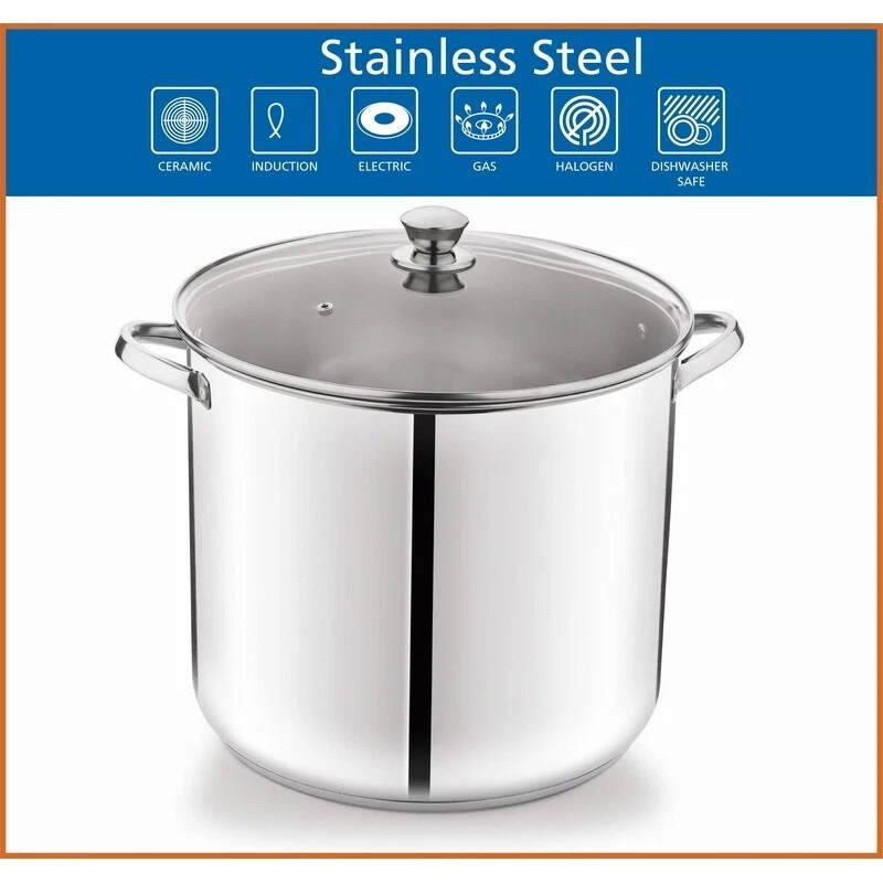 Prepare amazing sauces, soups, pastas, and more with the sizable Stainless Steel 16-Quart Stock Pot with Glass Lid. This extra-large stock pot measures 11. 02”L x 11. 02”W x 10. 63”H and is perfect for cooking family meals for any occasion. Designed with stylish stainless steel and glass, it’s sure to coordinate with your existing cookware. This sturdy stock pot features stay-cool handles and a helpful, transparent glass lid, along with durable, stainless steel construction. Ideal for helping you feed your family and friends at get-togethers, backyard barbecues, celebrations, and other special events, the Stainless Steel 16-Quart Stock Pot with Glass Lid is a must-have cookware item in any kitchen. Stainless Steel 16-Quart Stock Pot with Glass Lid, Induction Compatible, Stainless Steel, Dishwasher Safe Sizable stock pot is perfect for preparing amazing sauces, soups, pastas, and more Dimensions: 11. 02”L x 11. 02”W x 10. 63”H Weight: 4. 84 lbs Induction safe for versatile cooking options Constructed from durable stainless steel with a transparent glass lid