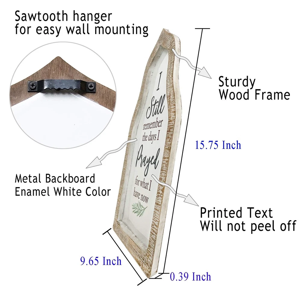 16"X10" Church Shape Prayed Sign Wall Decor, Rustic Farmhouse Wood Framed Metal Plaque House Prayer Sign for Christian Home Decor Wall Art - I Still Remember The Days I Prayed for What I Have Now Product Details Color: white, brown Brand: DeliDecor Material: Wood Theme: Rustic,Farmhouse Recommended Uses For Product: [INF] Wall decor, home decoration, prayer room decoration Mounting Type: Wall Mount Product Dimensions: 16"L x 10"W Shape: Rectangular Style: Modern Pre-printed: I Still Remember The Days I Prayed for What I Have Now Item Thickness: 0.4 Inches UPC: 656874682219 Item Weight: 1.12 pounds Manufacturer: DeliDecor Batteries required: No The prayer sign with shape of church makes you feeling in the church when pray, and make your prayer more pious. With our prayed signs, let your repose of heart set deep in God. Impress your guests, friends and family with this farmhouse signs decor; a unique statement piece for living room, bedroom, dining room, kitchen decor, or any other home decoration. This wall decor is ready to hang on wall with a sawtooth hanger, or lean against any mantles or tabletop, But CAN NOT BE FREE STANDING. It is also an indispensable special decoration for the prayer room. Quality and sturdy construction of solid wood frame with metal backboard, which will not crack, rot, or break; Measures 10''Wx0.4''Dx16''H. The perfect gift that is cute and affordable; Signs can be used as a clever gift idea and great for people of all ages; Perfect for a housewarming, holiday or any occasion gift.