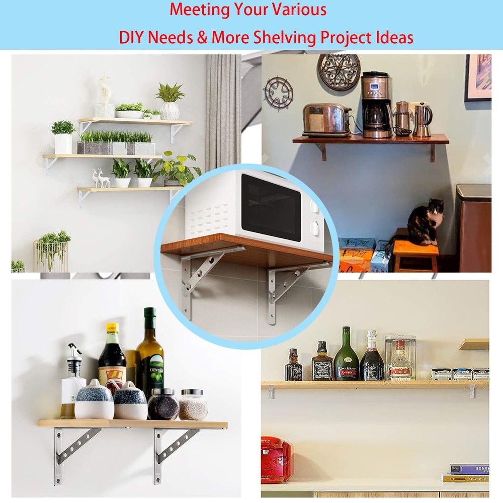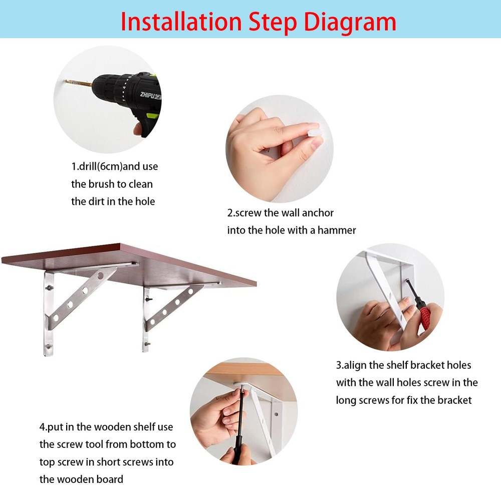 Installation steps: 1. Drill (6cm) and use the brush to clean the dirt in the hole. 2. Hammer the wall anchor into the hole. 3. Align the holes in the shelf bracket with the holes in the wall, screw in the long screws to fix the bracket. 4. Insert the wooden shelf using the screw tool from bottom to top screw in the short screws into the wooden board. Shelf Bracket Package List: 2 shelf brackets, size - 15.75" x 9.84" 4x S-hooks 4x plastic plugs 4x (4*16mm) self-drilling screws 6x (6*35mm) self-tapping screws 4x M6x60mm Bolts Nuts Kit STURDY : Made of high-quality stainless steel with brushed surface and smooth machined edges, with solid triangular structure and 3mm thick support rod, it is strong, wear-resistant and dur-able. Use up to 440 lbs/ 180 kg, not easy to rust or break. FLOATING SHELF BRACKET: The shelf bracket is made of L-shaped supports, welded by high-strength stainless steel, and there is no need to worry about the welding accessories falling off. 2 welding points on each side, enough to support more weight. EASY TO INSTALL: We come with mounting accessories, expansion tubes and long screws for fixing the longer bracket arm to the wall, and short screws for fixing the other bracket arm to the wood board. SUITABLE FOR MANY DIY USES: Our shelf brackets are sturdy and dur-able with a beautiful appearance. Can meet your various ideas for home improvement, such as bookshelves, kitchen racks, display racks, garden racks, garage workbenches, exterior wall brackets and more storage rack items. Also great for office, , hotel or commercial use SHELF BRACKET PACKAGE LIST: 2 shelf brackets, size - 15.75" x 9.84",4x S-hooks,4x plastic plugs,4x (4*16mm) self-drilling screws,6x (6*35mm) self-tapping screws,4x M6x60mm Bolts Nuts Kit. Our heavy-duty brackets provide a 24-month quality , and if you are not satisfied within 30 days, we can provide you with a or service, and 24-hour manual service is available online for you.