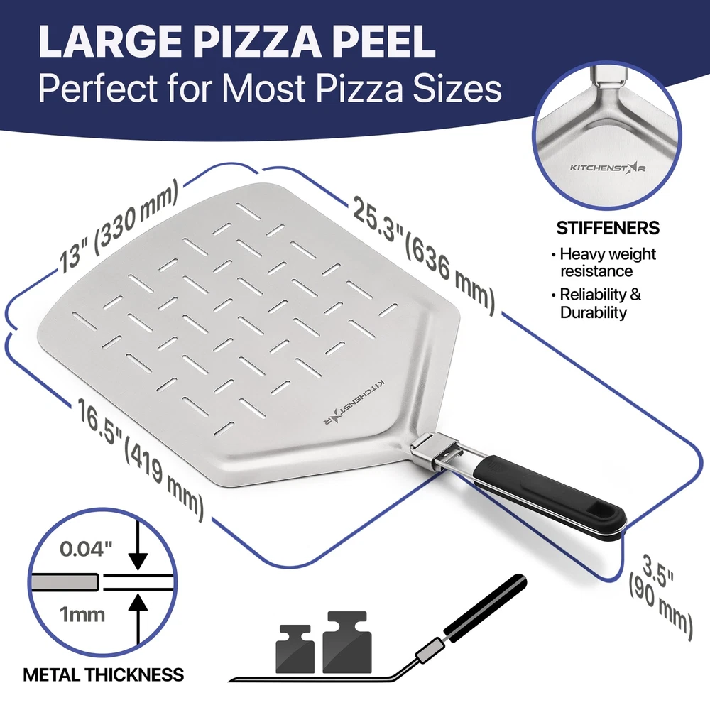 Performance: The pizza slicer features a super sharp blade that makes slicing through any pizza a breeze, while the pizza peel's perforated design allows for less sticking and excess flour removal Safety: The well-designed protective cover on the pizza cutter is easy to put on and protects your fingers and blade when not in use Ergonomic Handles: Both the pizza cutter and paddle feature comfortable, ergonomic handles for a secure grip and ease of use Space Saving: The pizza peel's folding mechanism allows for easy storage in even the smallest kitchens, while the hanging holes on both tools make for easy organization Gift Ready: This pizza making kit makes a perfect gift for any pizza lover or home chef for any occasion, including birthdays, weddings, housewarmings, and more