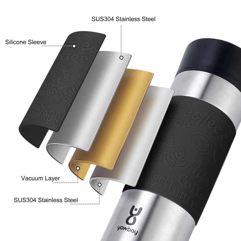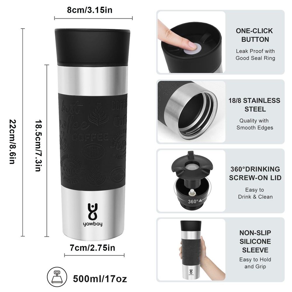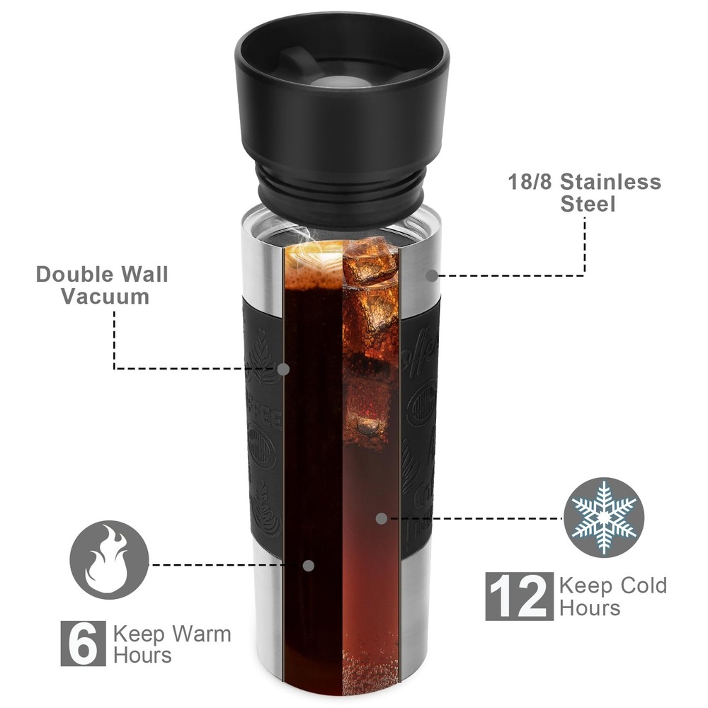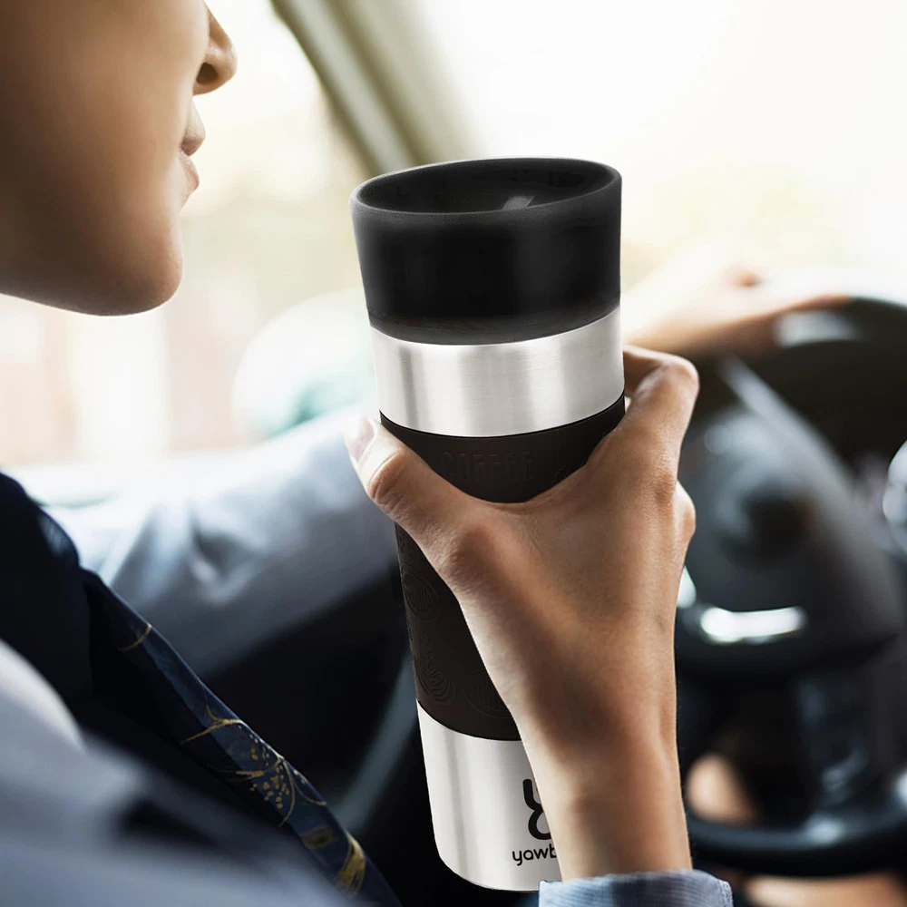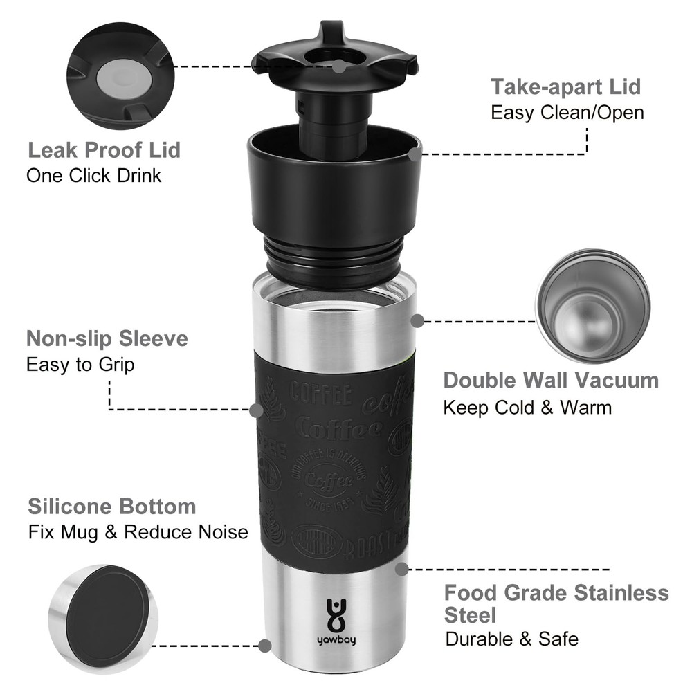 Vibrant-color Travel Coffee Mug with 360°Drinking Lid With various stylish and colorful designs, we coffee travel mug has a few colors and capacities to offer, suiting your different needs for various outdoor or indoor activities like work, drive, study, gym, have a picnic, camping, hiking, etc. Insulated Tumblers Suits Different Scenes has been deeply engaged in the design, development and production of thermal coffee mug technology for more than 10 years, becoming your reliable companion on your long journeys and great adventures in your everyday life no matter when you work, drive, study, gym, have a picnic, camping, hiking or any other activities, For the sake of the environmental protection, let us leave disposable paper or plastic cups behind, Enjoy your hot or cold drinks while contributing to the world's environmental protection. Quality 18/8 Stainless Steel Tumbler Well made of durable 18/8 Stainless Steel, our insulated coffee mug is free of harmful substances, odorless and tasteless, which is no health risk at all, keeping your drinks fresh and tasty originally while keeping your family free of safety worries. Coffee Mug with 360°Drinking Removable Screw-on Lid Removable lid makes clean up easier, One-click lid button makes one-handed a breeze, 360°all-round drinking outlet makes drinking more convenient, A screw-on mug lid design ensures our thermal coffee mug Leak Proof & Spill proof. Non-slip Silicone-Sleeve Coffee Cup Body Design our stainless steel coffee mug is designed with a silicone sleeve on coffee mug body, which makes it easy to hold and grip the coffee bottle even with your gloves or with your hands wet! Non-slip Silicone Stainless Steel Tumbler Bottom Design Covered with a non-slip silicone bottom, our coffee travel mug will not easy to slide down from 【Easy to Drink with 360°Drinking Outlet】- Easily Using ONE finger to press on the button at the top of travel coffee mug, you can drink your water from all sides, which makes drinking one-handed a breeze, without worry of looking for the drinking outlet when busy on driving or any other things. 【Keeps Drinks Cold or Hot】- Applying excellent quality Double Wall Vacuum 18/8 stainless steel, this insulated coffee travel mug will keep your drinks cold for 12 hours or hot for 6 hours, terrific thermal coffee mug for your way out for trip, work or libary, etc, meanwhile, 18/8 stainless steel mug ensures a lasting-favor of drinkns with no peculiar smell. 【Travel Coffee Mug Spill Proof & Leak Proof】- Well made in sealing of mugs lid, this insulated coffee mug will keep your water, coffee, tea or other drinks on lock, no worry about liquids spill or leak when using. Also, coffee mugs are made of Food Grade BPA-Free material, without any worry of safe problem. 【Easy Cleaning with Dishwasher Safe】- Insulated coffee mugs are dishwasher safe material, which frees your hands by tossing travel coffee mug in dishwasher without worry of finish flaking. Please note that the plastic lid can not be put in dishwasher, but removable top lid of coffee mug makes hand wash clean up more easily. 【Easy to Hold with Non-Slip Silicone】- Designed with non-slip silicone cover and ruber cushion on bottom of coffee mug, you can easily hold this travel mug without worry of slippery and tough to hold onto with wet hands or with gloves. Also with its right size you can perfectly put in your car cup holder, at your coffee maker, or anywhere you want to take and use like home, gym, library, travel or any outdoor indoor activities!