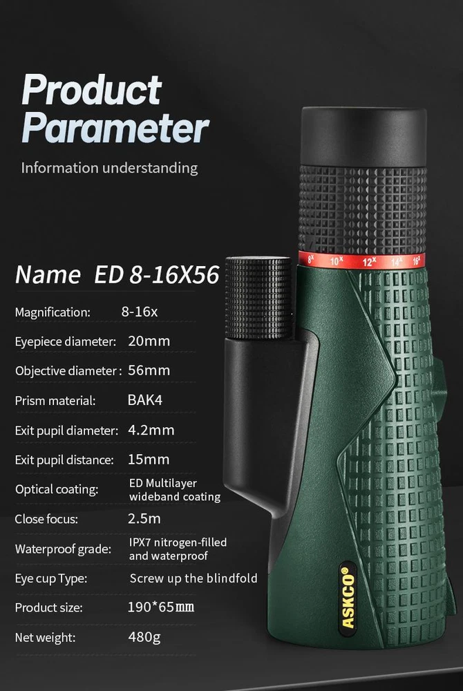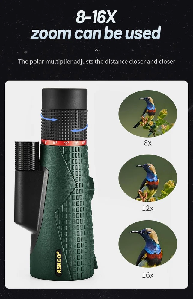 Free and fast shipping , shipping take up 1-7 Business Days 30 Day Return Accepted EASY PAYMENT via PayPal, Credit Card, PayPal Credit, Google Pay... 16x Zoom Monocular Telescope Hunting Plastic Multicolor Waterproof Modern Bak4 ASKCO 8-16X56 ED Glass Monocular Telescope SMC Coating Long Range IPX7 Zoomable BAK4 Portable Anti shake Binoculars for Hunting REVIEWS The product came very well packaged. I'm very happy. thank you for everything. Seller strongly recommended. This is great! I definitely recommend! Product looks amazing Delivery was fast. Excellent seller, great communication. I advise everyone to buy it!