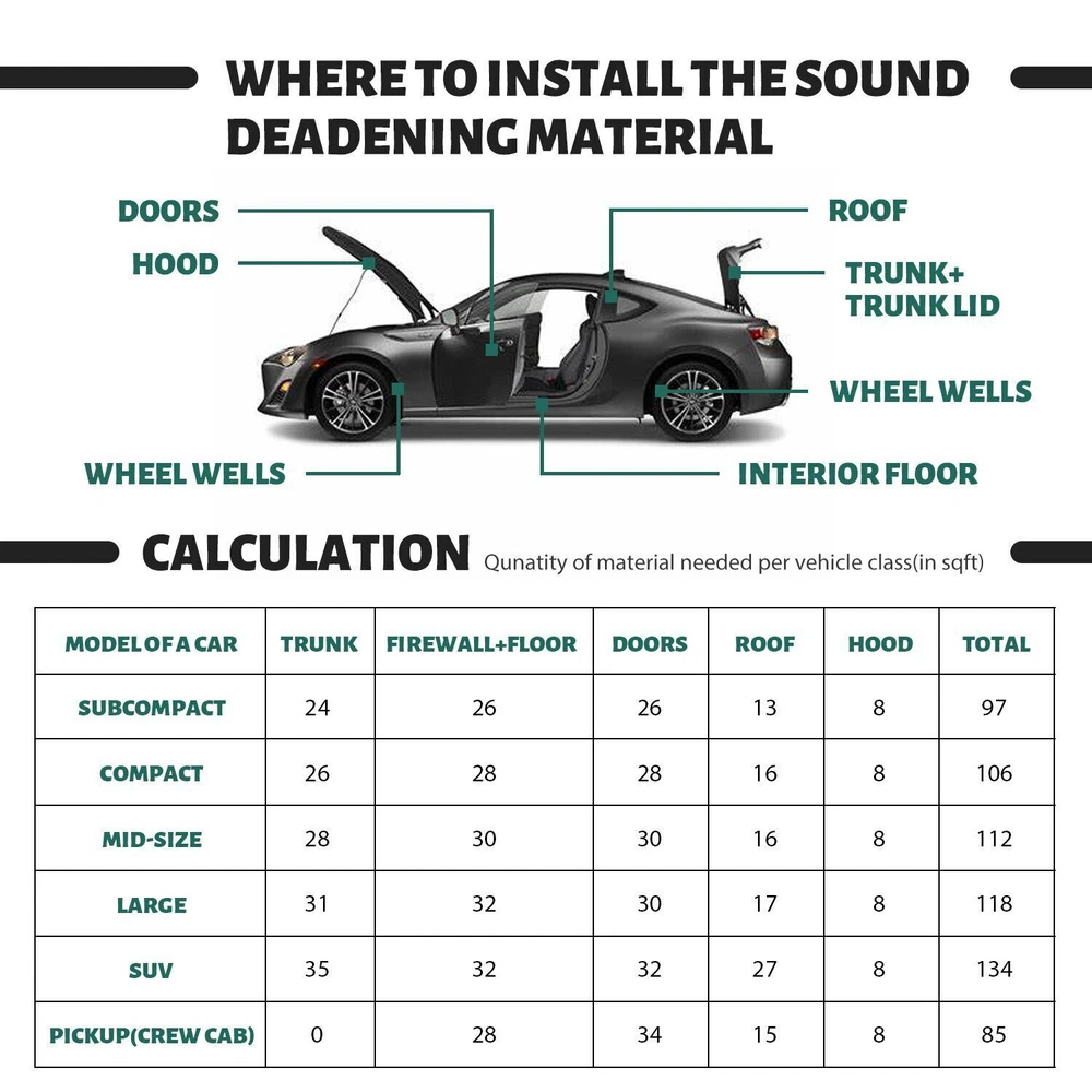Package included: 15pcs 16" X 10" Car Sound Deadener Heat Insulation Pads Description: Type:Car Truck Noise Reduce Dampening Material: Aluminum & Foam Thickness:7mm Size:40x25cm=16"X10"=16.15sqft=1.5sqm Color: Silver+Black Recommended Install Temperature: -10°C ~ +60°C Resistance Temperature Range: -40°C ~ +300°C Waterproof : Yes Features Liu5092 Best choice of motor parts Sound Deadener Heat Shield Auto SUV Trunk Floor Hood Soundproof Firewall 16"x10" Package included: 15pcs 16" X 10" Car Sound Deadener Heat Insulation Pads Description: Type : Car Truck Noise Reduce Dampening Material: Aluminum & Foam Thickness:7mm Size:40x25cm=16"X10"=16.15sqft=1.5sqm Color: Silver+Black Recommended Install Temperature: -10°C ~ +60°C Resistance Temperature Range: -40°C ~ +300°C Waterproof : Yes Features 【 Reduce road noise 】If you often drive on uneven roads or on noisy highways, sound insulation can bring you more comfort. It will reduce the noise of roads and other drivers. It will make your driving smoother and have the added benefit of better media listening 【 Enhance the music 】Use sound insulation to make your radio clearer. You will no longer have to turn it up because of traffic noise. Not only is it good for music, but audio books and telephones will sound better, too 【 Improve privacy 】If you don't want other people on the road to hear what you're listening to, the sound insulation prevents the noise from escaping. Sound insulation will help you 【 Warm in winter and cool in summer 】The car insulation will help reduce your interior temperature in the summer, and in winter, the heat insulation can keep you warm in the car, which is conducive to warmth reduce engine/tunnel/console 【 Protect car paint 】In summer, the temperature is too high, the engine runs at high speed and accelerates for a long time, and generates heat, which can easily cause the aging and fading of the car paint; the heat insulation pad can protect it 【 Increase the life of the car 】In summer, due to high temperature and long-term driving, it is easy to cause the cabin to heat up and cause a fire, which may seriously damage your car. Using heat insulation pads can extend the life of the car Installation: Decide what part you want to insulate first: car roof, car floor, car doors or a hood. Please clean the surface you want to paste. Remove the remains of the factory insulation once you have dismantled the interior. Properly clean and degrease the surface prior to installation of mat. Measure the pre cleaned surface of the prospective spot that you are going to treat. Try to locate the piece of material onto the prospective surface of a car without removing an adhesive paper. When your sheet is ready to used, lay that down to the surface and let is glue. Flatten the sheet with hands to avoid air bubbles. Use a roller(not including) for rolling down the foil as a neat step. ? Installation Notices: Make insulation materials and sheet metal firm fit, and play best adhesive, damping performance Do not cover the chassis wiring or air holes when you installation Appropriate use of adhesive tape will strengthen connections effect Paste Aluminum Soundproof/Damping Plate,you could heat with a hair dryer to make it soft, then compacted by hand. If the room temperature is below 5 degrees Celsius, first with sun lamp heating it until soft. Then remove the wax paper and paste it. The extra insulation can be pasted in some hidden place It is not possible that there is an effect on the hearing by only a door installation ,it requires completed construction ? Fitment For: Exterior bulkhead, firewall, hood, engine compartment, engine bays. Boot, wheel arch, body panels, load floor, under seat, floor, interior bulkhead And So On. Also ideal for under floor applications as it has great load resistance properties. Note: Due to the light and screen setting difference, the item's color may be slightly different from the pictures. Please allow slight deviation for the measurement data. Please allow 1-3cm error due to the hand measurement . If you have any questions, please contact us at the first time, we will give you a satisfactory answer. Item Specifics Brand Modigt Type Car Truck Noise Reduce Dampening Color Silver&Black Manufacturer Warranty 2 Years Material Aluminum & Foam Placement on Vehicle Cargo/Trunk/Bonnet/Dashboard/Under Seat/Doors Fitment Type Direct Replacement Manufacturer Part Number Car Heat / Sound Insulaiton Deadener Superseded Part Number Deadening Material Insulation Cars & Truck Application 1 Hood,Firewall,Doors,Floor,Roof Application 2 Underlay,Boot,Panel,Chasis Application 3 Trunk Lid,Trunk Room,Engines,Tailgate Application 4 Ceiling,underneath bonnets,Underfelt Application 5 Car& Home Interior Heat Sound Deadener Insulation Application 6 Automotive,Motorhome,Camper,Restorer Application 7 Classic Car,Race Car,Stock Car,Old Vintage Car,Pickup,SUV,Caravan Application 8 Van,Truck,limousine,Camper,Boat,Motor Homes,School Bus,Low Rider Application 9 muscle car/hot rods/corvettes/imports/tuners/street rods/rat rods Application 10 For use in the application of any sound deadening Function 1 Reduce the road/ Engine/ Wind noise Function 2 Dustproof/ Waterproof/ Anti-moisture Function 3 Protects Paint from Blistering Easy Installation All Curves and Corners Without The Need For Heat Features1 Easy Installation, Waterproofing, Noise Reduction Features2 Protects Paint from Blistering, Anti-moisture Features3 Easy Clean,Noise Reduction, Easy to Cut, Self-Adhesive Thickness 7mm=276mil=0.276” Size 40X25cm/ 16inX10in Items Included 15pcs 16" X 10" Car Sound Deadener Heat Insulation Pads Payment 1. It will be much appreciated that you finish your payment asap or it will make UPI (unpaid item case) on your account leading to be suspended or restricted by eBay when those UPI cases carry over to certain amount. 2. Any problems please contact us for more details. Shipping 1. All items will be shipped to buyer's 