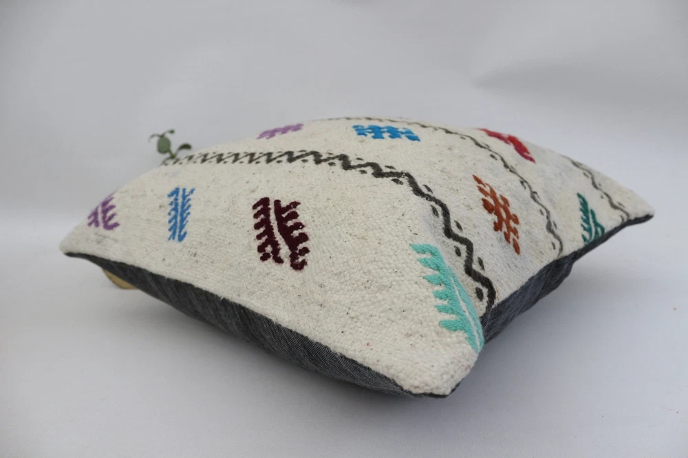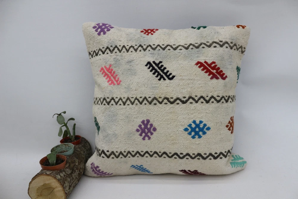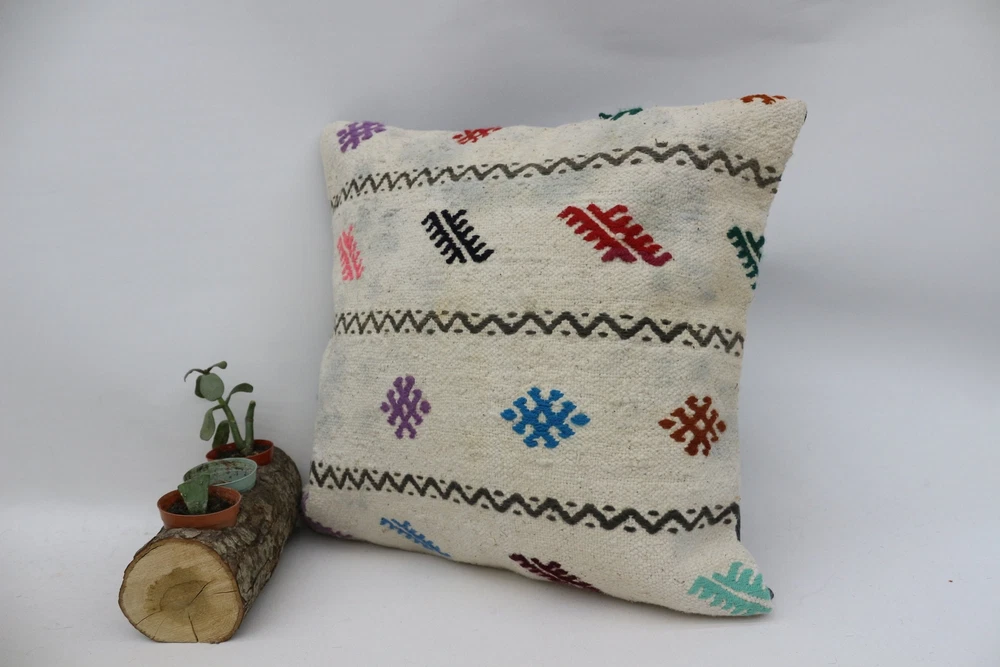 Kilim Pillow Details: All of my beautiful pillow covers or cushion cases are designed and made by me. I am making my throw pillow covers from handmade vintage rugs, Turkish rugs. Therefore, each of my vintage kilim pillowcase is one of kind. These cushions covers are piece of an art. The size of this pillow is 16 x 16 inches or 40 x 40 cm. The front side of this decorative pillow cover, cushion cover is wool on wool vintage kilim rug. The backside of this throw is high quality cotton fabric with a high quality zipper. This listing has 2 option for this handmade pillow. You can choose with insert or without insert. The listing photos is with insert in the pillowcase which is just for demonstration purpose. All of my vintage Turkish rugs have been professionally washed before I cut them as pillow case or cushion case so these kilim covers are 100 posent clean and ready to use. Due to the age and handmade nature of these vintage rugs, there might be imperfections and flaws that are not considered defects. This is a piece of a handmade vintage rug with minor signs of wear consistent with age and use that give it an antique look. You can see the condition of the rug pillow clearly in the detailed photos. I am going to ship your order of decorative pillow as soon as possible. I usually ship in the next day with DHL Express or FedEx which will deliver the kilim pillow, cushion cover just in 3-5 business days. It is my responsible until you receive pillow cover or pillow cover with insert at your door. If the pillow cover or insert get lost or damage during the shipping, I will ship the new kilim pillow cover or pillow insert for free as soon as possible. I take photos of my throw pillows indoor with professional camera which shows the real colors. The photos of these Turkish pillow covers are not altered. Keep in mind the colors of the rug vary slightly in different lights. Please contact to me for additional photos. I take the photos of my vintage rugs outside with daylight to show you the real and natural colors. My photos are not altered. Keep in mind the colors of the rug vary slightly in different lights. Please contact to me for additional photos. SATISFACTION GUARANTEED for your order in my shop. Your SATISFACTION is the most important to me. Please write me if you have any question or if you don't like anything from my pillow covers, cushion covers. If any reason, you are not happy from your Turkish pillow cover, I accept return without any hassle. Please read my shop policies for details. This cushion case or pillow cover can be used as decorative throw pillow, gift pillow, Christmas pillow case, bedding pillow, lumbar pillow, sofa pillow, bohemian pillow, boho pillow. You can find in any kind of Turkish kilim pillow cover in different design such as striped pillow, embroidered pillow, and geometric pillow.