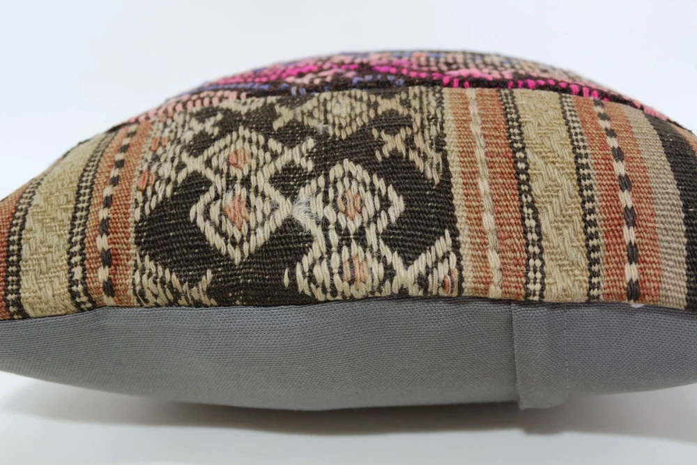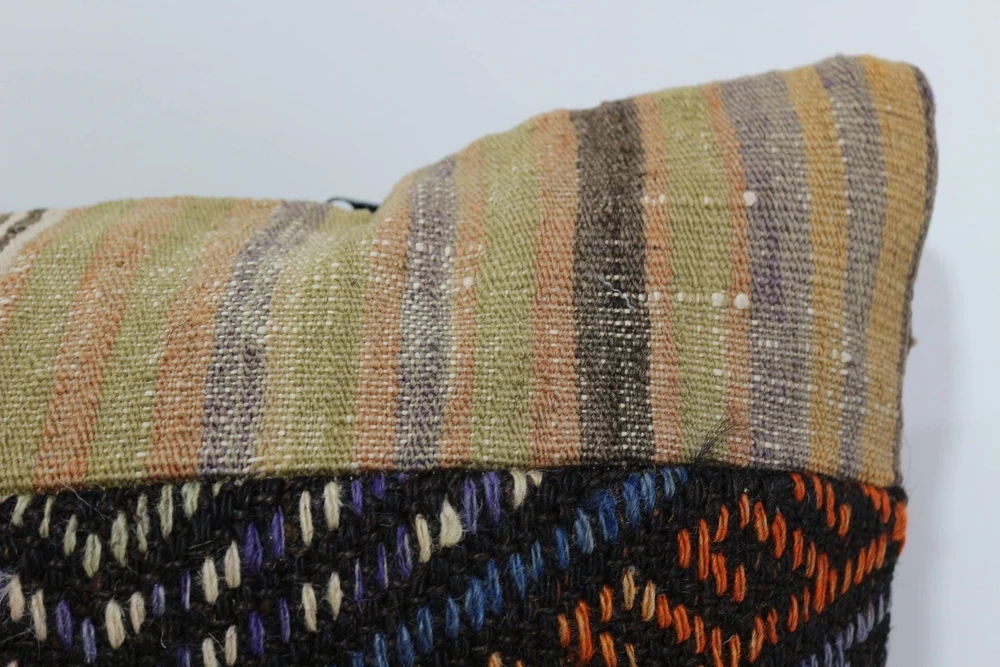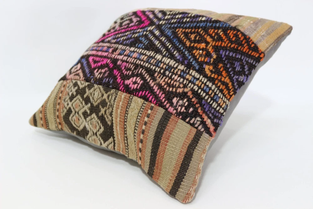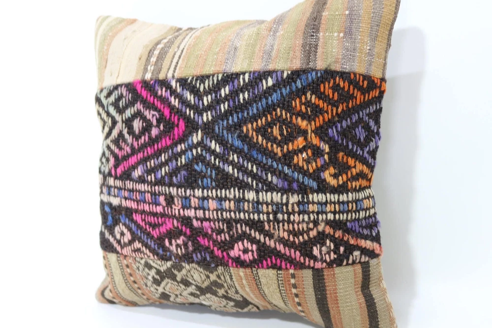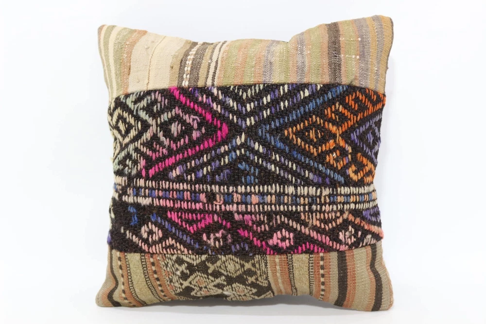 Kilim Pillow Details: All of my beautiful pillow covers or cushion cases are designed and made by me. I am making my throw pillow covers from handmade vintage rugs, Turkish rugs. Therefore, each of my vintage kilim pillowcase is one of kind. These cushions covers are piece of an art. The size of this pillow is 16 x 16 inches or 40 x 40 cm. The front side of this decorative pillow cover, cushion cover is wool on wool vintage kilim rug. The backside of this throw is high quality cotton fabric with a high quality zipper. This listing has 2 option for this handmade pillow. You can choose with insert or without insert. The listing photos is with insert in the pillowcase which is just for demonstration purpose. All of my vintage Turkish rugs have been professionally washed before I cut them as pillow case or cushion case so these kilim covers are 100 posent clean and ready to use. Due to the age and handmade nature of these vintage rugs, there might be imperfections and flaws that are not considered defects. This is a piece of a handmade vintage rug with minor signs of wear consistent with age and use that give it an antique look. You can see the condition of the rug pillow clearly in the detailed photos. I am going to ship your order of decorative pillow as soon as possible. I usually ship in the next day with DHL Express or FedEx which will deliver the kilim pillow, cushion cover just in 3-5 business days. It is my responsible until you receive pillow cover or pillow cover with insert at your door. If the pillow cover or insert get lost or damage during the shipping, I will ship the new kilim pillow cover or pillow insert for free as soon as possible. I take photos of my throw pillows indoor with professional camera which shows the real colors. The photos of these Turkish pillow covers are not altered. Keep in mind the colors of the rug vary slightly in different lights. Please contact to me for additional photos. I take the photos of my vintage rugs outside with daylight to show you the real and natural colors. My photos are not altered. Keep in mind the colors of the rug vary slightly in different lights. Please contact to me for additional photos. SATISFACTION GUARANTEED for your order in my shop. Your SATISFACTION is the most important to me. Please write me if you have any question or if you don't like anything from my pillow covers, cushion covers. If any reason, you are not happy from your Turkish pillow cover, I accept return without any hassle. Please read my shop policies for details. This cushion case or pillow cover can be used as decorative throw pillow, gift pillow, Christmas pillow case, bedding pillow, lumbar pillow, sofa pillow, bohemian pillow, boho pillow. You can find in any kind of Turkish kilim pillow cover in different design such as striped pillow, embroidered pillow, and geometric pillow.