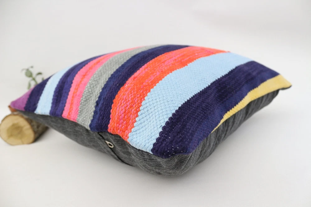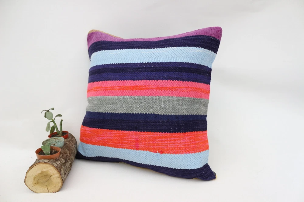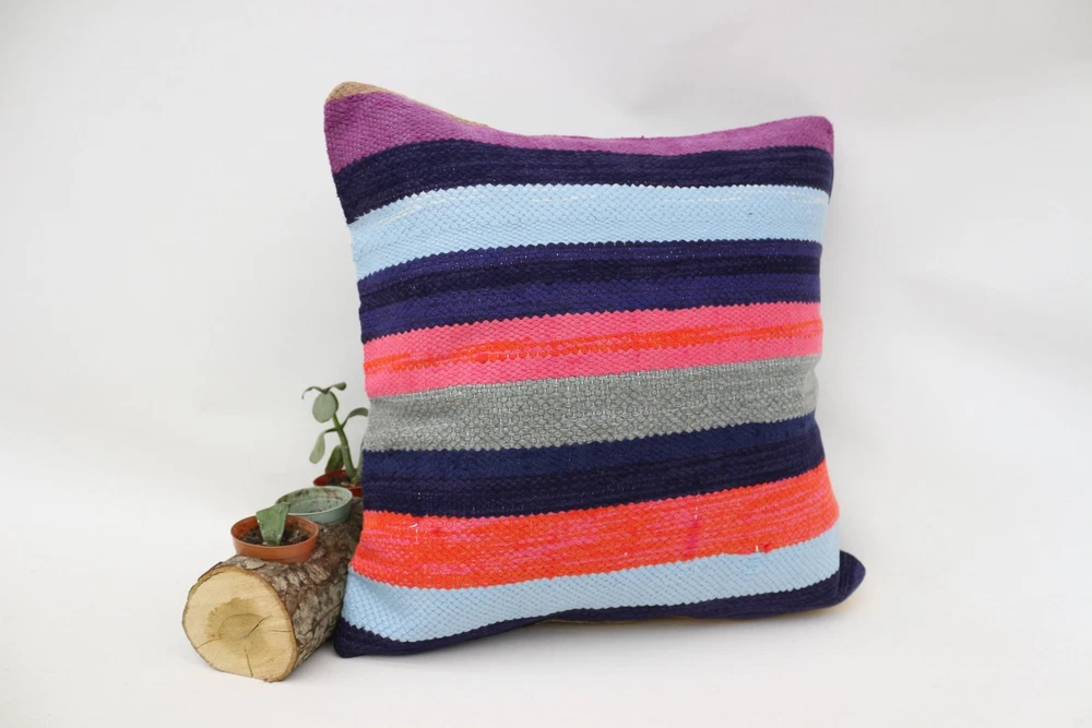 Kilim Pillow Details: All of my beautiful pillow covers or cushion cases are designed and made by me. I am making my throw pillow covers from handmade vintage rugs, Turkish rugs. Therefore, each of my vintage kilim pillowcase is one of kind. These cushions covers are piece of an art. The size of this pillow is 16 x 16 inches or 40 x 40 cm. The front side of this decorative pillow cover, cushion cover is wool on wool vintage kilim rug. The backside of this throw is high quality cotton fabric with a high quality zipper. This listing has 2 option for this handmade pillow. You can choose with insert or without insert. The listing photos is with insert in the pillowcase which is just for demonstration purpose. All of my vintage Turkish rugs have been professionally washed before I cut them as pillow case or cushion case so these kilim covers are 100 posent clean and ready to use. Due to the age and handmade nature of these vintage rugs, there might be imperfections and flaws that are not considered defects. This is a piece of a handmade vintage rug with minor signs of wear consistent with age and use that give it an antique look. You can see the condition of the rug pillow clearly in the detailed photos. I am going to ship your order of decorative pillow as soon as possible. I usually ship in the next day with DHL Express or FedEx which will deliver the kilim pillow, cushion cover just in 3-5 business days. It is my responsible until you receive pillow cover or pillow cover with insert at your door. If the pillow cover or insert get lost or damage during the shipping, I will ship the new kilim pillow cover or pillow insert for free as soon as possible. I take photos of my throw pillows indoor with professional camera which shows the real colors. The photos of these Turkish pillow covers are not altered. Keep in mind the colors of the rug vary slightly in different lights. Please contact to me for additional photos. I take the photos of my vintage rugs outside with daylight to show you the real and natural colors. My photos are not altered. Keep in mind the colors of the rug vary slightly in different lights. Please contact to me for additional photos. SATISFACTION GUARANTEED for your order in my shop. Your SATISFACTION is the most important to me. Please write me if you have any question or if you don't like anything from my pillow covers, cushion covers. If any reason, you are not happy from your Turkish pillow cover, I accept return without any hassle. Please read my shop policies for details. This cushion case or pillow cover can be used as decorative throw pillow, gift pillow, Christmas pillow case, bedding pillow, lumbar pillow, sofa pillow, bohemian pillow, boho pillow. You can find in any kind of Turkish kilim pillow cover in different design such as striped pillow, embroidered pillow, and geometric pillow.