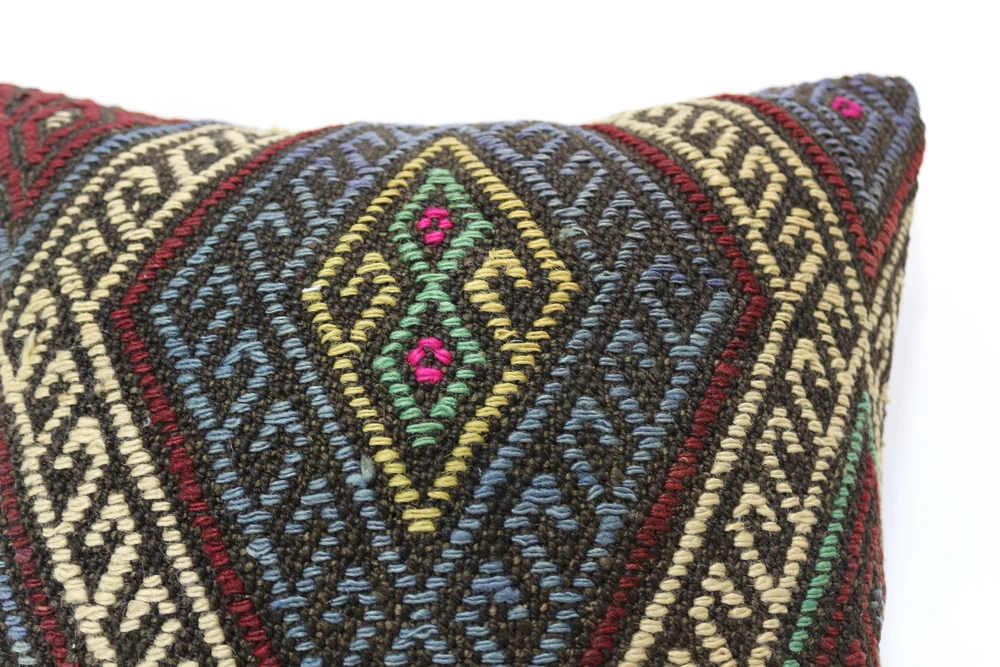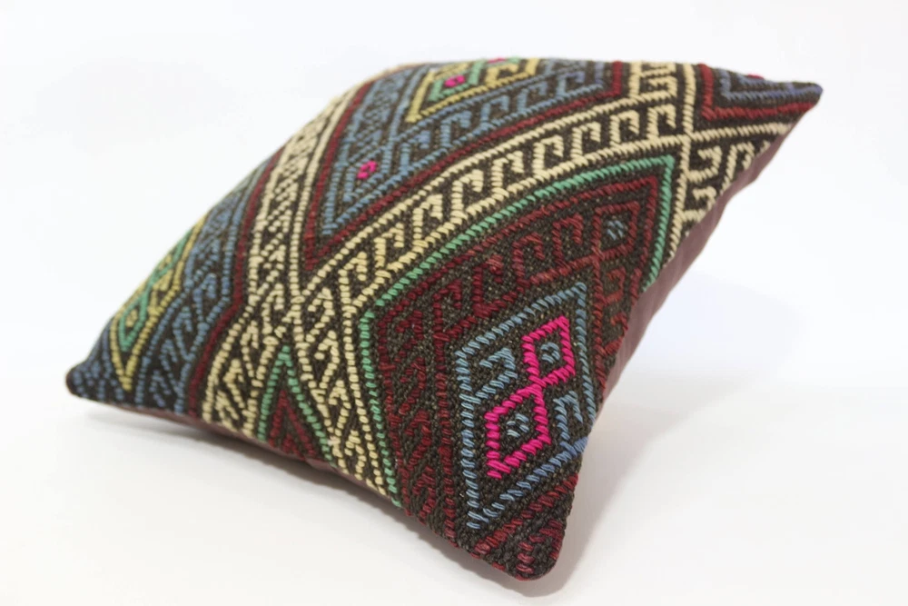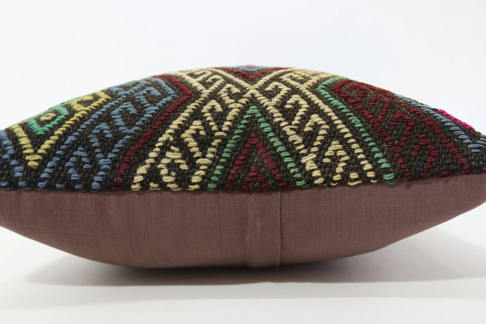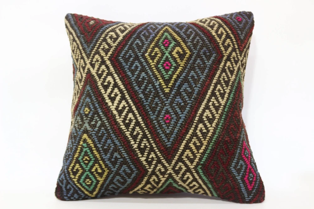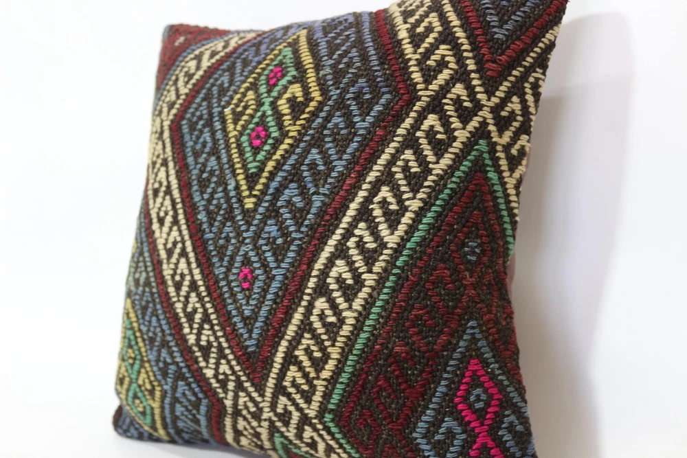 Kilim Pillow Details: All of my beautiful pillow covers or cushion cases are designed and made by me. I am making my throw pillow covers from handmade vintage rugs, Turkish rugs. Therefore, each of my vintage kilim pillowcase is one of kind. These cushions covers are piece of an art. The size of this pillow is 16 x 16 inches or 40 x 40 cm. The front side of this decorative pillow cover, cushion cover is wool on wool vintage kilim rug. The backside of this throw is high quality cotton fabric with a high quality zipper. This listing has 2 option for this handmade pillow. You can choose with insert or without insert. The listing photos is with insert in the pillowcase which is just for demonstration purpose. All of my vintage Turkish rugs have been professionally washed before I cut them as pillow case or cushion case so these kilim covers are 100 posent clean and ready to use. Due to the age and handmade nature of these vintage rugs, there might be imperfections and flaws that are not considered defects. This is a piece of a handmade vintage rug with minor signs of wear consistent with age and use that give it an antique look. You can see the condition of the rug pillow clearly in the detailed photos. I am going to ship your order of decorative pillow as soon as possible. I usually ship in the next day with DHL Express or FedEx which will deliver the kilim pillow, cushion cover just in 3-5 business days. It is my responsible until you receive pillow cover or pillow cover with insert at your door. If the pillow cover or insert get lost or damage during the shipping, I will ship the new kilim pillow cover or pillow insert for free as soon as possible. I take photos of my throw pillows indoor with professional camera which shows the real colors. The photos of these Turkish pillow covers are not altered. Keep in mind the colors of the rug vary slightly in different lights. Please contact to me for additional photos. I take the photos of my vintage rugs outside with daylight to show you the real and natural colors. My photos are not altered. Keep in mind the colors of the rug vary slightly in different lights. Please contact to me for additional photos. SATISFACTION GUARANTEED for your order in my shop. Your SATISFACTION is the most important to me. Please write me if you have any question or if you don't like anything from my pillow covers, cushion covers. If any reason, you are not happy from your Turkish pillow cover, I accept return without any hassle. Please read my shop policies for details. This cushion case or pillow cover can be used as decorative throw pillow, gift pillow, Christmas pillow case, bedding pillow, lumbar pillow, sofa pillow, bohemian pillow, boho pillow. You can find in any kind of Turkish kilim pillow cover in different design such as striped pillow, embroidered pillow, and geometric pillow.