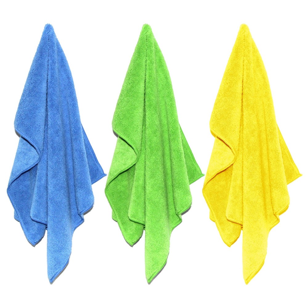 If we may, would you care for some super talented cleaning towels? We created them just for you, so that your cleaning task can be completed to your satisfaction as quickly and easily as possible. They are infused with SUPER ABSORBENT properties to CAPTURE DUST and DIRT. Can be used on virtually ALL HARD SURFACES and you need not fear of any scratches, but do take care not to use on hot surfaces. If you like, you can even clean WITHOUT CLEANERS. LINT and STREAK FREE, CLEAN, DRY and POLISH. If we may be so bold, these towels are best used for virtually all auto, automotive, garage, household, kitchen, bathroom, commercial, cleaning related tasks with our without your favorite cleaner. Use for washing, wiping, drying, detailing, polishing, dusting, the interior and exterior of vehicles (cars, trucks, boats, motorcycles, rvs, vans, suvs, etc.), glass, crystal, silverware, windows, mirrors, stainless steel, marble, granite, television screens, computer monitors, tablets, mobile phones, eyeglasses, sunglasses, lenses and more. Use as a rag for cleaning dirt, oil, grime, and other debris off your tools or garage floor, wet or dry, with or without water. Please hand or machine wash in warm water with like colors and air dry or dry on the low setting. We ask you not use fabric softener, bleach, dryer sheets. Key Product Features Size: 16 inches by 24 inches or 40.6 cm by 60.9 cm Colors: bright blue, green, yellow Weave: terry Edges/Trim: sewn Sewn in Label: none Includes: 18 towels Classification: Standard Microfiber Classifications: Standard = 250 - 299 gsm Premium = 300 - 349 gsm Professional = 350 - 399 gsm Elite > 399 gsm Super soft and absorbent microfiber holds 8x its weight in liquids but dries 2x faster than traditional fibers Highly effective microfiber captures dust, dirt and debris; safe to use on hard surfaces, paints and clear coats Use wet or dry and with or without cleaners 100’s of times; machine wash as needed Clean, dry, and polish, to a lint free and streak free shine in your vehicle, home or office Large Size: 16 in. x 24 in., no sewn tag/label, multiple colors for more sanitary color coded cleaning