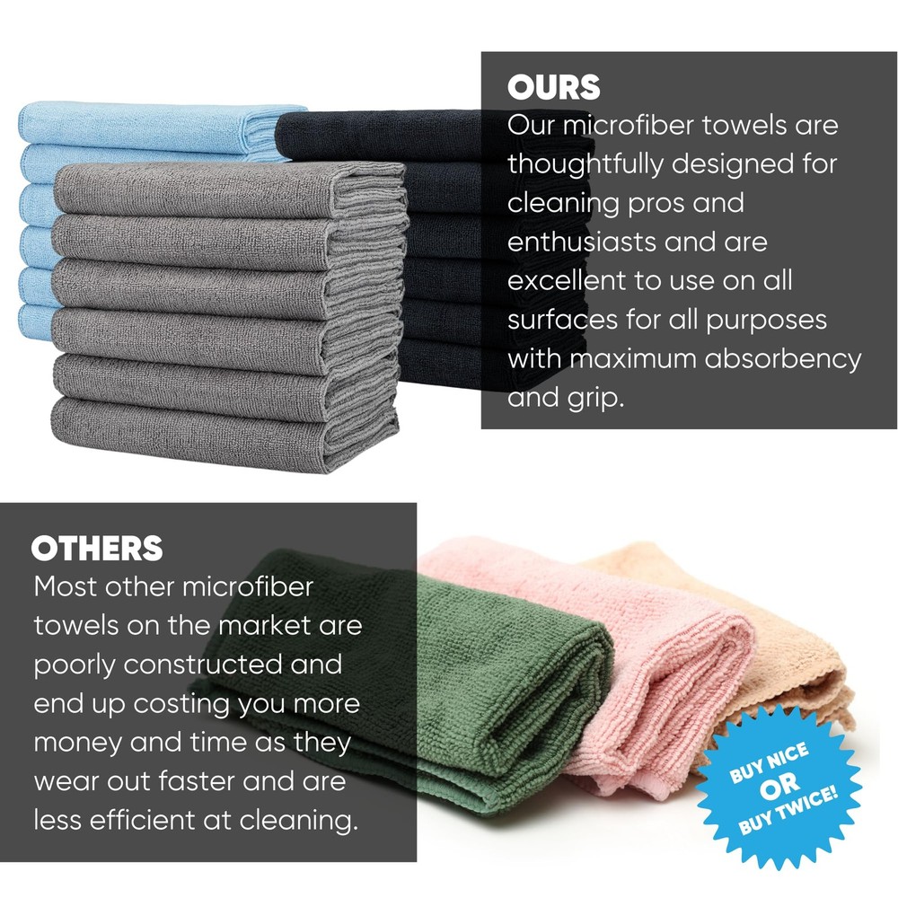 You already know microfiber is a game changer when it comes to cleaning. Now, meet the upgrade: the new Buff Pro Multi Surface Microfiber Towel the perfect microfiber cleaning-cloth for house hold cleaning tasks. Short of having somebody else do your chores, nothing is going to make them easier than Buff. You're not going to find a more versatile or higher quality cleaning cloth on the market. This towel is both heavy duty and incredibly soft. It's remarkably dense which means there is more microfiber cleaning power loaded into each towel. It allows you to clean more effectively and with less effort. This is truly an all purpose, multi surface towel. It's machine washable and more durable than other microfiber on the market, so you'll get hundreds of washings out of each cloth. You'll be cleaning smarter and saving money on cleaning chemicals, since water is all you need to add to clean even the toughest surfaces. So, be confident that you can clean any surface at home, the office, even your car with the Buff Pro Multi Surface Microfiber Towel. Our towels are no streak and extremely low linting! Terry style microfiber towels won't be 100% zero lint, due to the longer loops that make it great for cleaning. Use it to dust, scrub, dry, polish, and absorb. You will be ahead of the game with Buff and on to the more important things in life. Order your professional cleaning cloths now. Ready to tackle your big cleaning jobs with less effort? Try the new MW Pro Multi-Surface Microfiber Towel - now in a larger size perfect for kitchen cleanups and auto detailing! You’ve heard people say “work smarter, not harder”, right? They were talking about this cleaning cloth. Truly an all-purpose, multi-surface towel, now you can dust, scrub, clean, polish, and dry your entire home, office and car! Clean everything, even windows, with just one towel… and clean effectively without added chemicals. Find out what cleaning pros already know; MW Pro Microfiber aren't ordinary microfiber cloths. It’s a real top quality product that just cleans better than other microfiber. It’s thicker, softer, and more absorbent. They’re designed for cleaning pros who demand more performance and more durability from their cleaning products. MW Pro Microfiber is designed to be effective for over 500 launderings and has an easily removable tag to protect your delicate finishes. Be assured by our 360 day 100% satisfaction . If you have an issue, just and we’ll make sure you’re happy! Start making your life easier, ORDER YOURS TODAY!