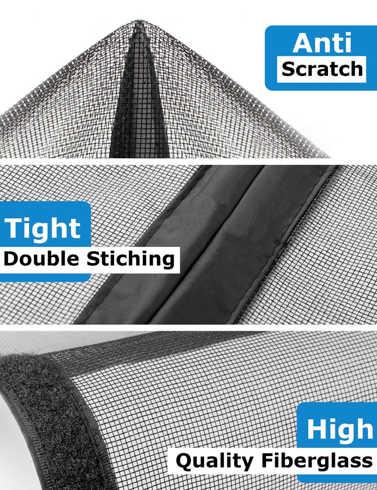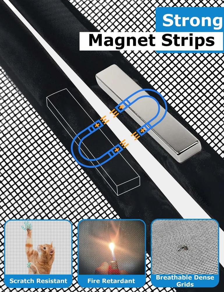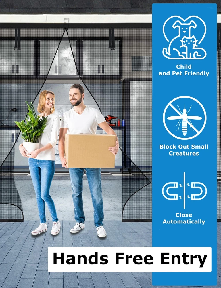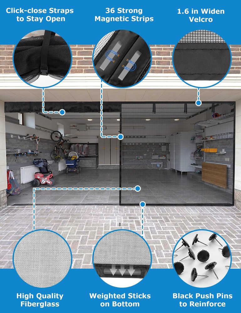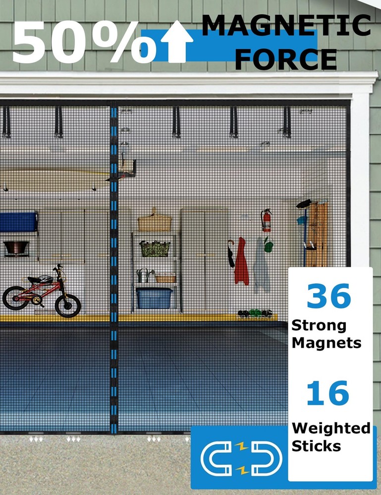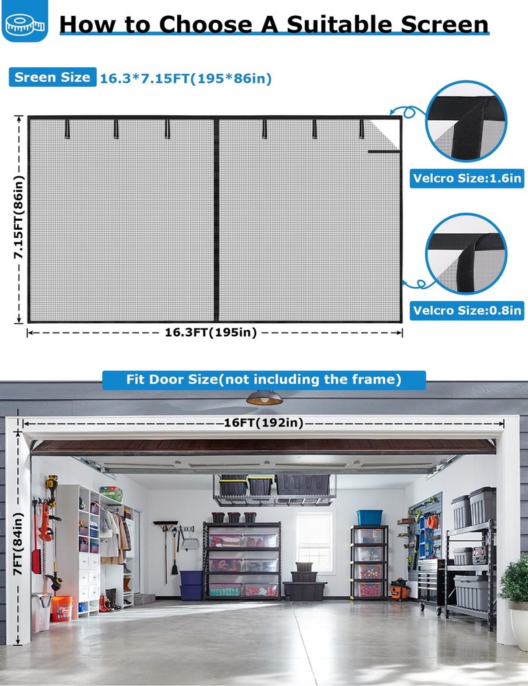 Introducing the Magnetic Garage Door Screen, designed for 2 car garages up to 16x7 FT. This adjustable hanging screen door is perfect for doors up to 194" x 84". The screen door features 36 strong magnetic strips for easy opening and closing, and 16 weighted sticks at the bottom ensure a tight seal, even in windy conditions. The door net screen is lightweight and durable, making it ideal for kids and pets. Installation is a breeze with the full-frame magic tape design, and the screen is retractable for temporary off-season storage. The heavy-duty fiberglass construction is fire-retardant, scratch-resistant, and tear-resistant. With a one-year warranty, you can trust in the quality and durability of this product. Measure your door frame before ordering to ensure a perfect fit. Measure Door First: The magnetic garage screen door is 16.3x7.15ft. Fits door sizes up to 194"x 84". If your door measures 194" or less in width and 84" or less in height, then this adjustable hanging screen door will fit. Minimum sizing 188" x 82". Measure your doors before ordering(Only door frame)! The garage screen door can be used as a replacement for a fixed screen door and fits the front door, back door, interior or exterior door, patio, deck, terraces, porches, balconies, etc. Opens Easily & Closes Automatically: Equipped with 36 strong magnetic strips to make the mesh screen door instantly open and close automatically. Added to the mesh door are 16 extra weighted sticks at the bottom that allow the magnetic screen door to close seamlessly and stay seal tightly, and ensures the door net screen will not be blown open by the wind and 6 strapping tapes are directly sewn on the garage door screen. It is convenient for vehicles to drive in and out. Easy to Install and Remove: The garage door curtain is simple and quick to install. Our screen curtain uses the full-frame magic tape design. No tools required, simply peel the adhesive backing off, apply for the door frame. Extra push pins are included for added security and strength. For best adhesive results, clean and dry the surface properly. The screen is retractable, frameless, detachable, twistable, and foldable for temporary off-seasons storage temporarily. Kids & Pets Friendly: The magnetic garage screen door net is durable, which can withstand thousands of entrances and exits. The mesh screen door is lightweight, allowing kids and pets to go inside and outside of the house freely. The magnets seal the gap together quickly, so you don't need to physically close the screen door after your pets go in or out of it. Durable & High Quality: The garage door screen is made of heavy-duty fiberglass with long service life, which is fire-retardant, scratch-resistant, tear-resistant, and washable. Compared to other screen doors that use nylon or polyester, fiberglass mesh is more durable and more substantial. The unique widen and reinforced line design at the top of the screen protects the door from tearing, giv