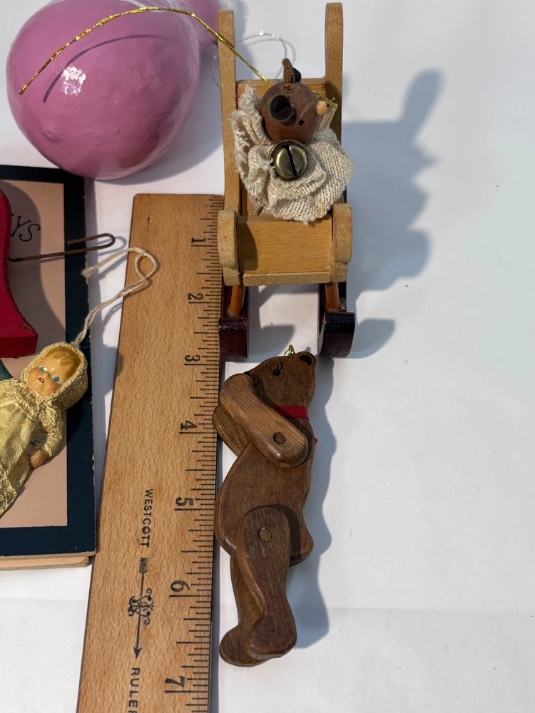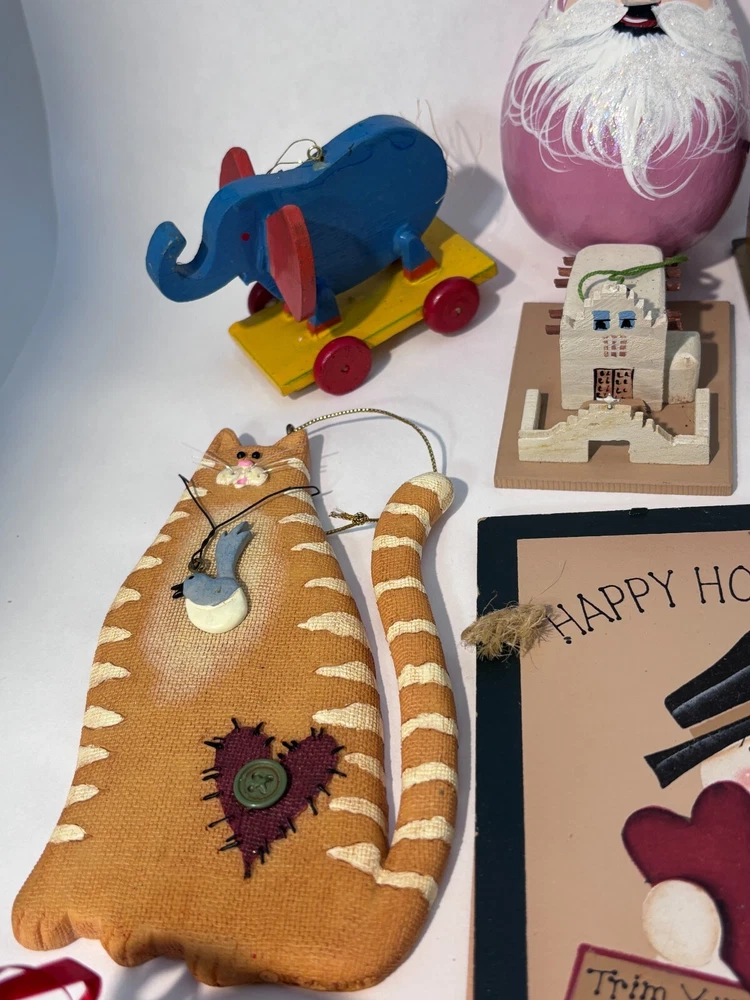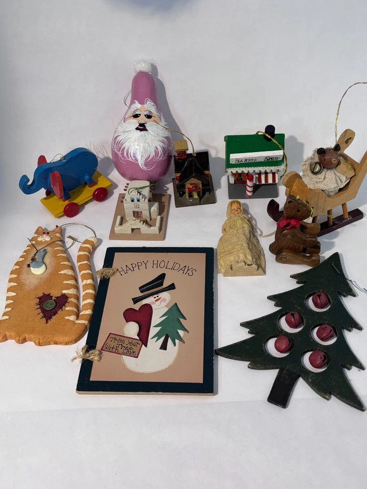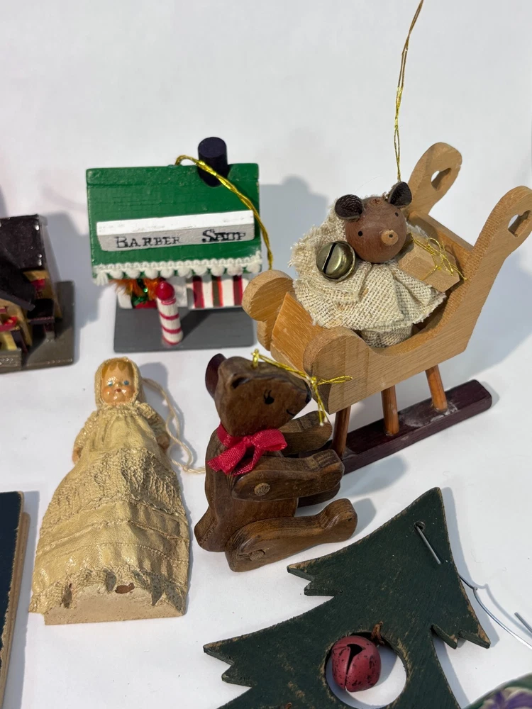 17 Assorted Wooden Christmas Ornaments Bears Trees Birds Hand Painted Carousel The set includes a yellow cat, a card "Happy Holidays", a Tree with bells, a bear with articulating arms and legs, a doll, a house, an elephant on a cart with wheels, A Santa , a house, a barber shop, a bear in a carriage, a penguin, a carousel with carolers, an egg, a red bird, a hand painted ball, and an anchor "1995". Thank you for shopping with me. Please see photos for exact details of the item and please feel free to contact me for more information or for additional measurements. Very quick shipping, same day or next day. Liz at Blackberry Morning Resellers