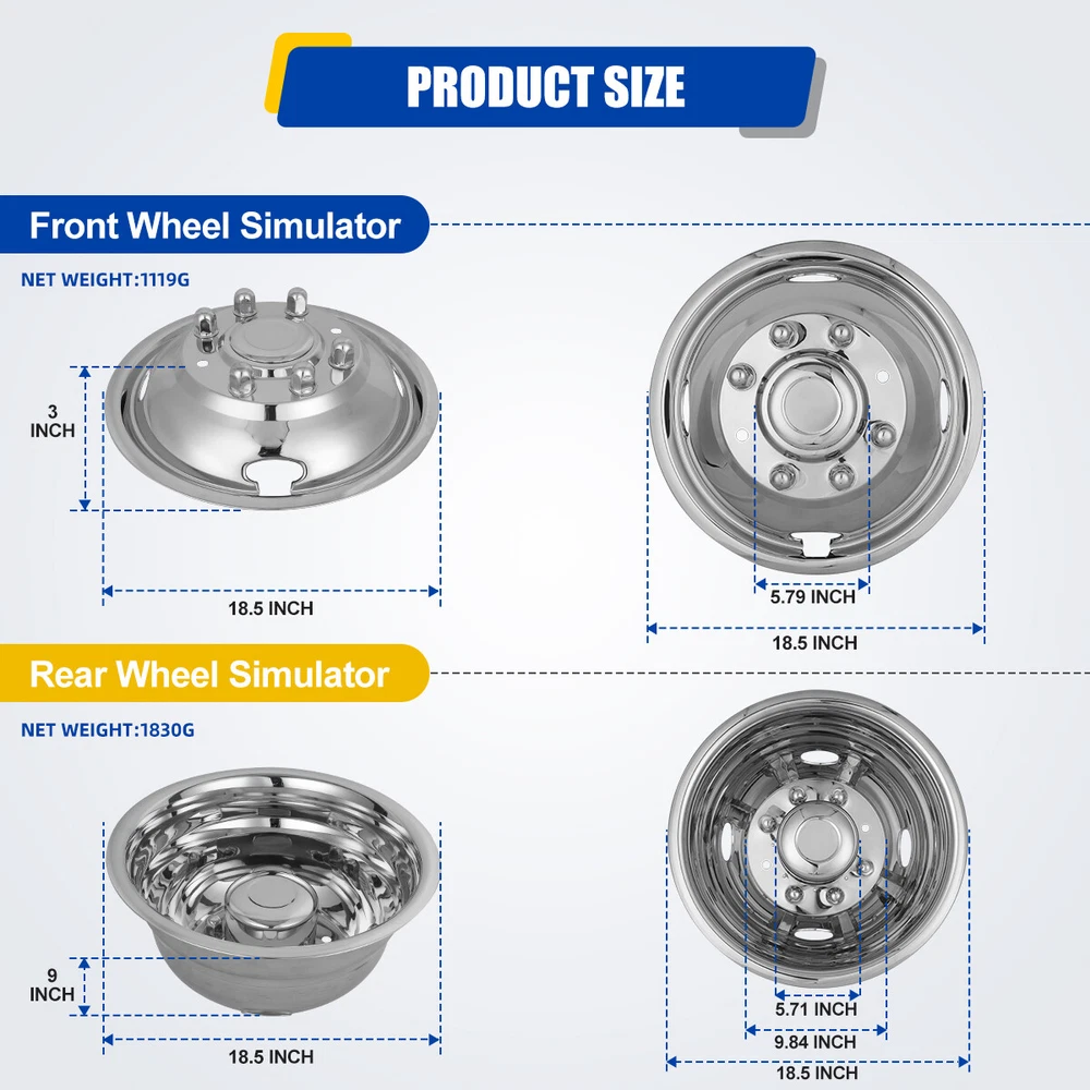 17" Dually Steel Wheel Simulators for 2005-2024 FORD F350 Dual Rim Liners Covers 【NOTICE】 To save your precious time, please ensure the size, color, and other information before making a purchase. If you have any questions, please feel free to contact our customer service at any time. Fitment For 2005-2024 Ford F350/F-350. Feature Made of high quality 304 Stainless Steel and Polished keep away from stains, fading, dirty. Give any vehicle a unique, aggressive look at a fraction cost. The product undergoes rigorous mechanical testing before leaving the factory to ensure the best performance and enhanced durability. Easy to install ,Lifting the vehicle is not necessary for installation. Easy care and maintenance ,You will just be able to wash off with soap and water and they will keep their shine for years! Specification Type: Hub caps. Color: Silver. Material: Stainless. Compatible Wheel Diameter: 17 in. Installation Type: Bolt on truck. Design: 8 Lugs 5 Hand Holes Dually Wheel Simulators. Packages Dimension: 19.09 *19.29*12.4 Inch. Packages Weight: 16.53 lbs. Packages Included Set of 4 Dually Wheel Simulators Installation Tool Kit Payment Delivery details Terms of sales About us Contact us Payment 🀟 We accept PayPal (Recommended), credit card, VISA, Google Pay & Discover etc. 🀟 Please submit your payment within 7 days after your purchase. 🀟 If not, eBay will automatically open an Unpaid Item Dispute on our behalf if the item(s) are not paid within 7 days. Delivery details 🀟 Please double check your delivery address and contact information. 🀟 All items will be shipped within 1 business days after payment received. 🀟 Tracking numbers will be easily accessible ASAP they are created and processed. Terms of sales 🀟 Free 60 days Return, we will cover the return post fee. 🀟 If a defective product was received, please do not hesitate to message us via eBay message. 🀟 We will response in 24 hours in business to resolve the problem 🀟 We stand behind our products. Items can be returned for exchange or full refund within 60 days from the date you receive. About us 🀟 Winjet has a huge warehouse and office located in the United States. 🀟 All US domestic 48 states customers are able to benefit from the FREE SHIPPING services. 🀟 Our experienced, professional customer service representatives offers prompt and courteous service. 🀟 Best quality products, outstanding services and professional experience keep our customers. Contact us 🀟 Please feel free to contact us if you have any problems. 🀟 Emails will be replied within 24 hours in working days. 🀟 After hours emails will be replied on the next business day. Brand WINJET Color Polished Stainless Steel Type Wheel Simulators Manufacturer Part Number 0085 Placement on Vehicle Front, Left, Rear, Right Material Stainless Steel, Steel Superseded Part Number 8 lugs 4 Hand Holes Dually Wheel Simulators, 17" 2005-2024 F350 Bundle Listing No Vintage Part No WHAT IS INCLUDED 2 FRONT & 2 REAR BOLT ON SIMULATORS & HARDWARE Interchange Part Number 3615, 8 Lug bolt, 200mm, chrome, SD, deep dish, F450 front rear deep dish chassis cab R17 tires Manufacturer Warranty 1 Year OE/OEM Part Number 2005-2024 F350 8 lugs 4 Hand Holes Dually Wheel Simulators Number in Pack 4 Features Anti-fade Protection, Car Wash Safe, Easy to Install Country/Region of Manufacture United States Universal Fitment No Finish Polished Stainless Steel Compatible Wheel Diameter 17 in Performance Part No On Feb 20, 2025 at 23:37:34 PST, seller added the following information: