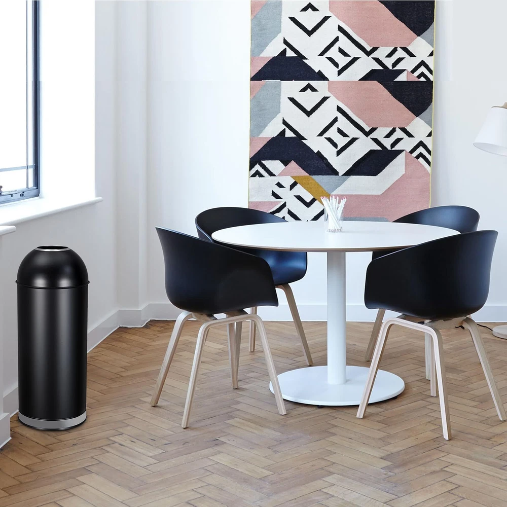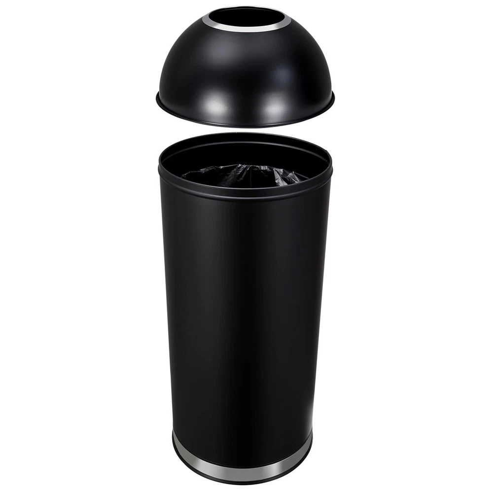 【Large Capacity, Heavy Duty】17 gallons/65 liters, this trash can is suitable for both domestic and commercial environments and meets different disposal requirements. This commercial trash can is constructed from sturdy rolled steel to withstand changes in time and temperature for unwavering strength. 【Streamlined Design】The high lid design elegantly covers the entire garbage bag, bringing exquisite and seamless visual appeal. 【Wide Open Lid & No Touch】 Lidless design makes throwing out the trash easier than ever, no more worry about using the pedal or touching the lid of the trash can, great for preventing exposure to germs, wide mouth design allows larger items to be thrown out. 【Easy to Maintain】The jar features a black matte finish that is easy to clean and effectively hides fingerprints and smudges for a consistently stylish look. 【Floor Friendly Design】Anti-slip base provides stability and will not scratch the floor, holding the trash can securely in place. 【Product size】14*14*35 in Product weight: 12.6 lbs