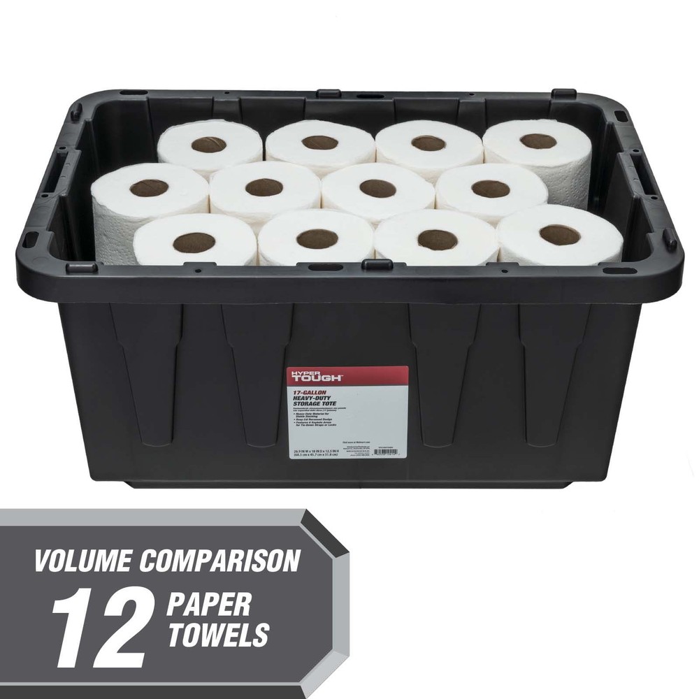 Organize clutter and hide unused items with the 17 gallon snap-lid storage tote. Made of durable polypropylene, the black storage tote allows you to hide away things you don’t want to be seen while the red snap-lid adds a of color to your space. The 2-point snap-lid ensures your items are safely secure during storage or transport. The specially molded lids allow you to stack multiple totes on top to prevent toppling and maximize storage space. Protect your valuable by utilizing the 6 tie-down holes made for zip-ties and padlocks. The long lasting tote works great in basements, closets, pantries, sheds, barns, and attics. This tote is great for organizing household products, gardening supplies, pet treats and supplies, shoes, clothing, seasonal gear like boots, sporting equipment such as golf balls, tennis balls, or drill cones, and many other items. Sturdy black plastic construction resists rust, dents, stains and peeling to ensure lasting use Stackable lid design creates stability and reduce toppling when multiple units are stacked Lid lip keeps your content from spilling or falling out Lockable Lid comes with 6 holes ideal for zip-ties or padlocks to keep your items safe and secure Exterior Dimensions - 26.9 IN Wx 18 IN Dx 12.5 IN H (68.3 cm x 45.7 cm x 31.8 cm) Easy to clean surface Indoor or Outdoor use Made from recycled materials Reusable Set of 1 – Includes 1 black base and 1 red lid Weight – 5.4 lbs