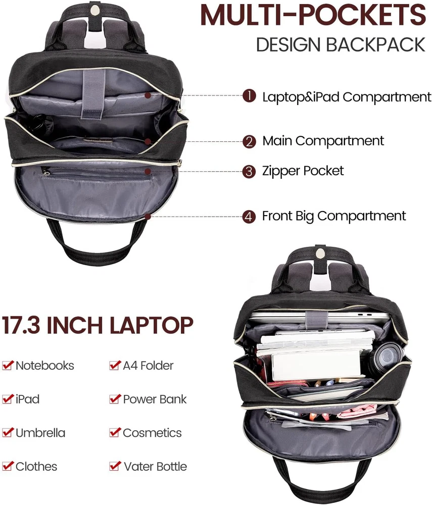 Fast Shipping Great Customer Support Satisfaction Guaranteed DESCRIPTION Shipping Shipping Shipping All domestic packages are shipped for Free (Unless other shipping method was selected during the checkout) Most items ship and arrive much sooner than the estimate delivery date. Usually within 2-3 days from payment. However, we have longer estimates to compensate for the occasional delay or supply chain breakdown. We do not accept P.O. BOXES - PLEASE PROVIDE A PHYSICAL ADDRESS Return Return Return In the event that you would like to return your purchase, we allow returns that are processed within the defined return date (the return date is to be found in the return policy/shipping and handling section) Please contact us for a return authorization and the return shipping address. Payment Payment Payment PayPal is our preferred method of payments it's the quickest, easiest and most secure way to pay for your goods or services online. PayPal offers buyer and seller protection should there be a problem. If you do not have a PayPal account, to get started and buy your first item with us is very easy. Simply click on the 'Buy It Now' button and follow the eBay checkout steps. Select PayPal as the payment method you then will be given the chance to enter your card details in to PayPal's secure checkout in order to pay for your order. Once the payment has been made, you will then be given the opportunity to make your own PayPal account to make paying for your items in the future very easy. Should there be a problem with payment please do let us know. Feedback Feedback Feedback Customer satisfaction is very important to us. If you have any problem with your order,please contact us and we will do our best to make you satisfied, please do not leave a negative feedback before we resolve your problem. We guarantee that your issue will be solved quickly. As long as you are happy with your purchase of , please leave us a positive feedback. Your feedback is very important to us it affects our search placement on eBay. We will leave a positive feedback for you in return automatically once we receive your feedback. Contact Us Contact Us Contact Us If you have any queries, please contact us via ebay. We usually respond within 24 hours on weekdays. Thank you for visiting our ebay store! 【LARGE CAPACITY】Backpack purse for women has 6 compartments and more than 26 pockets, among which the spacious main compartment can hold daily necessities, university textbooks, magazines and clothes. 2 front compartments provide ample space to organize pens, cards, notebooks, wallet, sunglasses and more. Side pockets hold water glasses and umbrellas. Size: 13"L 19"H 7.8"D. weight: 2.29lb. 【LAPTOP PROTECTION】The laptop backpack is designed with 17.3-inch laptop separate compartments and a 12.9-inch iPad slot; with cushioned cotton sewn around, it maximizes physical protection of your electronic devices. 【USB PORT DESIGN】The lovevook backpack features a built-in USB charging port, making it easy to charge your phone while walking or traveling. (Power bank not included.) No need to hold your power bank in your hand, simplifying your life and travel experience. 【COMFY & STURDY】Made of waterproof and durable nylon fabric, which is lightweight and easy to clean. This travel backpack features luggage straps for hands-free travel. It's compact yet roomy enough to fit in an airplane luggage rack or under a seat, ensuring everyone can ride with ease. Its shoulder straps are padded with high-quality foam, breathable and pressure-relief, providing you with maximum comfort when the pack is full. 【MULTI-PURPOSE BACKPACK & PERFECT GIFT】The weekend bag allowed to take on the plane is perfect for work, business, mountaineering, daily use and outdoor activities, ideal daypack for nurses, teachers and business people, perfect gift choice for everyone. 【No-Risk-Purchase & Quality warranty】: Users'feelings are what we care about most.We LOVEVOOK laptop backpack for women provide a 12-hour customer service, 30-day no-reason return and 1-year warranty policy. 17 Inch Womens Anti-Theft Laptop Backpack - Waterproof Travel Daypack Click here to see description Fast Shipping Great Customer Support Satisfaction Guaranteed DESCRIPTION Shipping All domestic packages are shipped for Free (Unless other shipping method was selected during the checkout) We ship within two business days of payment, usually sooner Standard FREE shipping takes between 3-5 business days Expedited shipping takes between 2-3 business days Overnight shipping takes between 1-2 business days We do not accept P.O. BOXES - PLEASE PROVIDE A PHYSICAL ADDRESS We Ship Globally using ebay's GSP, the item is sent to a logistic center in KY and shipped from there to the rest of the world. International customers are responsible for all duties and taxes Contact your local authority for questions related to the amount of duties or taxes you will be responsible for Return In the event that you would like to return your purchase, we allow returns that are processed within the defined return date (the return date is to be found in the return policy/shipping and handling section) Please contact us for a return authorization and the return shipping address. Please contact us for a Return Merchandise Authorization (RMA) number. We advise you to use a reputable carrier service when returning your goods. Please pack all returns appropriately. We ship globally Via eBay's global shipping program (GSP). Thus we don't cover returns for items shipped globally. Buyers returning such items will be refunded ONLY for the item's cost and not for the shipping. please check the Voltage information and make sure it matches the one in your country. In case it's not stated in the description, do ask us. Payment PayPal is our preferred method of payments it's the quickest, easiest and most secure way to pay for your goods or services online. PayPal offers buyer and seller protection should ther
