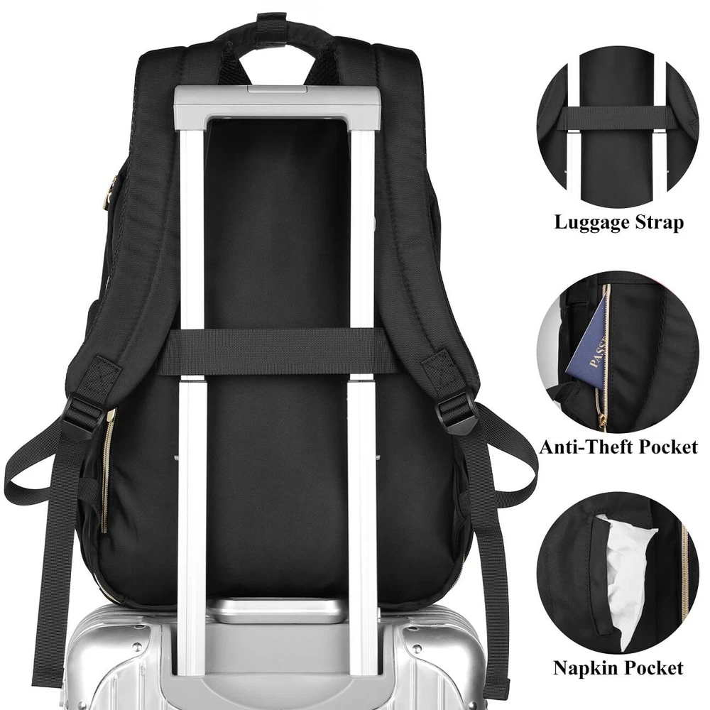 Upgraded Waterproof Fabric The texture is more detailed,the touch is softer,and the fabric is more shiny.There is a support at the bottom of the backpack,which can keep standing when not carrying things. Power Bank Pocket There is a special pocket for storing the power bank inside,so that it can be stored stably in the laptop backpack and will not be disconnected due to bumps. Upgraded Side Pocket The upgraded elastic side pocket can hold water cups and umbrellas.Its unique paper drawing design can perfectly fit the napkin. Details of Backpack Size:18.6*13*5.9in Capacity:35L Weight:1.6lbs For girls and women Laptop:13.3",14",15.6",16",17",17.3" Occasion:School Work Travel Package includes Womens Backpack x 1 USB X 1 【SIZE AND CAPACITY】18.6 x 13 x 5.9 IN.35L.Ideal for school,office work,city trip,business travel.Separate laptop compartment for 13.3,14,14.4,15,15.6,17.3 inch Laptop/Macbook.Tablet compartment for 9.7,10.2 inch. 【TSA AND LUGGAGE BELT】TSA-Friendly Backpack is exclusively designed for airplane flight travel.At checkpoint,unfolds the laptop travel backpack freely 90-180 degree and the laptop stays flat without taking it from the bag.Luggage belt on the back is great to slide over the luggage tube and attached to your rolling luggage securely for easier transport.The back anti-theft pocket protects your personal items well. 【WATERPROOF AND FASHION TRENDS】Fabric of the womens bookbag is superior to the ordinary Oxford fabric on the market.Soft to touch,waterproof and shiny.Checker Embroidery Design,in line with the current market trend.Best gift of backpack for women. 【USB NEW DESIGN】With the built-in charging cable inside,this usb backpack offers you a more convenient way to charge your phone while walking.Compared to other ordinary USB exposed, we wrapped the USB connector hole with fabric,the school backpack looks more elegant and beautiful. 【MORE DETAILS】Premium brown and white quality striped lining,pen insert pockets for work and school,interior mesh pocket for easy storage,and a key fob to store your keys.(Age:over 3 years old)