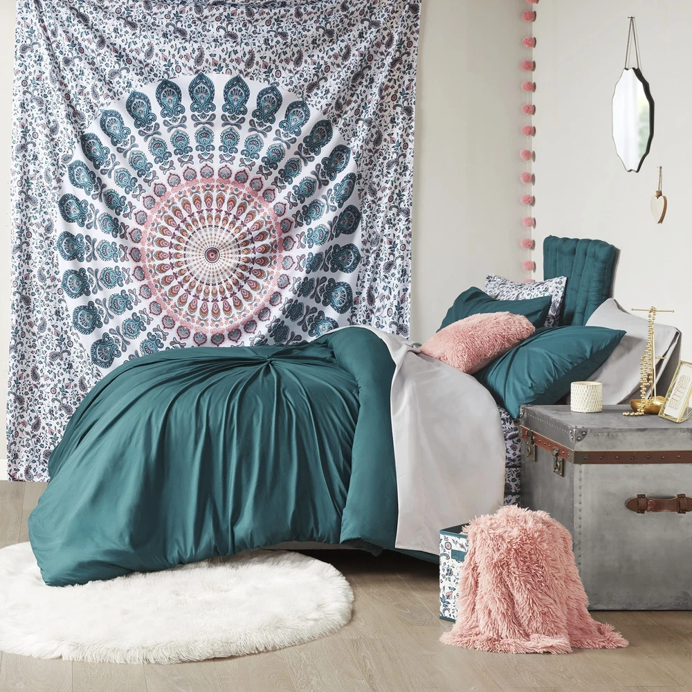 Start your new beginning with our dorm essential pack to keep your spirit up with beautiful and comfortable bedding set! The comforter set comes with innovative and matching organizers. The matching under storage bed, cubby and sheet with pocket will free yourself from clutter to stay effective, focus and increase productivity. The set also comes with headboard pillow and matching throw for added convenient and comfort. It comes in a gift ready bundle; perfect for graduation and off to college presents. Start your new beginning with our dorm essential pack to keep your spirit up with beautiful and comfortable bedding set! The matching understorage bed, cubby and sheet with pocket will free yourself from clutter to stay effective, focus and increase productivity. The set comes with headboard pillow and matching throw for added convenient and comfort. Set includes: 1 Comforter: 88"W x 92"L, 2 Standard Shams: 20"W x 26"L, 1 Flat sheet & Tapestry: 90"W x 102"L, 1 Flat sheet: 90"W x 102"L, 2 Fitted sheets: 60"W x 80"W + 13"D, 4 Pillowcases: 20"W x 32"L, 1 Headboard pillow: 24"W x 30"L, 1 Throw: 50"W x 60"L, 1 Pillow: 16"W x 16"L, 1 Bedside Caddy cardboard: 17"W x 14"H, 1 Collapsible Storage Cube: 10.5"W x 10.5"L x 11"H, 1 Under bed storage bag: 23"W x 15"L x 15"H For your convenience bedding set is machine washable. Do not use bleach. Pillow is spot clean only. Commercial size washer and dryer is recommended for best result.