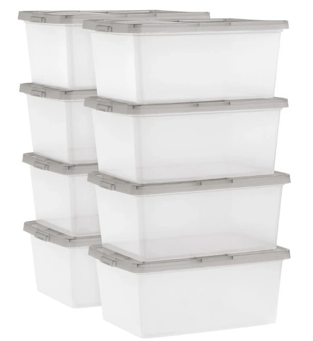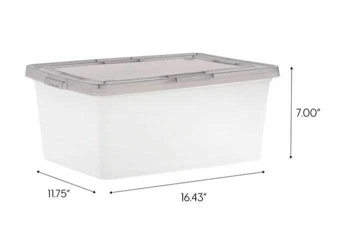 17 Qt. Plastic Storage Bins with Lids, Clear, Stackable Totes, Containers 8Pk About this item Clear Design: Transparent plastic allows for easy identification of contents without opening the lid. Secure Latching Lids: Each bin comes with a secure latching lid to keep contents safe from dust, dirt, and moisture. Stackable Design: Bins are designed to be stackable, maximizing vertical storage space and keeping areas organized. Durable Construction: Made from high-quality plastic for long-lasting durability and reliability. Modern Aesthetic: Clear material offers a sleek and modern look that blends seamlessly with any décor. Multipurpose Use: Perfect for storing seasonal clothing, holiday decorations, craft supplies, toys, tools, and more. Space Optimization: Stackable totes help you make the most out of limited storage space in closets, basements, and garages. Easy to Clean: Smooth surfaces make the bins easy to clean and maintain. Portable: Lightweight design with ergonomic handles for easy lifting and transporting between different storage areas or rooms. Highlight Volume Capacity:17 qt Material: Plastic Age group: Adult Color: Gray Assembled Product Weight: 1.053 lb Assembled Product Dimensions (L x W x H): 16.44 x 11.75 x 7.00 Inches