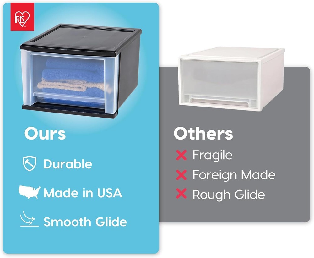 About this item MADE IN USA with global materials - The IRIS USA plastic stacking drawers offer a practical storage solution for any room in your home. Keep small, similar things together or use them for storing frequently used and replenished items such as diapers, snacks, vitamins and medicine, craft supplies, and more. PERFECT ORGANIZER - Use the sliding drawer to get your closet, bathroom, craft room, or that needs organizing in order. The drawer allows for easy access to stored items in the kitchen, helps create a storage solution for your craft room, or use it in a nursery to store diapers, onesies, bottles, and whatever else you need. MULTI-FUNCTIONAL - Keep your frequently used items within reach by storing them in the IRIS USA plastic stacking drawer. The clear material of the drawer make it easy to check what's inside, while the coral frame provides some privacy and makes it easier to store items in a way that's not distracting. STACKABLE - The stackable design allows you to create your own unique storage solution, either by stacking multiple to create your own tabletop storage cabinet or by spreading them out amongst any rooms that require more storage space. The choice is yours. GREAT SIZE - Dimensions: 14.3”L x 12.05”W x 8.39”H (Inside: 11.88"L x 11.75"W x 7"H)、 Materials & Care Material Features BPA Free Material Type Plastic Measurements Storage Volume 0.83 Cubic Feet Number of Compartments 4 Package Quantity 1 Weight Supported 15 Pounds Unit Count 4.0 Count Item Weight 2.21 Pounds Number of Items 4 Item Dimensions L x W x H 12.1"L x 14.3"W x 8.4"H Capacity 17 Quarts Style Shape Rectangular Occasion Any Pattern Drawer Style Name Drawer Color Black Features & Specs Water Resistance Level Water Resistant Opening Mechanism Slide Closure Type Drawer Additional Features Stackable