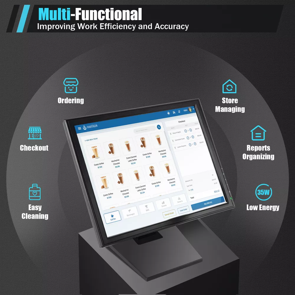 17" Touchscreen Monitor LCD Display VESA Standard Hole Pattern 4:3 Standard LED Description Are you still using an old button-operated cash register, feeling a headache due to its blurry small screen and complex button operations? Let our LCD touch screen monitor take you into a more advanced and technological world! The 17-inch touchable screen allows you to engage in various cash and sales activities like using a mobile phone, bringing you an unparalleled convenient experience. It will be the secret to making your store more efficient, a tool to improve your work efficiency, and a helper that every store should have! Key Features Sensitive Touch: The sensitive touch screen can recognize the handwriting pen, fingers, fingers with gloves, etc., and can recognize multiple types of touch, which is ideal for adapting to the operating habits of different people. Strong Compatibility: Its multiple ports at the bottom include VGA, DC, and USB, and it is compatible with various versions of Windows and can integrate with various POS machines, clients, or PC systems. Adjustable Angle: The bracket with an adjustable viewing angle can easily tilt from 0 ° to 90 °, with 140 ° vertical and 160 ° horizontal viewing angles respectively, providing you with a multi-dimensional visual experience. Large & Clear Viewing: A 17-inch display provides more operating space for you, and a high resolution of 1280 * 1024 makes the patterns and fonts on the screen easier to read, making it suitable for long-term viewing. Multi-Functional: It not only enables quick organization of basic functions such as ordering and checkout, but also enables various management of the store's offices, organizing various data reports, effectively improving work efficiency and accuracy, and achieving orderly operation of the store. Easy to Clean: The smooth touch screen can be easily wiped clean, and dust or dirt can be removed by gently wiping with a cloth. Low Energy Consumption: The power consumption of this product is only 35W, which can save you more electricity bills. Selected Material: The high-quality environmentally friendly ABS shell is wear-resistant and has high hardness, which can be used in the store for a long time to provide you with convenience and does not require excessive maintenance. Details Ultra Thin Body: The 0.92in ultra-thin shape not only makes its overall appearance more elegant but also occupies a small area, making it very suitable for placing on the front desk of a store. Carefully Designed Base: The large base(6.7/8.46*8in) makes it more stable, and anti-slip pads at the bottom also provide double protection for its stability. The reserved suspension holes also allow for a wider range of installation methods to meet the needs of more stores. Heat Dissipation Hole: The large area of heat dissipation hole at the top can effectively enhance the heat dissipation performance of the product, thereby ensuring the smooth and normal operation of the display screen. Application It is very suitable for placement in coffee shops, bakeries, supermarkets, restaurants, bars, gyms, warehouses, and other places, and can be connected to other devices through various built-in interfaces to improve work efficiency. It can also connect industrial automation equipment, monitoring center equipment, self-service query equipment, and medical equipment. Specifications Material: ABS Color: Black Style: Modern Voltage: DC12V, AC 100-240V Current: 2.6A Power: 35W Aspect Ratio: 4:3 Screen Standard: 43cm/17in Installation Method: Countertop Installation Monitor Type: Touch Screen Monitor Format: 4:3 Standard LCD Maximum Resolution: 1280*1024 Contrast Ratio: 800:1 Brightness: 300cd/㎡ Response Time: 5ms Horizontal Viewing Angle: 160° Vertical Viewing Angle: 140° Base Size: 17(Short)/21.5(Long)*20.5cm/6.7/8.46*8in Screen Size: 38*30.5cm/15*12in Screen Inner Size: 34*27cm/13.38*10.63in Gross Weight: 6.15kg/13.55lbs Net Weight: 4.85kg/10.7lbs Package Size: 47*42*18cm/18.5*16.5*7in Package Included 1 * LCD Touch Screen Monitor 1 * Power Adapter 1 * Power Cord 1 * VGA Cable 1 * USB Cable 1 * Stylus Pen 1 * English Manual 1 * CD Notes Please carefully read the manual and strictly follow the precautions to have a better experience. Please note that this product does not have an HDMI port. Please allow the slight color difference caused by the shooting light and 1-3cm error due to manual measurement, and make sure you do not mind before you order. Payment Delivery details Terms of sales About us Contact us Payment We accept ebay payment 。 Fees such as import duties, taxes are not included in the item price or shipping costs. These charges are the buyer's responsibility. Delivery details Shipping: 2-9 working days to: USA Terms of sales We maintain high standards of excellence and strive for hundred percent customer satisfaction. Feedback is very important to us. We hope that you contact us immediately before you give neutral or negative feedback, so that we can address your concerns. It is impossible to address issues if we do not know about them! About us Your satis faction is our ultimate goal. We work hard to earn your trust and future business. Our certified technicians have tested each item before shipping. The unit comes with 1 year limited warranty on all manufacturing defects. a) If you receive a defective item, you may return it or ask for a discount. Please contact us within 14 days after you receive the package. b) What you returned must be intact and in its original packaging as re? u. Customer is responsible for shipping costs of the returned item. c) We will cover the cost of shipping back t with the shipping rate indicated in the registration page. We will send you a new unit or refund the full payment you paid. Thank you. Contact us Business Hour Business Hour: Monday To Friday: 8:30 AM to 5:00 PM (Beijing China time) Due to time zones, our reply to your questions may not be immediately. But within above working time,