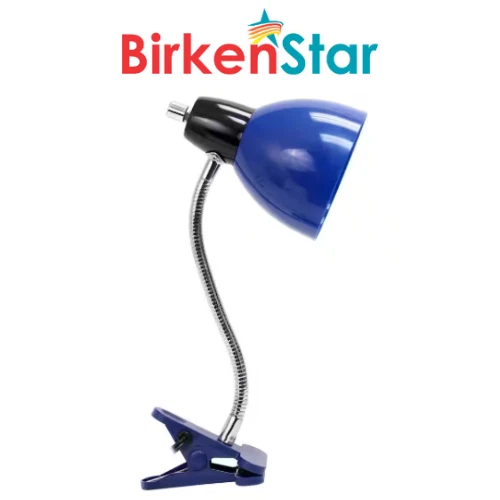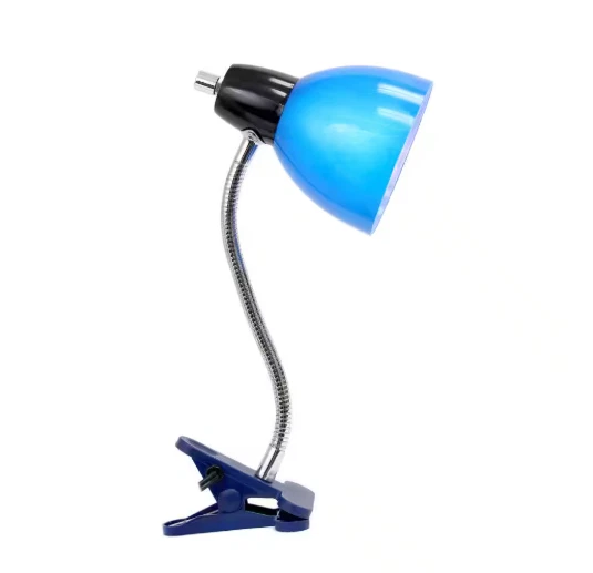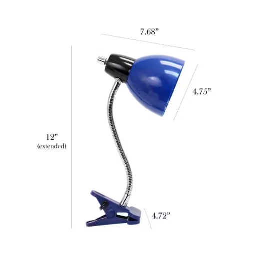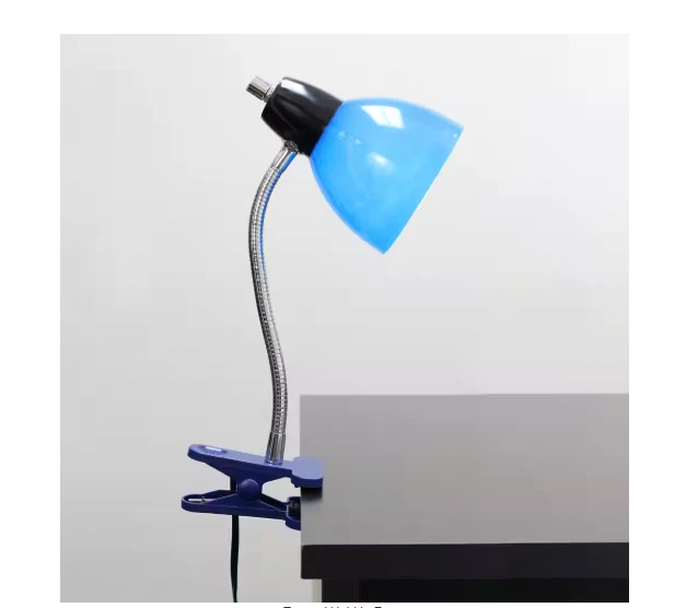 17 in. Blue Clip On Clamp Light with Black Base, Reading, Desk Lamp About This Product This fun and funky lamp features a fully adjustable arm with the right pop of color to make this a perfect light for your home, office, or dorm. The ciip feature allows you to use this light on more than just your desk top or night stand, with a wide light display. Modern style will compliment any space. Highlights Plastic clip and shade Flexible metal gooseneck Rotary switch on shade Uses 1 x 25-Watt type A medium based bulb (not included) L: 6.32" x W: 4.31" x H: 17" - Shade D: 5.75" - Clip opens 2" No assembly required Features a 5 ft. black cord