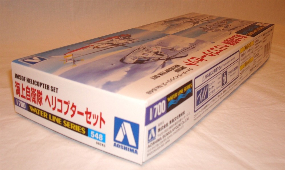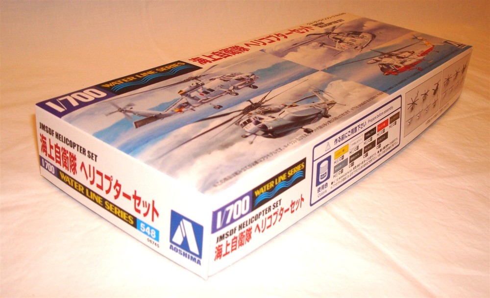 JMSDF HELICOPTER SET 1/700 MODEL KIT Aoshima Bunka Kyozai Co Water Line Series No. 548 1/700 scale helicopters - Sikorsky SH-60K Seahawk, MH-53E Sea Dragon, Kawasaki MCH-101, Mitsubishi UH-60J, and Boeing CH-47 Chinook Tiny models requires assembly with glue. May be painted to match box images. Decals and instructions included. New in original box Buying multiple items? Be sure to "Request total from seller" from your cart before paying to receive an adjusted invoice with reduced total S&H! Powered by SixBit's eCommerce Solution