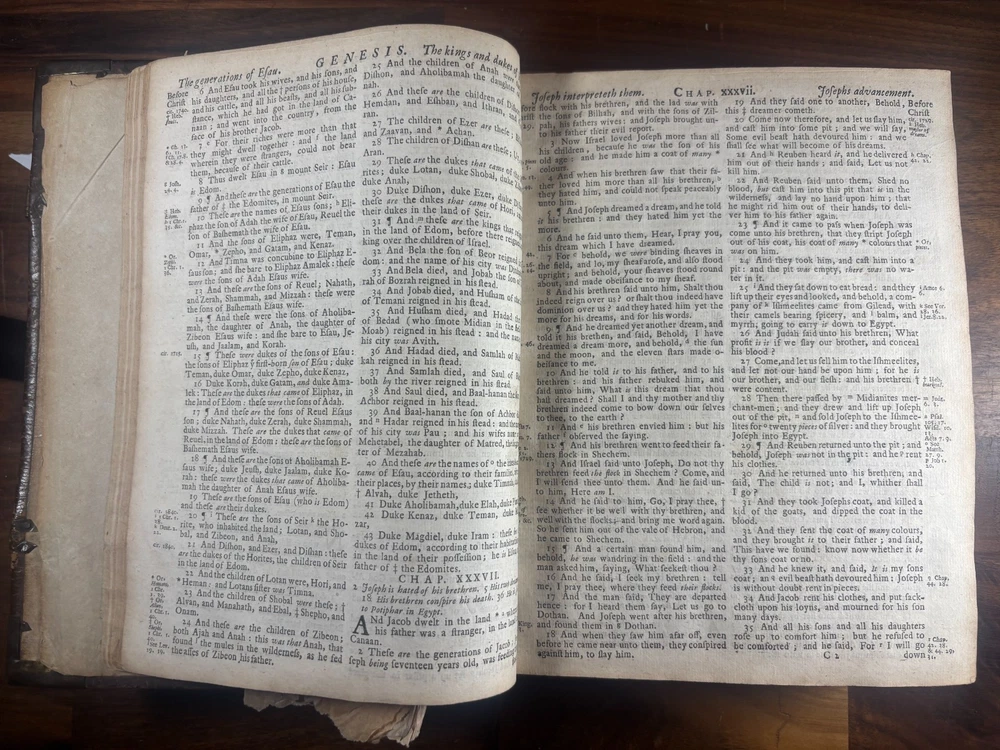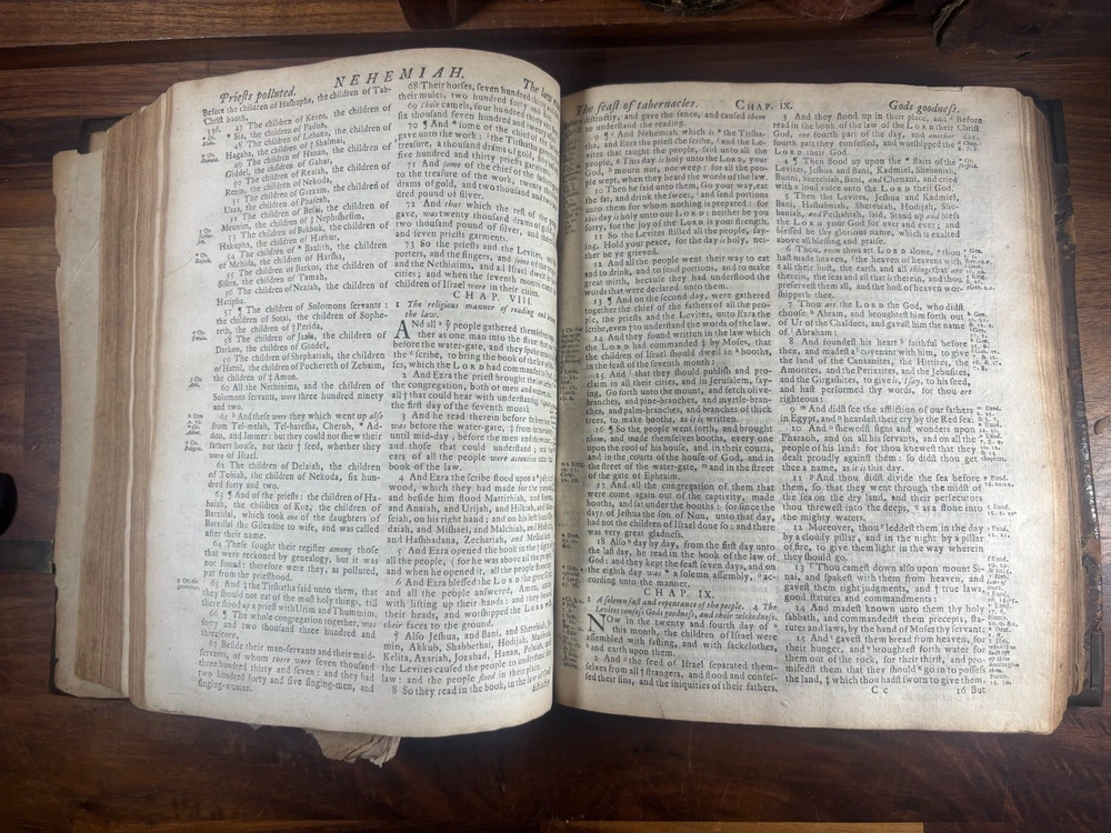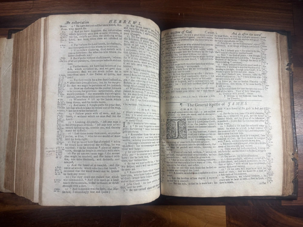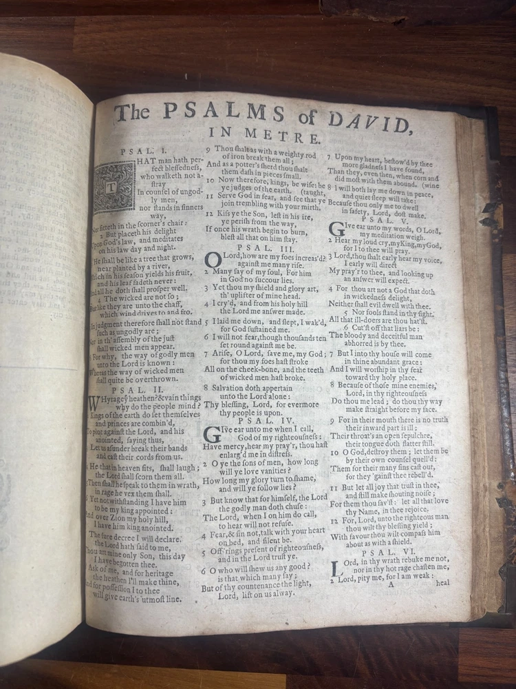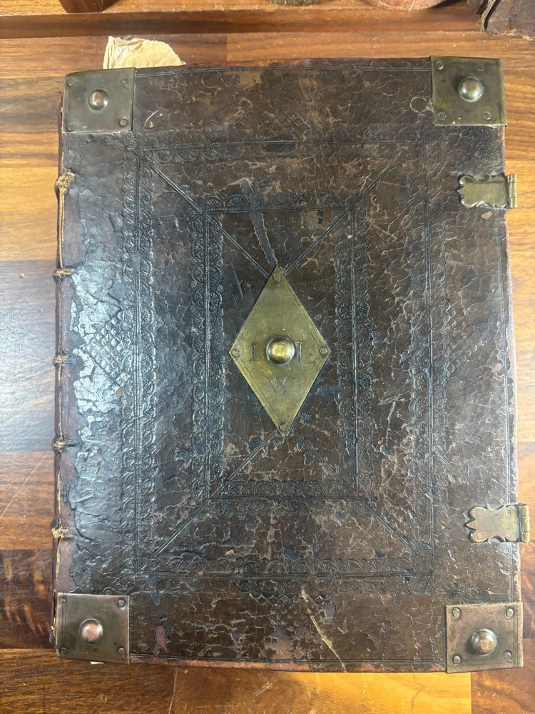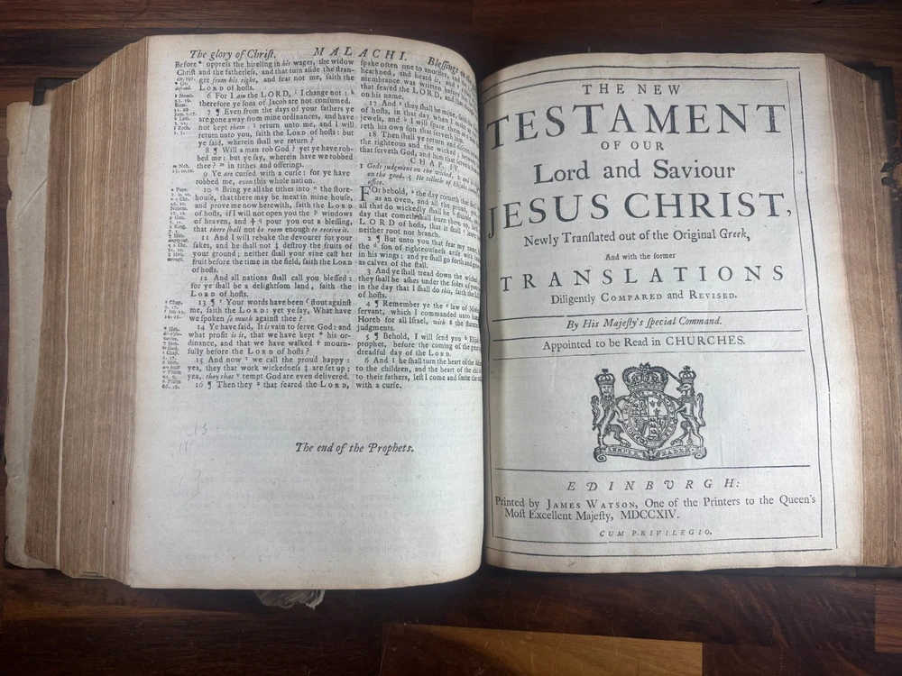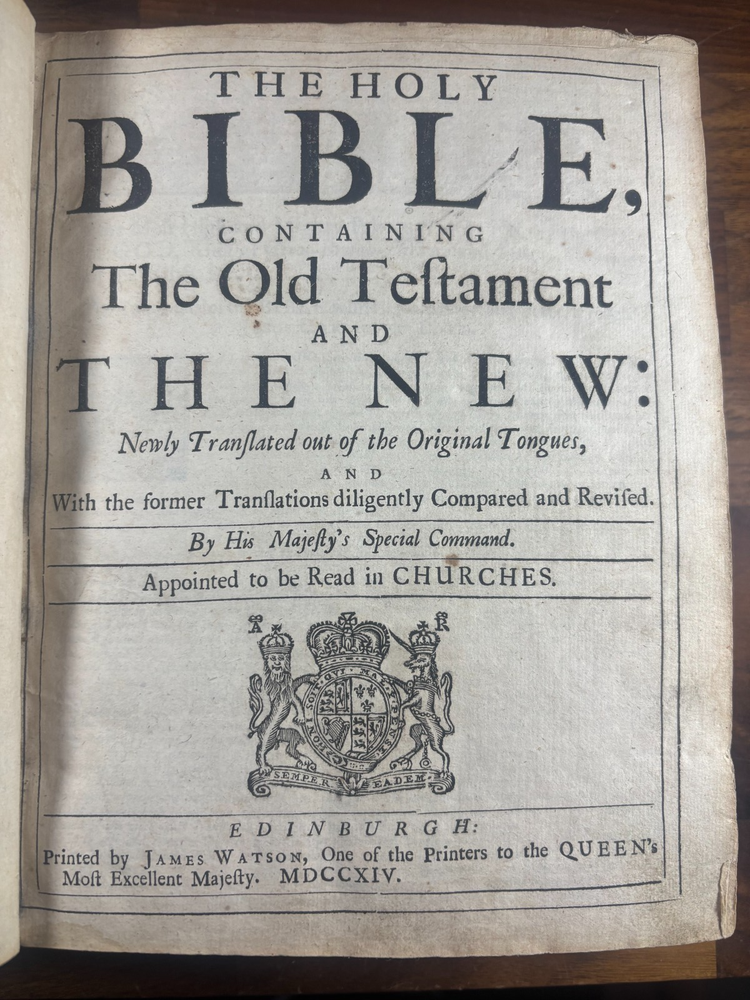 Short Description: This is an exceptionally rare 1714 King James Version Bible , printed in Edinburgh, Scotland by the notable royal printer James Watson , and catalogued as Herbert 930. This example retains its original early 18th-century leather binding with brass corner pieces and central boss , a feature seldom found intact. Of particular significance is the armorial bookplate of Colonel & Mrs. Forbes-Leith of Whitehaugh , a distinguished Scottish noble family. This firmly establishes historical provenance and adds meaningful collector value. Bibliographic Details Title: The Holy Bible Containing the Old Testament and the New Translation: King James Version Printer: James Watson , Printer to the Queen’s Most Excellent Majesty Place: Edinburgh Date: 1714 Reference: Herbert 930 Format: Quarto Binding: Contemporary paneled calf over boards with elaborate blind tooling and original brass corner bosses, central lozenge and original latches. Provenance: Armorial bookplate — Colonel & Mrs. Forbes Leith, of Whitehaugh Condition: (Please see above photos for more information on condition) Original binding. Text block complete pages age-toned but clean and legible. Evidence of careful historical use but no modern restoration. Some foxing and staining. Front cover is weak where it connects to the spine. All original metal working and tooled cover. 1 loose leaf that contains an inscription: These Bibls be longes to John he hath anthor of Montgomery Bourly of Bissop Tibborne Phillippes and som[t]hinge Coome Hadson perfect som by–layinge frends An outstanding example of an early Scottish-printed Bible in period binding with aristocratic pedigree. Historical Context: Britain & Scotland in 1714 The year 1714 was one of the most pivotal in British history. Queen Anne died that year, bringing an end to the Stuart monarchy and ushering in the Hanoverian era with King George I . Scotland was still adjusting to the Act of Union (1707) , and Jacobite sentiment simmered beneath the surface, soon erupting in the 1715 Jacobite Rising . Printed in this atmosphere of political tension and religious importance, this Bible represents a crucial moment in British and Scottish history—a nation transitioning between dynasties and identities. About the Printer: James Watson (d. 1722) James Watson is widely regarded as one of Scotland’s most important early printers. As Printer to the Queen , he was responsible for producing official and ecclesiastical works, including Bibles, statutes, and theological texts. Watson: Improved the quality of Scottish printing, which had lagged behind England Published influential works on the art of printing itself Ran one of the few presses capable of producing large-format Bibles in Scotland His 1714 Bible (Herbert 930) is considered one of the better-executed Scottish Bibles of the early 18th century and is relatively scarce compared to London and Oxford printings. Provenance: The Forbes-Leith Family of Whitehaugh The armorial bookplate inside this Bible belongs to Colonel John Leith Forbes-Leith (1820–1888) and his wife, prominent members of an old Aberdeenshire noble lineage. The Forbes-Leith family: Descended from Clan Forbes , one of Scotland’s historic highland families Held estates at Whitehaugh and were later associated with Fyvie Castle Served in military and civic leadership roles throughout the 18th–19th centuries Used supporters, mottoes, and heraldic devices seen in the bookplate (stags, mascles, bear heads, etc.) The bookplate motto “Laus Per Christum” (“Praise through Christ”) and the distinctive heraldic shield confirm this lineage. Owning a family Bible from such a household adds cultural and genealogical importance far beyond its bibliographic rarity. Dimensions: Weight - 1.63KG Height - 23.5cm Width - 19cm Thickness - 6.5cm