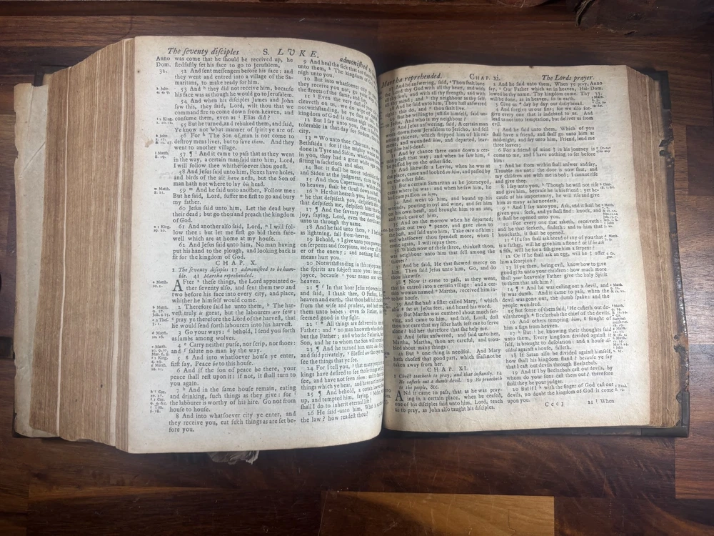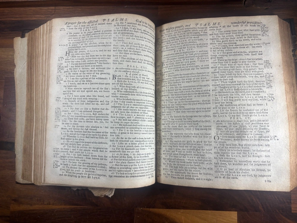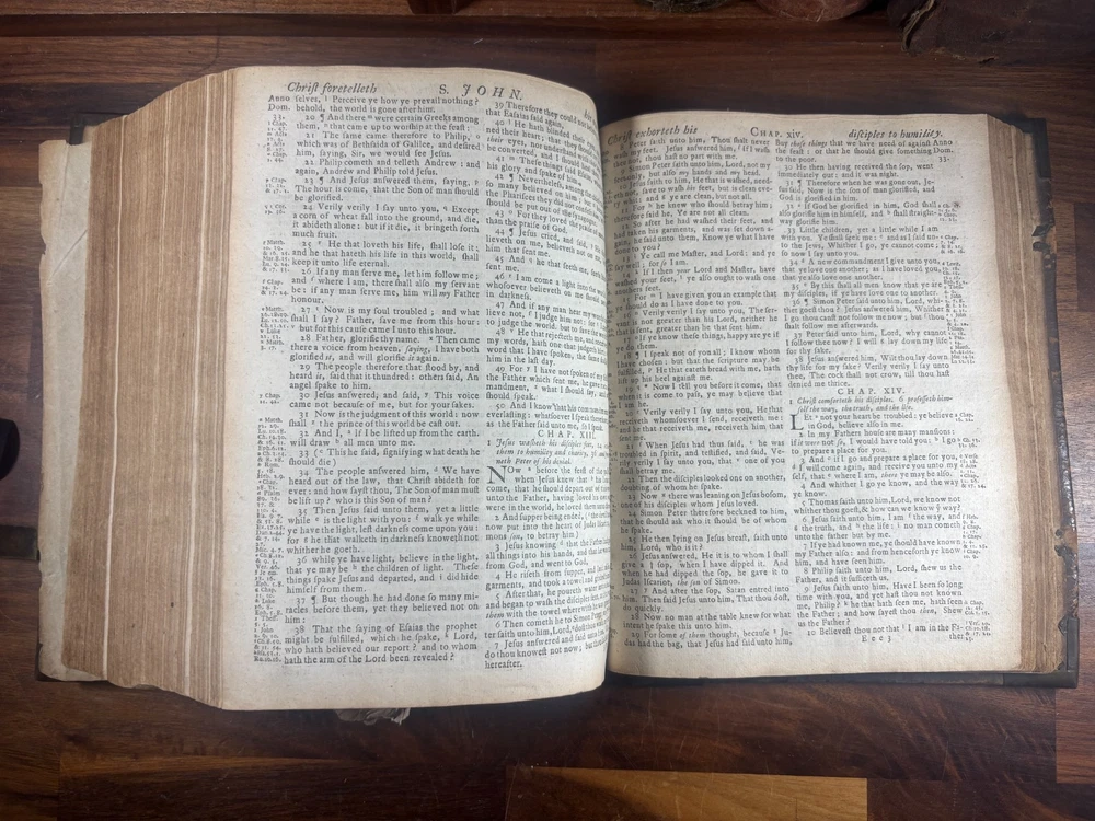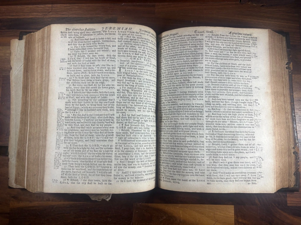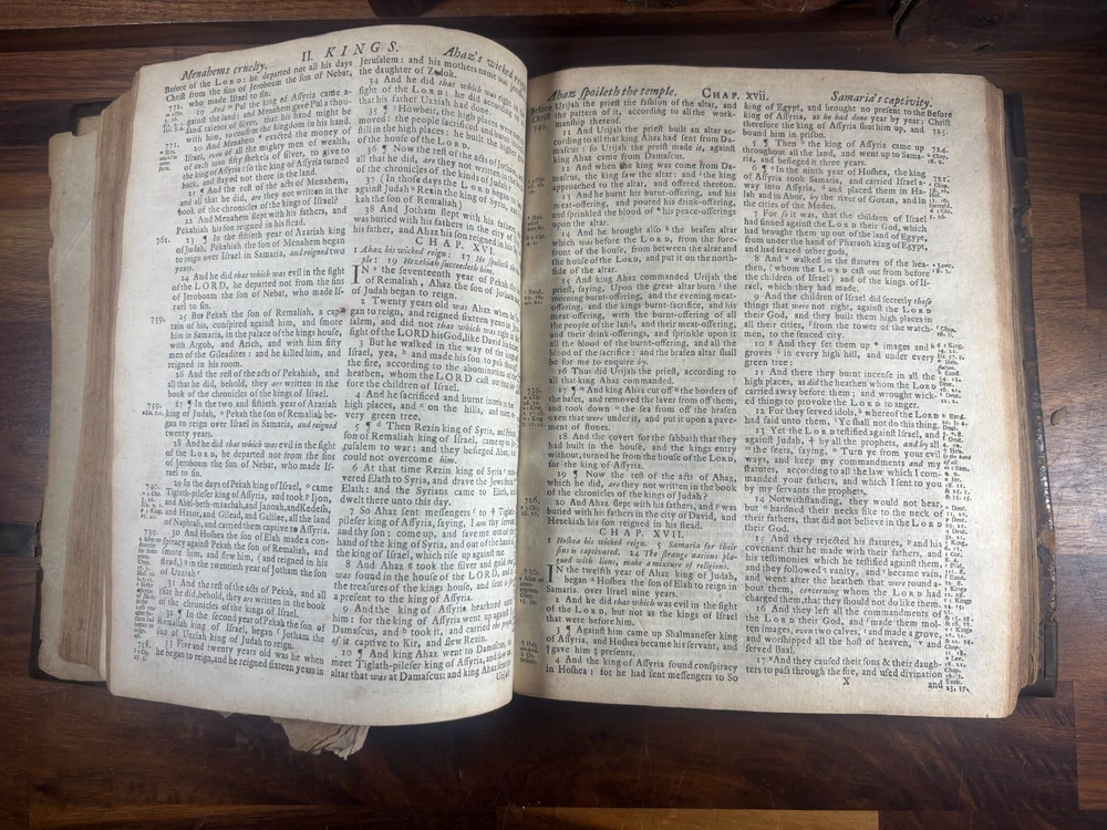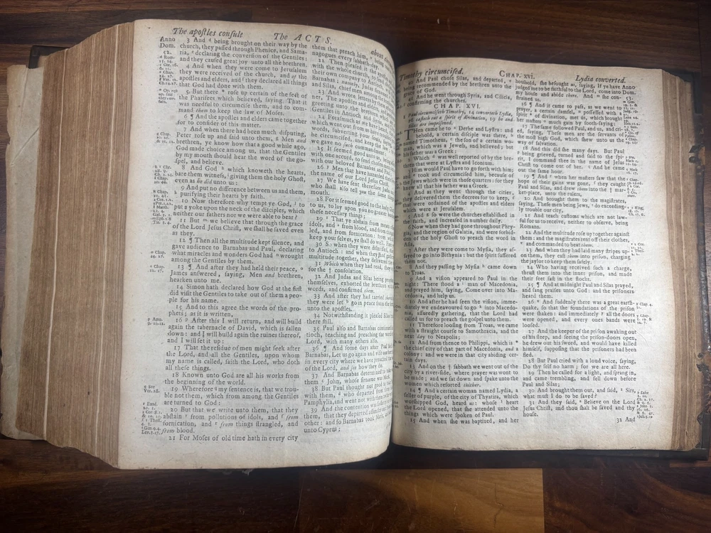 Short Description: This is an exceptionally rare 1714 King James Version Bible , printed in Edinburgh, Scotland by the notable royal printer James Watson , and catalogued as Herbert 930. This example retains its original early 18th-century leather binding with brass corner pieces and central boss , a feature seldom found intact. Of particular significance is the armorial bookplate of Colonel & Mrs. Forbes-Leith of Whitehaugh , a distinguished Scottish noble family. This firmly establishes historical provenance and adds meaningful collector value. Bibliographic Details Title: The Holy Bible Containing the Old Testament and the New Translation: King James Version Printer: James Watson , Printer to the Queen’s Most Excellent Majesty Place: Edinburgh Date: 1714 Reference: Herbert 930 Format: Quarto Binding: Contemporary paneled calf over boards with elaborate blind tooling and original brass corner bosses, central lozenge and original latches. Provenance: Armorial bookplate — Colonel & Mrs. Forbes Leith, of Whitehaugh Condition: (Please see above photos for more information on condition) Original binding. Text block complete pages age-toned but clean and legible. Evidence of careful historical use but no modern restoration. Some foxing and staining. Front cover is weak where it connects to the spine. All original metal working and tooled cover. 1 loose leaf that contains an inscription: These Bibls be longes to John he hath anthor of Montgomery Bourly of Bissop Tibborne Phillippes and som[t]hinge Coome Hadson perfect som by–layinge frends An outstanding example of an early Scottish-printed Bible in period binding with aristocratic pedigree. Historical Context: Britain & Scotland in 1714 The year 1714 was one of the most pivotal in British history. Queen Anne died that year, bringing an end to the Stuart monarchy and ushering in the Hanoverian era with King George I . Scotland was still adjusting to the Act of Union (1707) , and Jacobite sentiment simmered beneath the surface, soon erupting in the 1715 Jacobite Rising . Printed in this atmosphere of political tension and religious importance, this Bible represents a crucial moment in British and Scottish history—a nation transitioning between dynasties and identities. About the Printer: James Watson (d. 1722) James Watson is widely regarded as one of Scotland’s most important early printers. As Printer to the Queen , he was responsible for producing official and ecclesiastical works, including Bibles, statutes, and theological texts. Watson: Improved the quality of Scottish printing, which had lagged behind England Published influential works on the art of printing itself Ran one of the few presses capable of producing large-format Bibles in Scotland His 1714 Bible (Herbert 930) is considered one of the better-executed Scottish Bibles of the early 18th century and is relatively scarce compared to London and Oxford printings. Provenance: The Forbes-Leith Family of Whitehaugh The armorial bookplate inside this Bible belongs to Colonel John Leith Forbes-Leith (1820–1888) and his wife, prominent members of an old Aberdeenshire noble lineage. The Forbes-Leith family: Descended from Clan Forbes , one of Scotland’s historic highland families Held estates at Whitehaugh and were later associated with Fyvie Castle Served in military and civic leadership roles throughout the 18th–19th centuries Used supporters, mottoes, and heraldic devices seen in the bookplate (stags, mascles, bear heads, etc.) The bookplate motto “Laus Per Christum” (“Praise through Christ”) and the distinctive heraldic shield confirm this lineage. Owning a family Bible from such a household adds cultural and genealogical importance far beyond its bibliographic rarity. Dimensions: Weight - 1.63KG Height - 23.5cm Width - 19cm Thickness - 6.5cm