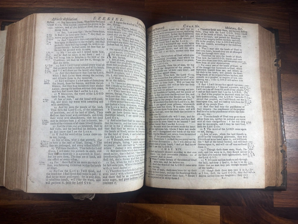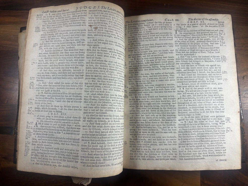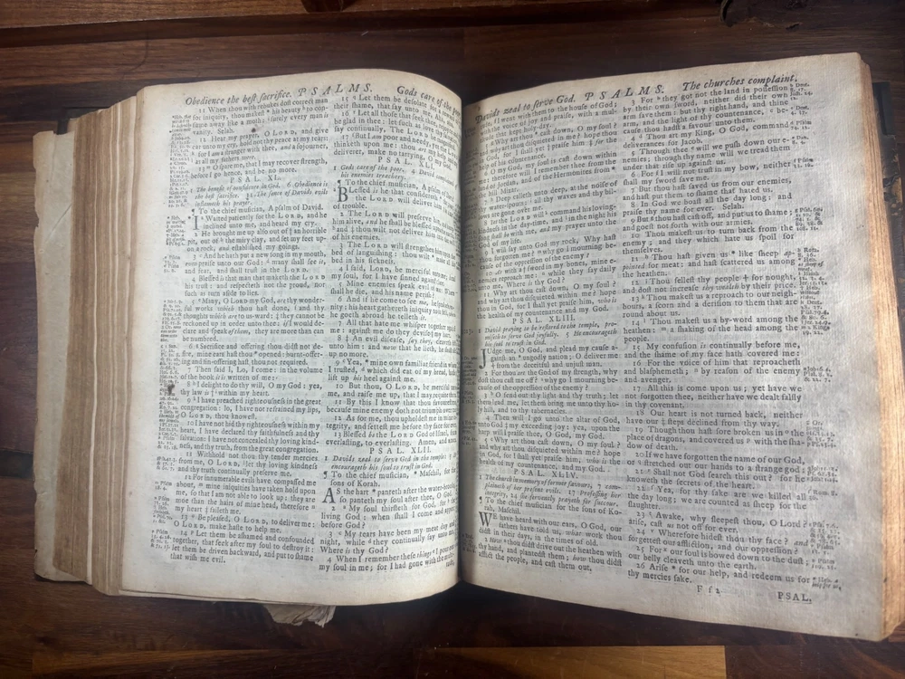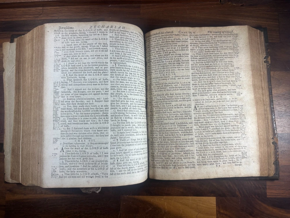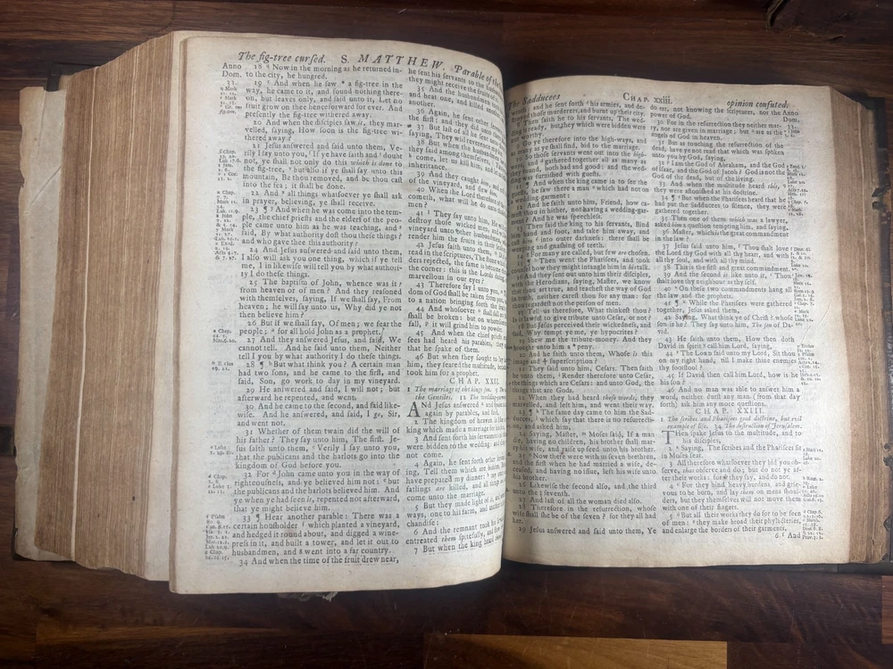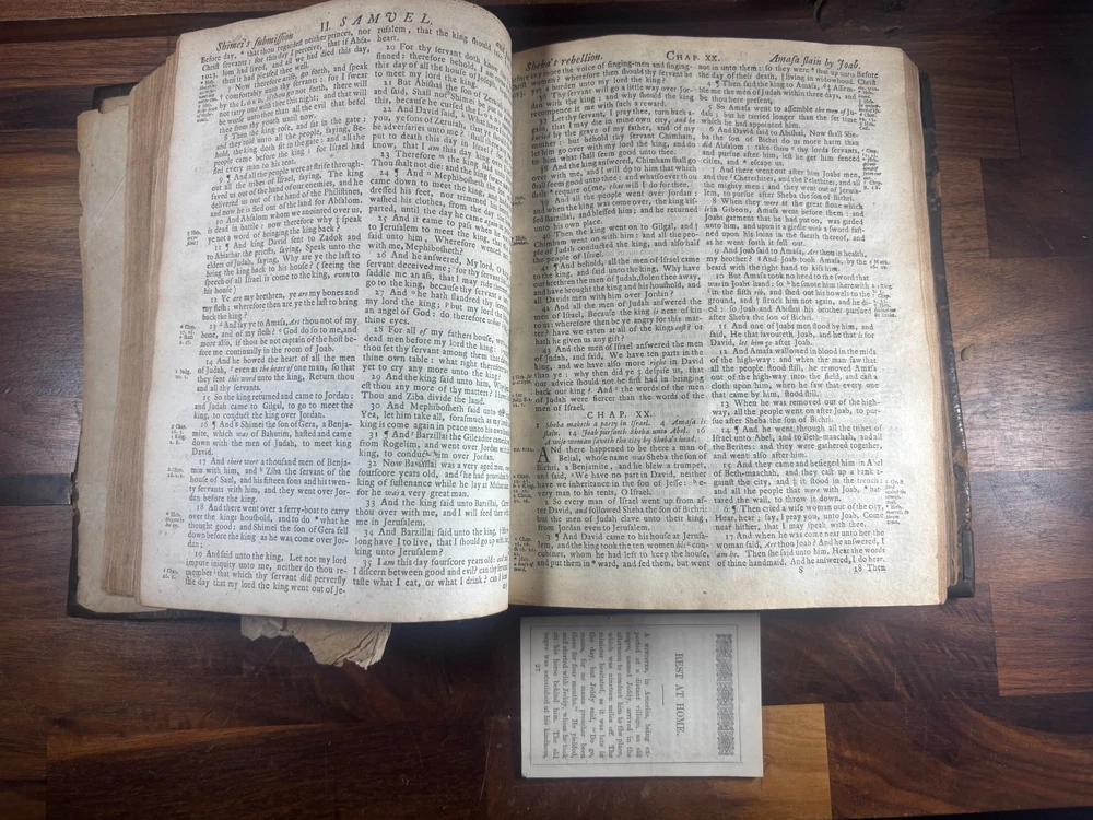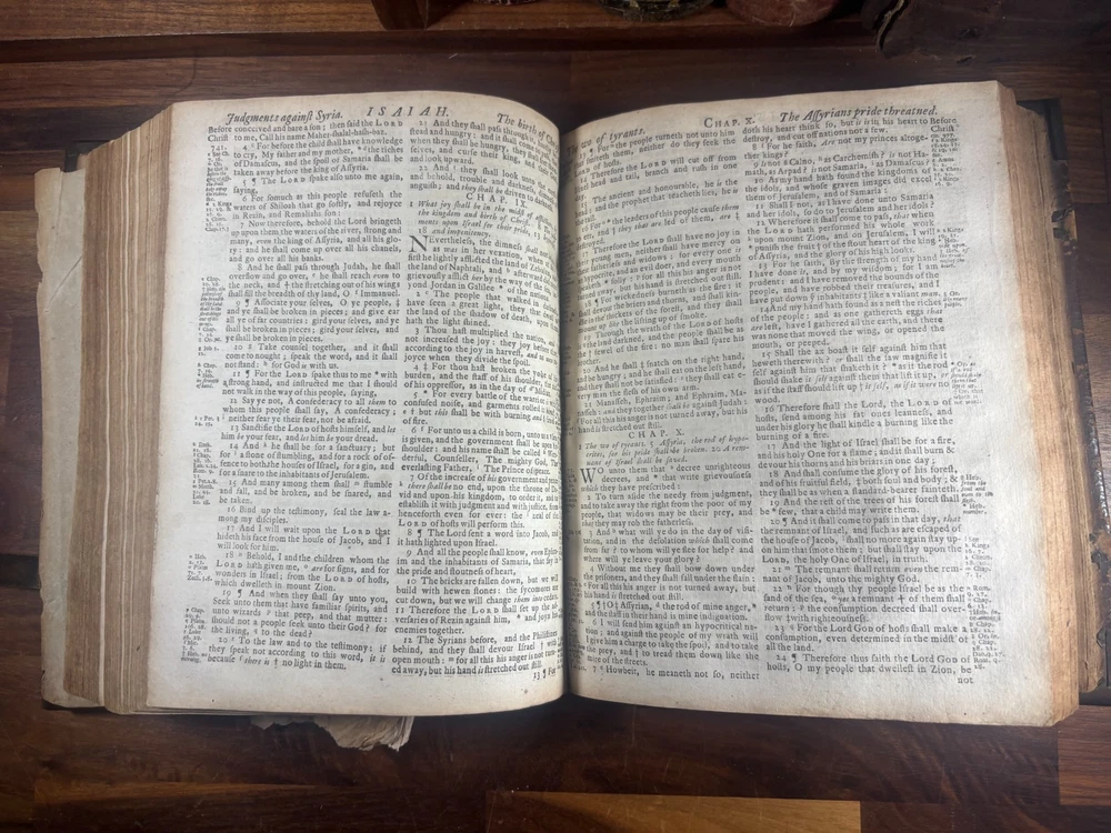 Short Description: This is an exceptionally rare 1714 King James Version Bible , printed in Edinburgh, Scotland by the notable royal printer James Watson , and catalogued as Herbert 930. This example retains its original early 18th-century leather binding with brass corner pieces and central boss , a feature seldom found intact. Of particular significance is the armorial bookplate of Colonel & Mrs. Forbes-Leith of Whitehaugh , a distinguished Scottish noble family. This firmly establishes historical provenance and adds meaningful collector value. Bibliographic Details Title: The Holy Bible Containing the Old Testament and the New Translation: King James Version Printer: James Watson , Printer to the Queen’s Most Excellent Majesty Place: Edinburgh Date: 1714 Reference: Herbert 930 Format: Quarto Binding: Contemporary paneled calf over boards with elaborate blind tooling and original brass corner bosses, central lozenge and original latches. Provenance: Armorial bookplate — Colonel & Mrs. Forbes Leith, of Whitehaugh Condition: (Please see above photos for more information on condition) Original binding. Text block complete pages age-toned but clean and legible. Evidence of careful historical use but no modern restoration. Some foxing and staining. Front cover is weak where it connects to the spine. All original metal working and tooled cover. 1 loose leaf that contains an inscription: These Bibls be longes to John he hath anthor of Montgomery Bourly of Bissop Tibborne Phillippes and som[t]hinge Coome Hadson perfect som by–layinge frends An outstanding example of an early Scottish-printed Bible in period binding with aristocratic pedigree. Historical Context: Britain & Scotland in 1714 The year 1714 was one of the most pivotal in British history. Queen Anne died that year, bringing an end to the Stuart monarchy and ushering in the Hanoverian era with King George I . Scotland was still adjusting to the Act of Union (1707) , and Jacobite sentiment simmered beneath the surface, soon erupting in the 1715 Jacobite Rising . Printed in this atmosphere of political tension and religious importance, this Bible represents a crucial moment in British and Scottish history—a nation transitioning between dynasties and identities. About the Printer: James Watson (d. 1722) James Watson is widely regarded as one of Scotland’s most important early printers. As Printer to the Queen , he was responsible for producing official and ecclesiastical works, including Bibles, statutes, and theological texts. Watson: Improved the quality of Scottish printing, which had lagged behind England Published influential works on the art of printing itself Ran one of the few presses capable of producing large-format Bibles in Scotland His 1714 Bible (Herbert 930) is considered one of the better-executed Scottish Bibles of the early 18th century and is relatively scarce compared to London and Oxford printings. Provenance: The Forbes-Leith Family of Whitehaugh The armorial bookplate inside this Bible belongs to Colonel John Leith Forbes-Leith (1820–1888) and his wife, prominent members of an old Aberdeenshire noble lineage. The Forbes-Leith family: Descended from Clan Forbes , one of Scotland’s historic highland families Held estates at Whitehaugh and were later associated with Fyvie Castle Served in military and civic leadership roles throughout the 18th–19th centuries Used supporters, mottoes, and heraldic devices seen in the bookplate (stags, mascles, bear heads, etc.) The bookplate motto “Laus Per Christum” (“Praise through Christ”) and the distinctive heraldic shield confirm this lineage. Owning a family Bible from such a household adds cultural and genealogical importance far beyond its bibliographic rarity. Dimensions: Weight - 1.63KG Height - 23.5cm Width - 19cm Thickness - 6.5cm