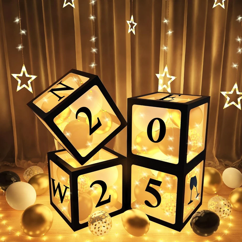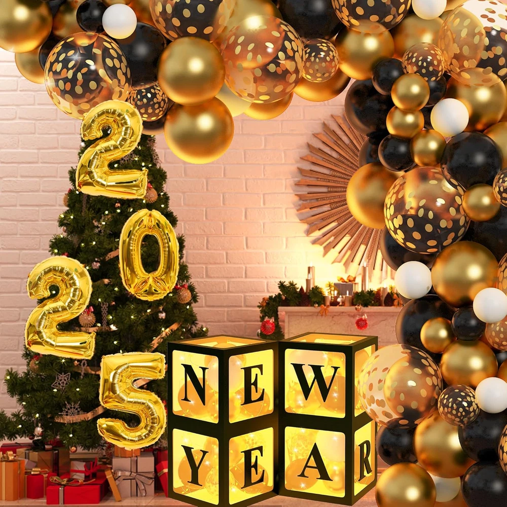 Rich and Reusable New Years decorations 2025: You’ll get 4pcs balloon boxes, 4pcs lights, 64pcs black letters(2sets) /number(0-9+2)/champagne stickers, 4Pcs 16" 2025 foil balloons, 20Pcs 12" 5" gold confetti balloons, 62Pcs 10" 5" black and gold balloons, 10Pcs 5" white balloons and 3pcs balloon tools Eternal Black and Gold Balloon Arch Kit: Decorate New Year eve party with beautiful black and gold balloons and balloon boxes, shine and glitter; With attractive New Years balloon arch kit 2025 as backdrop, create festive vibe for your glamorous pictures Gorgeous Party Decorations: Need unique 2025 New Years eve party supplies ; Don’t miss this; Put sizes of black and gold balloons into 4 balloon boxes to add relaxing vibe; Desired for office, classroom, home festival celebrations, warm and unforgettable Infinite DIY Fun: Our New Years decorations give you new experiences and various options; Letters and numbers can be combined together to form blessings; Easy to assemble; Lights can also be hung on the tree, wall, window, door to create unique nye party Decent Quality: Our balloon boxes are made of great-quality and transparent plastic; New Years balloons is also made of thick latex, not easy to break; All these nye decorations 2025 add luxurious vibe; Farewell 2024; Brighten and welcome your 2025 Product Description