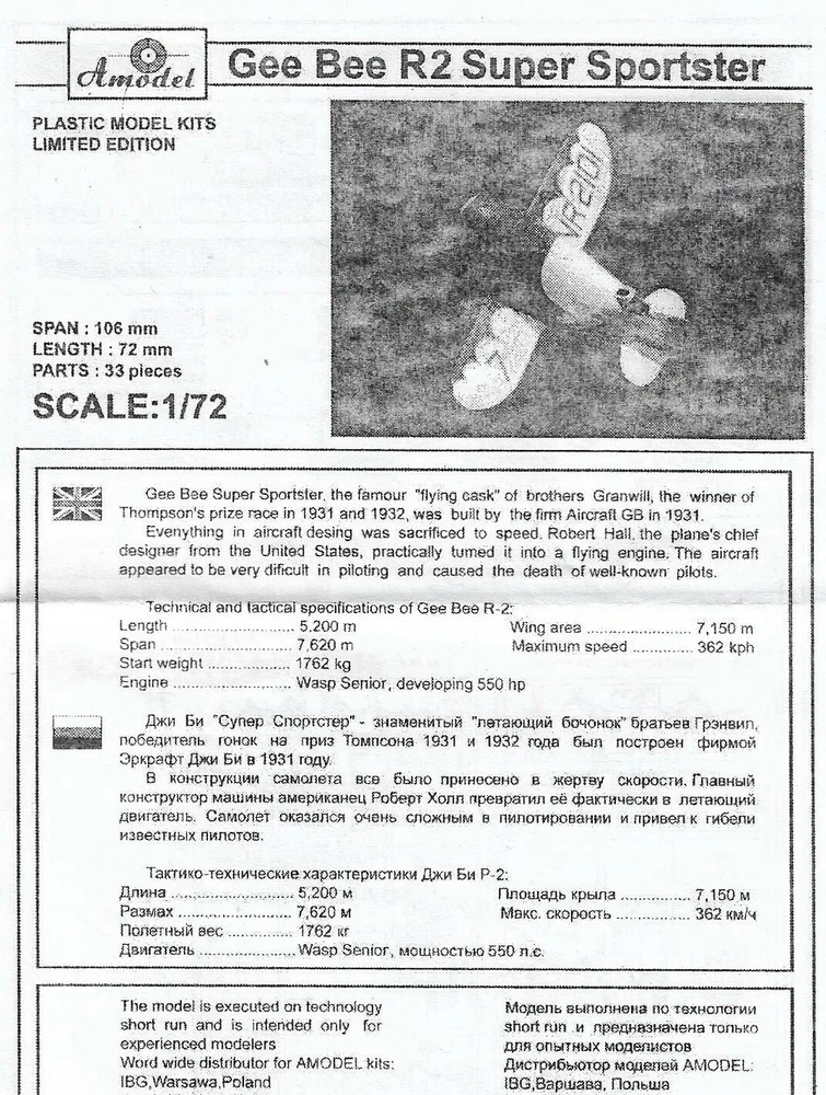 Plastic model kit High-quality details. Scale: 1:72 High-quality details. Manufacturer: AMODEL (Ukraine) Country/Region of Manufacture: Ukraine Composition: Plastic Model Kit Material: Plastic Paint: Unpainted, Unassembled, Kit do not contain paints and glue. Condition: New in Box Features: Kit Airplane scale model Model length, mm: 72 The kit includes: 33 plastic parts decal (sticker) 1 frame is made of transparent plastic (cabin lamp) scheme for coloring the model detailed instructions in English and Russian Glue, paint not included GB 'Super Sportster', the famous 'flying cask' of brothers Granwill, the winner of Thompson's prize race in 1931 and 1932, was built by the firm Aircraft GB in 1931. Everything in aircraft's design was sacrificed to speed. Robert Hall, the plane's chief designer from the US, practically turned it into a flying engine. The aircraft appeared to be very difficult in piloting and caused the death of many well-known pilots. Quality set, simple assembly. Suitable for experienced modelers, as well as for beginners. Due to the use of modern production technologies, all the details of the model fit perfectly, thanks to this, you can get an excellent result with minimal effort. ----------- This is a plastic model kit. Assembly and painting is required. Paint and glue is NOT included. Item Type: Scale model kit Commodity Attribute: Assembly The model is a plastic assembly model and needs to be assembled and painted by yourself You need an extra purchase of the glue, paint and so on!