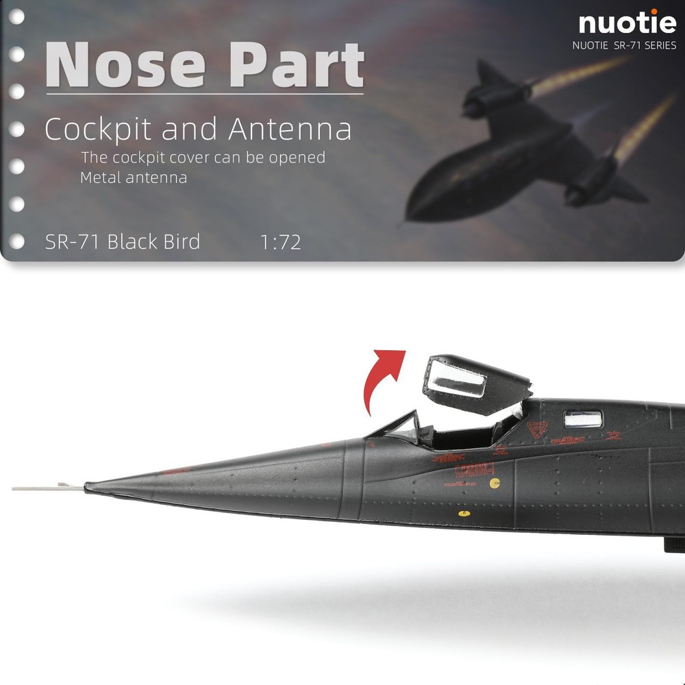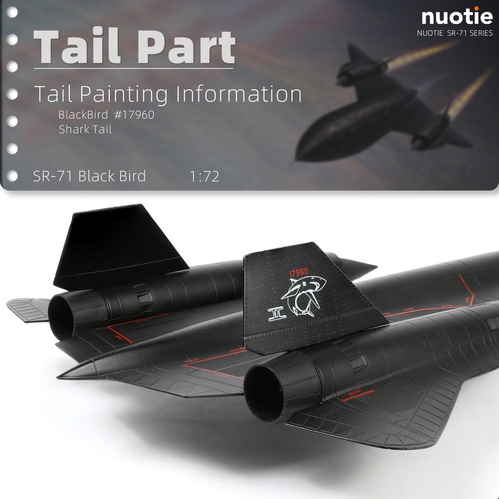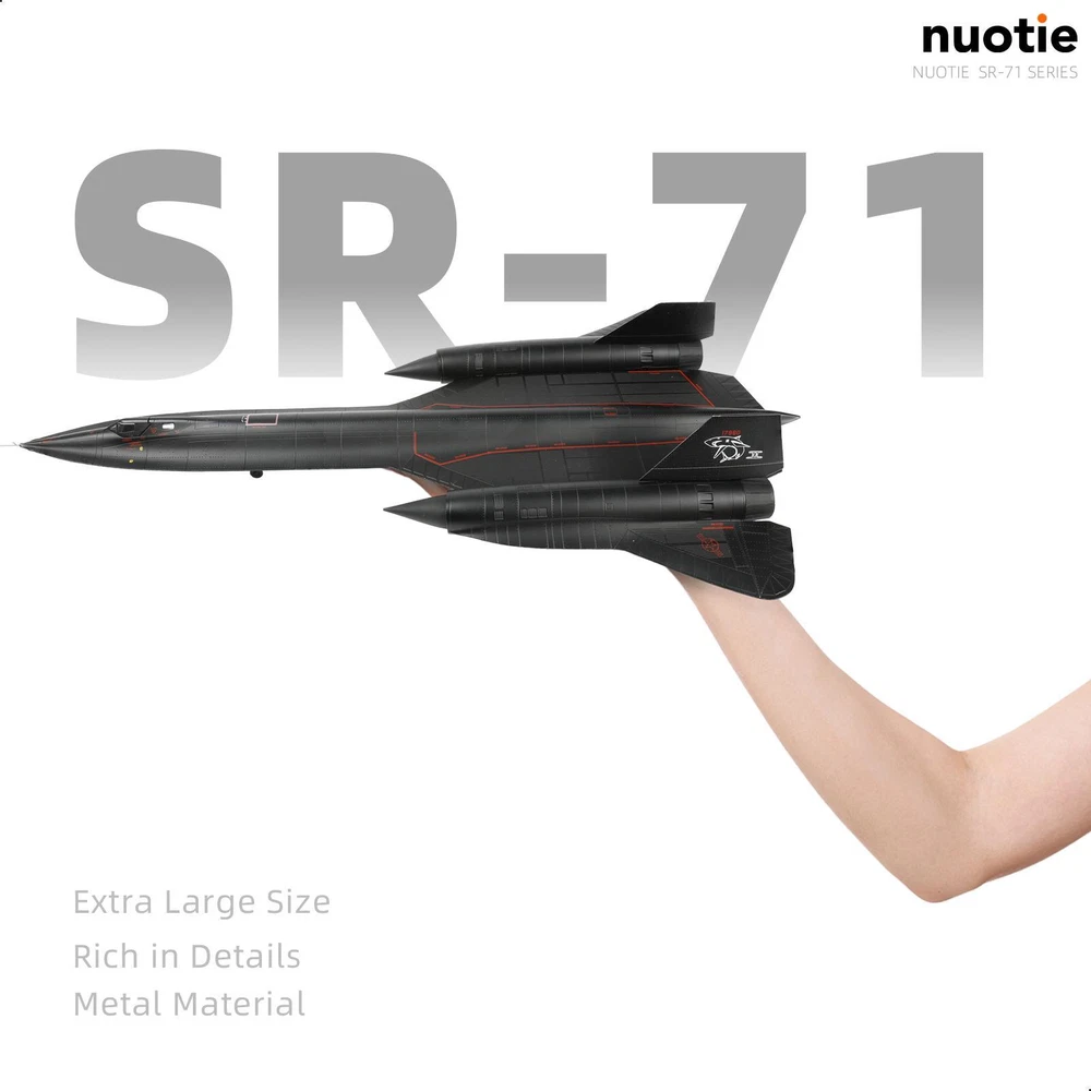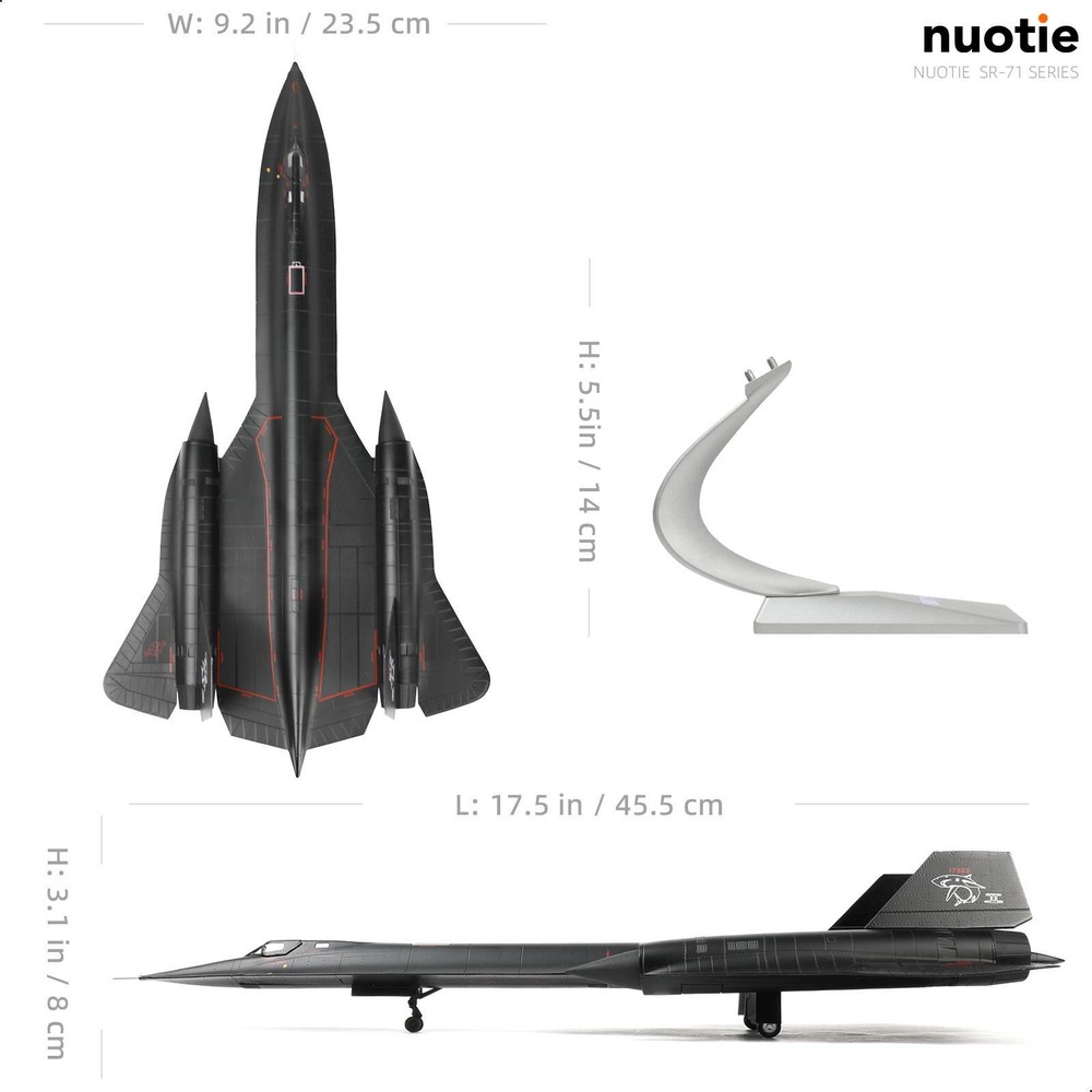 About this item 【SR-71A Blackbird 】- The first test flight of the SR-71A Blackbird prototype took place at USAF Plant 92 in Palmdale, California, on December 22, 1964, piloted by Bob Gilliland.The aircraft, serial number 17960, is currently on display at the Castle Aviation Museum at the former Castle Air Force Base in Atwater, California.The NUOTIE fighter model deeply restores the shape and posture of the original aircraft in terms of external details. 【Advanced Process and Technology】-The SR-71A Blackbird reconnaissance aircraft display model is flawlessly painted using industrial paint baking technology. It avoids the problem of oxidative cracking or fading of the product, and is durable. This military fighter jet model also has fine details, such as cockpit, wings, engines, weapons, etc., as well as clear painting and logos, accurate proportions, and smooth surfaces, which restore the appearance of real fighter jets. 【Product Specification】-The classic diecast aircraft model accurately restores the appearance and details of the real aircraft. The landing gear and vertical tail are detachable, and the wheels on the landing gear are rotatable. It takes two minutes to assemble, which is convenient and simple.The size of the fighter model is 17.9*9.25*3.15inches, the weight is 3.6 pounds, and the scale is 1/72. It is suitable for display or collection on a display cabinet or desk. 【Practical Packaging】-The 1/72 prebuilt airplane model comes with a metal bracket, which allows you to adjust the angle and height of the airplane, showing the flying attitude. It is also equipped with an exquisite packaging box to protect your model from damage during transportation. At the same time, this metal diecast fighter model is a high-quality collectible exclusively by NUOTIE, suitable for collection and gift giving. 【Worry-free Purchase】-We adhere to strict production requirements, control the product quality of model airplanes, and ensure that every customer gets satisfactory high-quality products. We take pride in offering a One-year warranty on this SR-71A Blackbird pre-build airplane model kits, ensuring your satisfaction and peace of mind. If you encounter any issues or have questions regarding your purchase, our dedicated customer support team is available resolve any concerns within 24 hours.