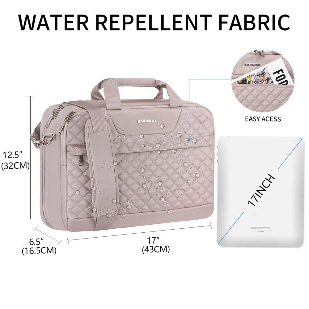 DURABLE & WATER REPELLENT: Made of durable waterproof nylon fabric that guarantees special long-term use. Waterproof fabric can protect your accessories from accidental damage. Fits perfectly underneath the airplane seat. Dimensions: 17"x12.5"x6.5" ; Weight: 1.98 lbs; MULTIPLE COMPARTMENTS: laptop briefcase has a large capacity with three compartments for almost all your daily needs, plus an extended zipper that provides more space to handle more carrying needs. The padded laptop compartment provides perfect protection for your 17" laptop from the bumps and bruises of travel. A large main compartment can hold books, files, mouse, chargers, and other office supplies. A front compartment provides easy access to badges, keys, cell phones and more. EASY TO CARRY: Adjustable "C" curve padded foam padded shoulder straps provide stability and even distribution of pressure. Sturdy handles ensure comfortable carrying for extended periods of time. Features a trolley strap that allows the bag to slide over rolling luggage, making business travel easier and more convenient. RFID POCKET: Inserting an electronic card into the RFID blocking pocket can stop theft and electronic pickpocketing and keep your information safe inside your briefcase. MULTI-PURPOSE: laptop bag is suitable for commuting, business trips, impromptu trips and road trips. Featuring a pink and quilted look, it can be a great gift for family, friends, partners and spouses if she is looking for a practical, high quality, professional business briefcase.
