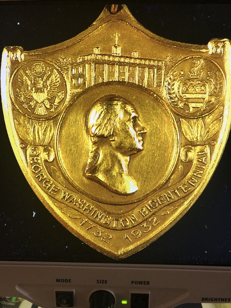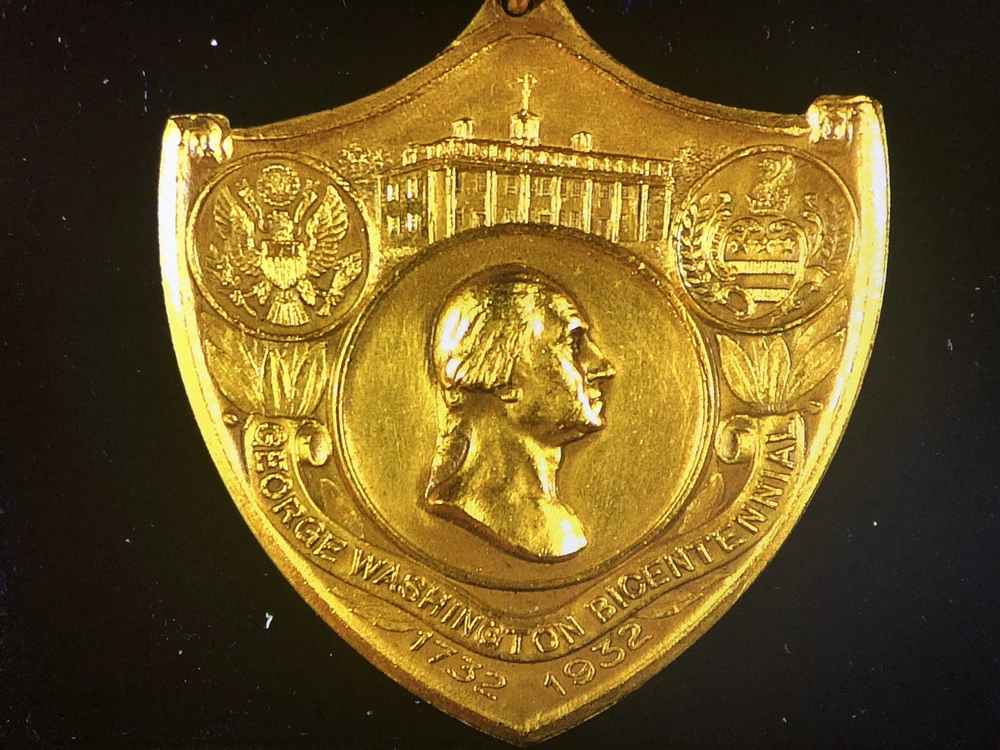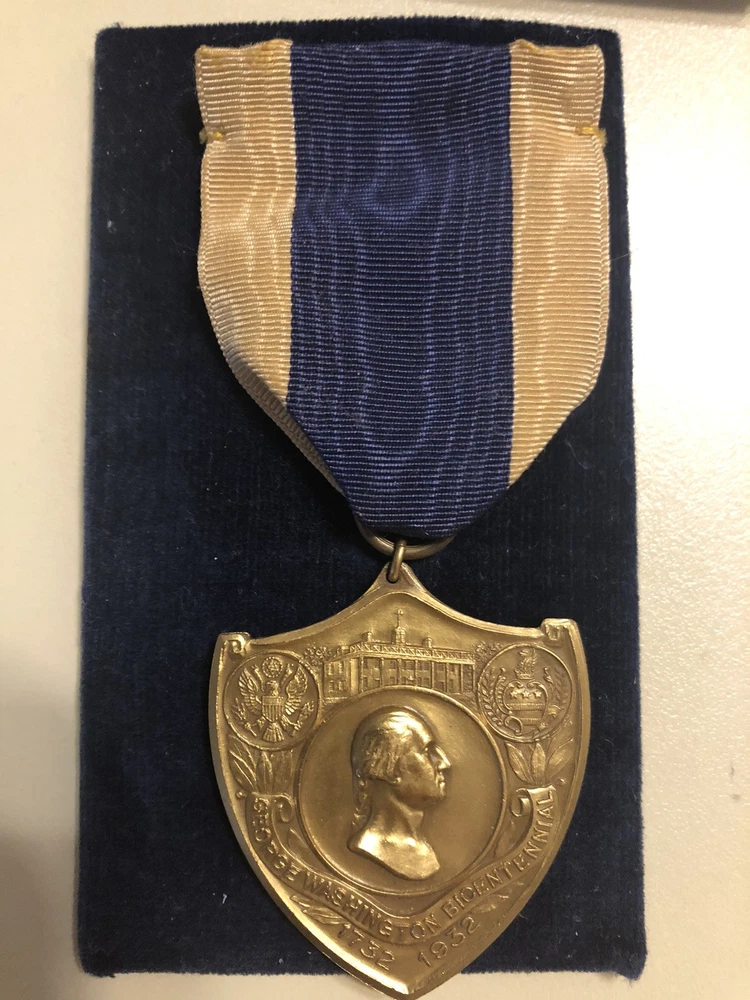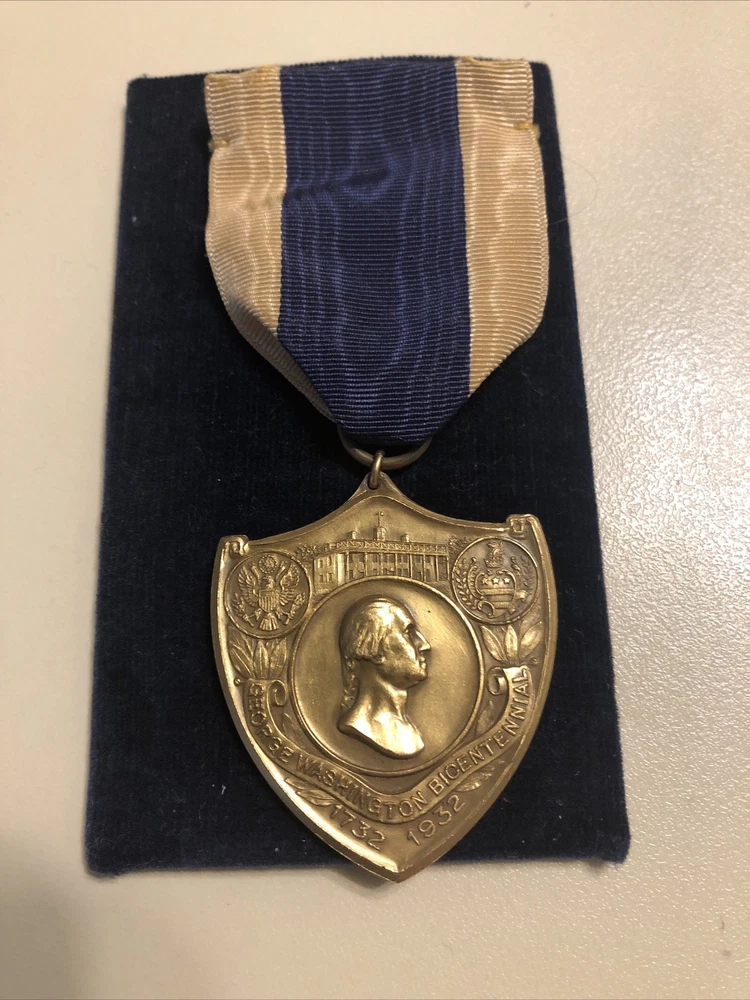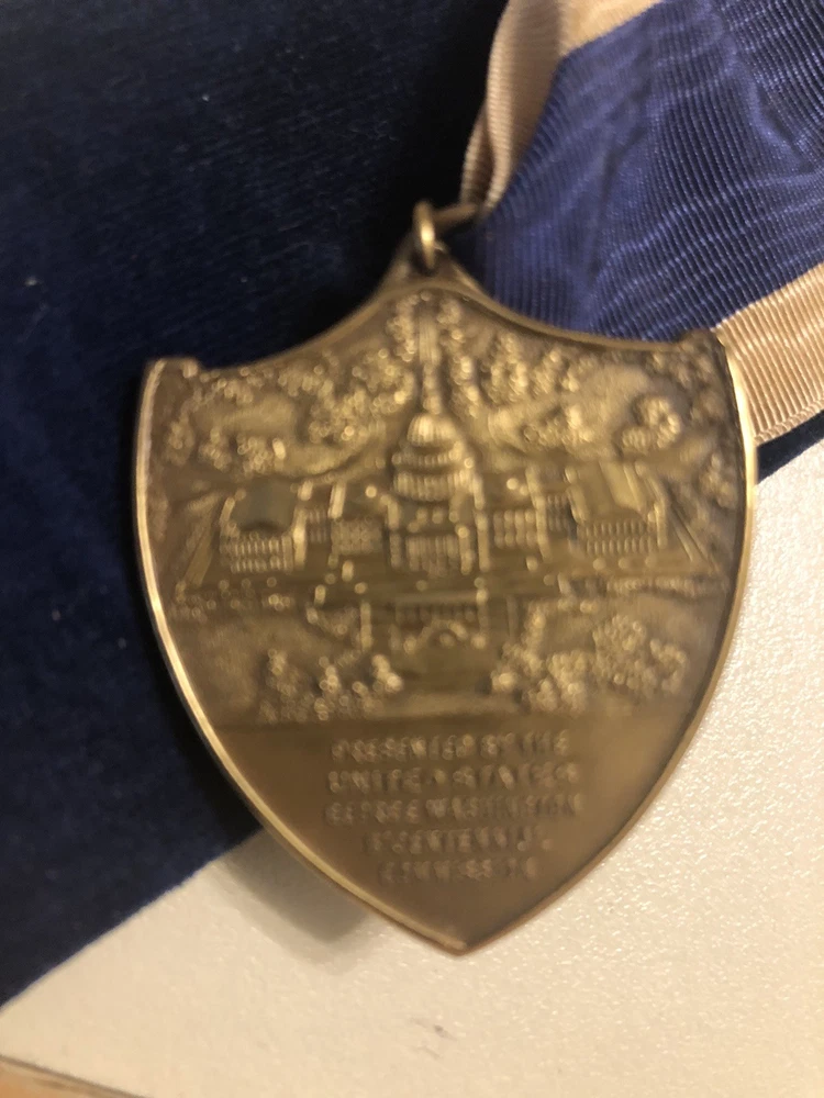 This is a 1732-1932 George Washington Bicentennial Medal with a personal letter that celebrates the 200th anniversary of Washington's presidency. The bronze medal, minted in the United States, is a rare and valuable collector's item. The inclusion of a personal letter adds a unique and historical element to the medal, making it a special piece for any numismatist or history enthusiast. These medals were issued in 1932 as part of the nationwide celebration of George Washington's bicentennial. The medal was presented by Wm. Tyler Page, clerk in the House of Representatives for many years. This is a truly rare piece that any museum would love to own.